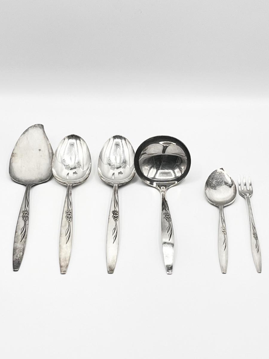 Silver plated ~ Includes = (8) dinner forks ~ (8) Salad forks ~ (8) Soup spoons ~ (8) butter knives ~ (6) Serving pieces see photos