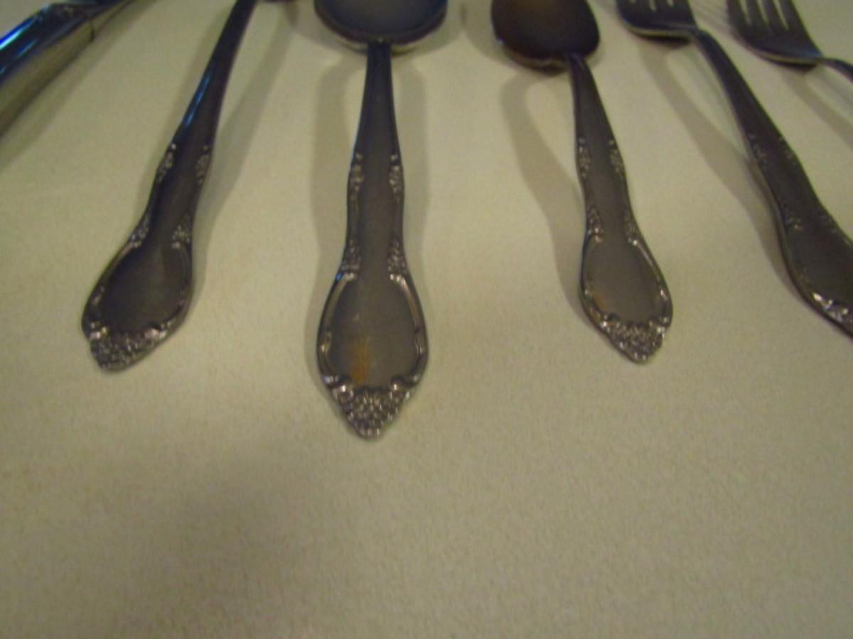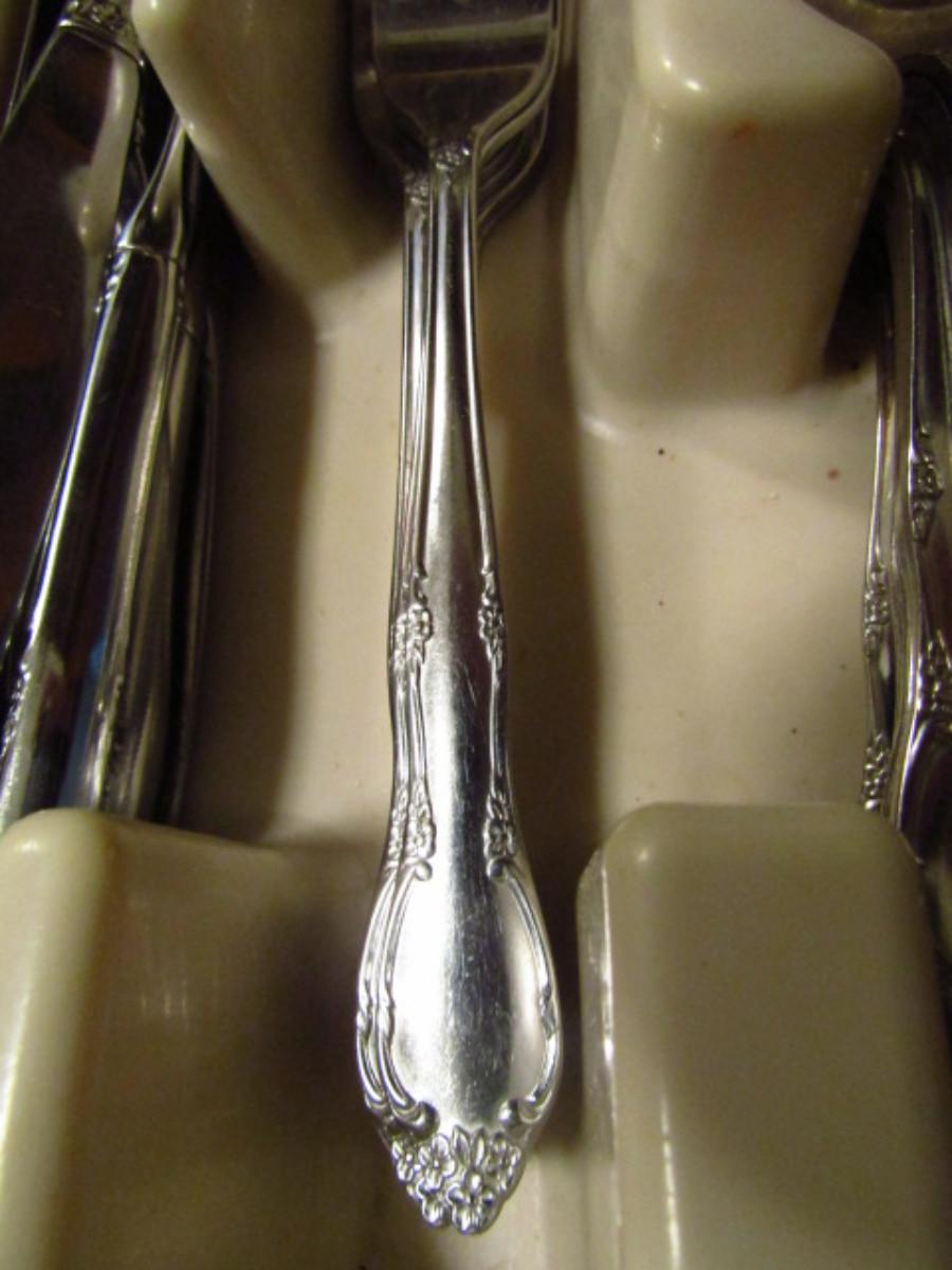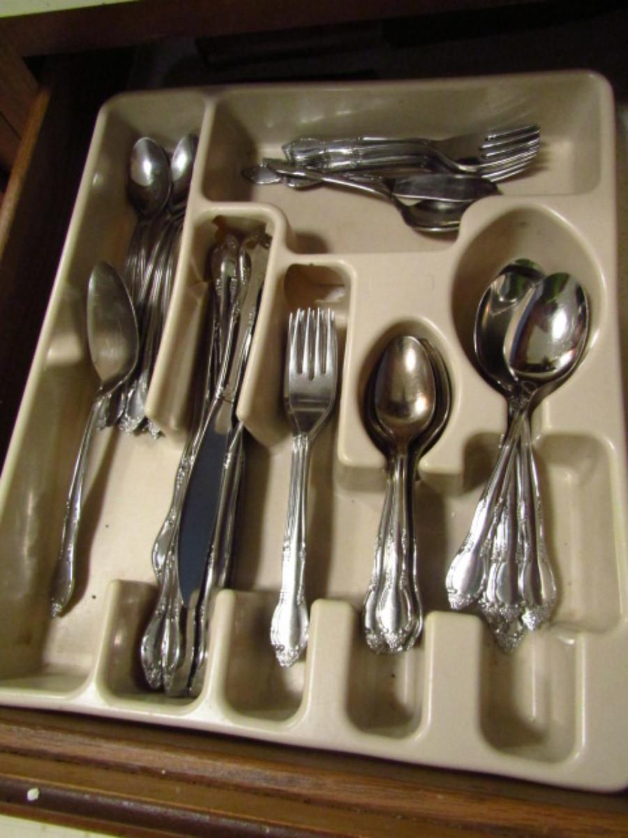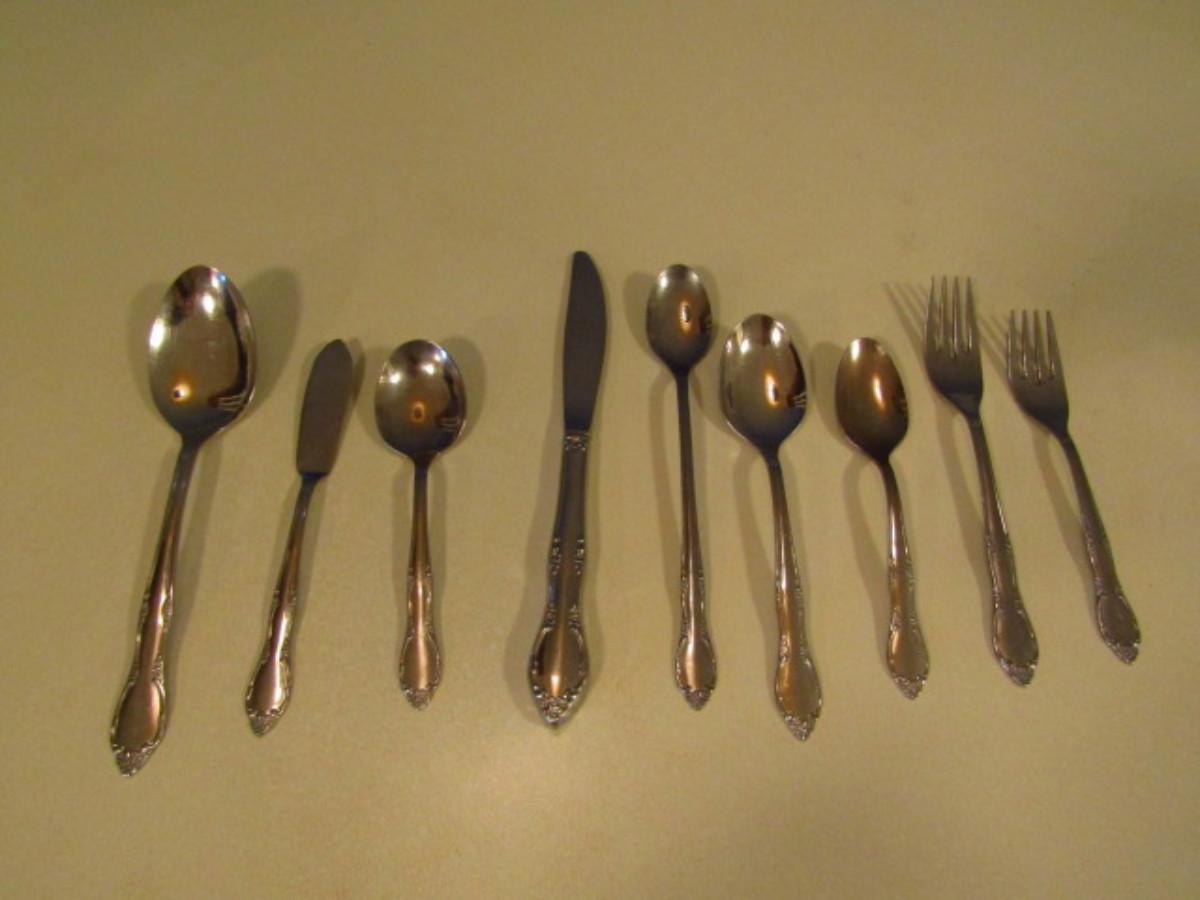 Oneida Flatware (Approx 51 Pcs). Knife- 8, Serving spoon- 2, Long spoon- 8, Regular spoon- 8, Large spoon- 8, Dinner fork- 8, Salad fork- 7, Sugar spoon- 1, Spreader- 1.