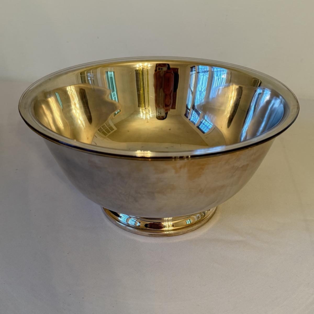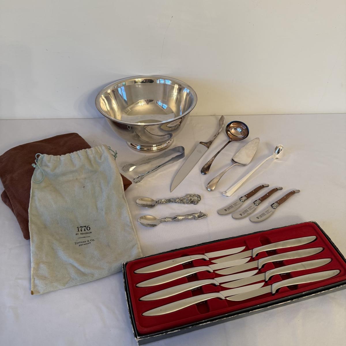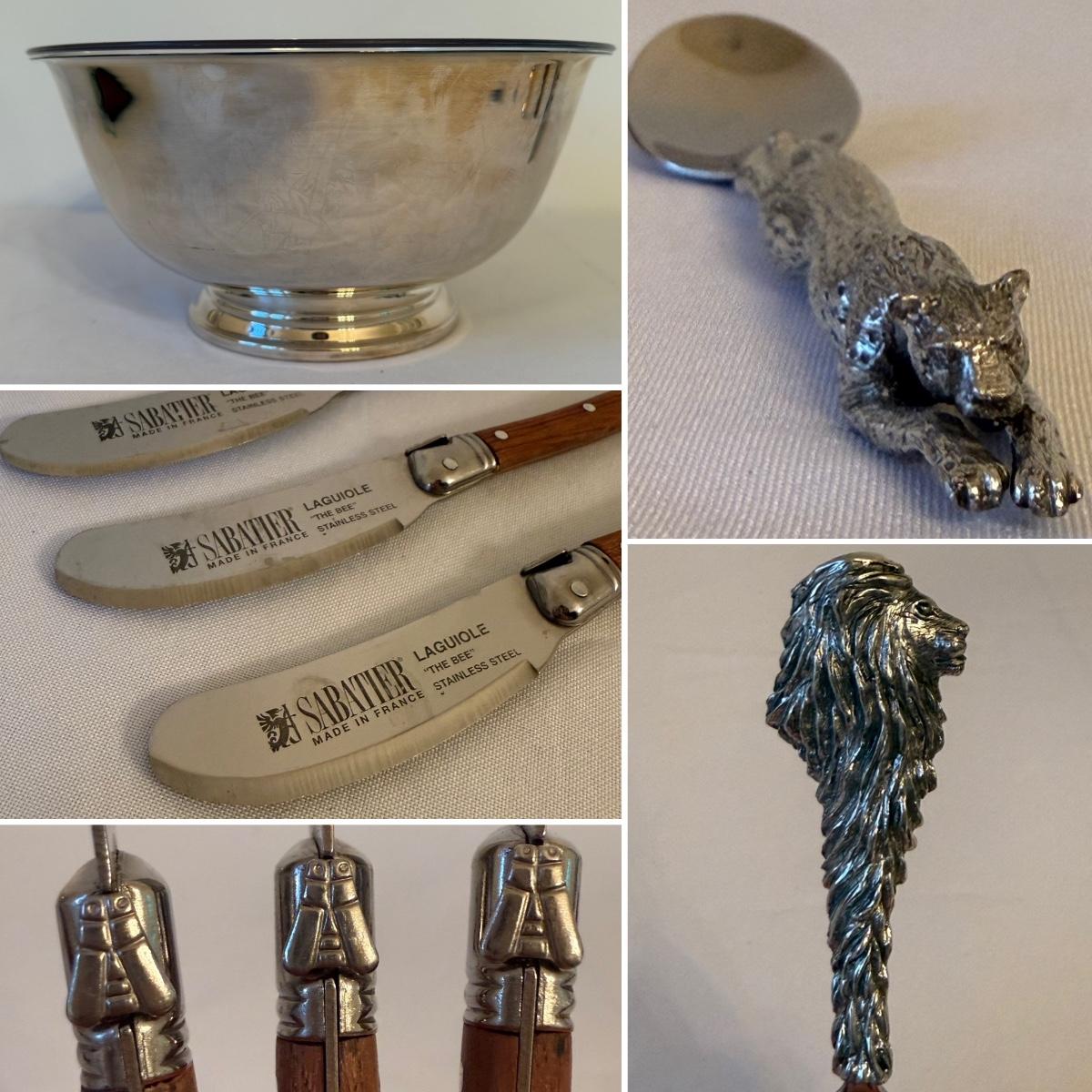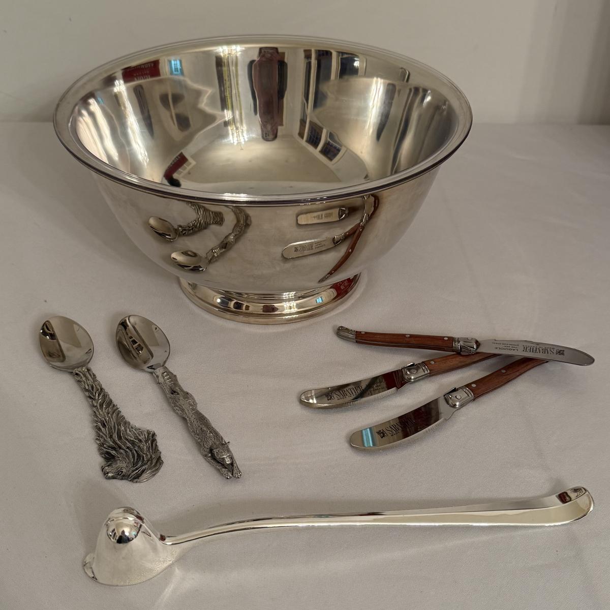 Lot includes a Oneida Paul Revere silverplate bowl, with a box set of Gerber knives, three Dansk serving utensils, three cheese knives, two fun decorative animal spoons and more. Bowl measures 10”D x 5”H. Dansk utensils are a bit tarnished.
