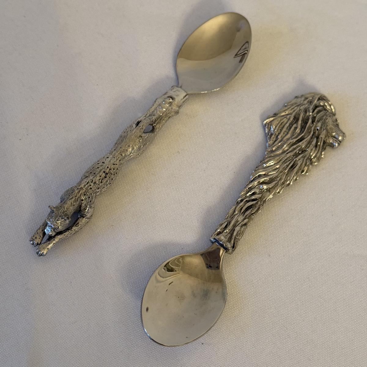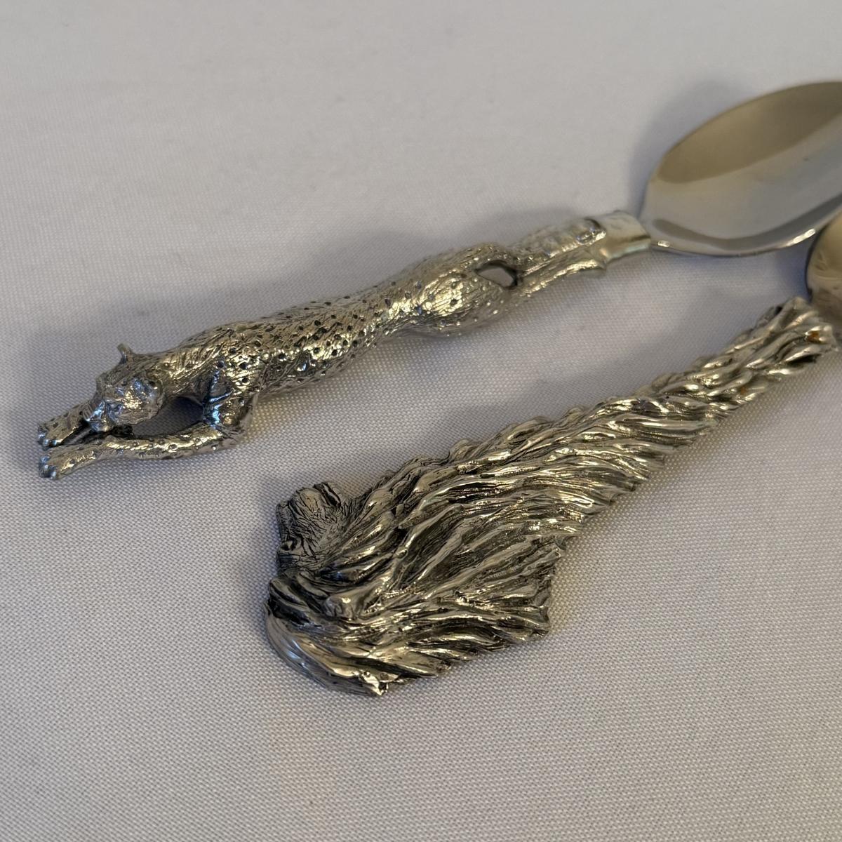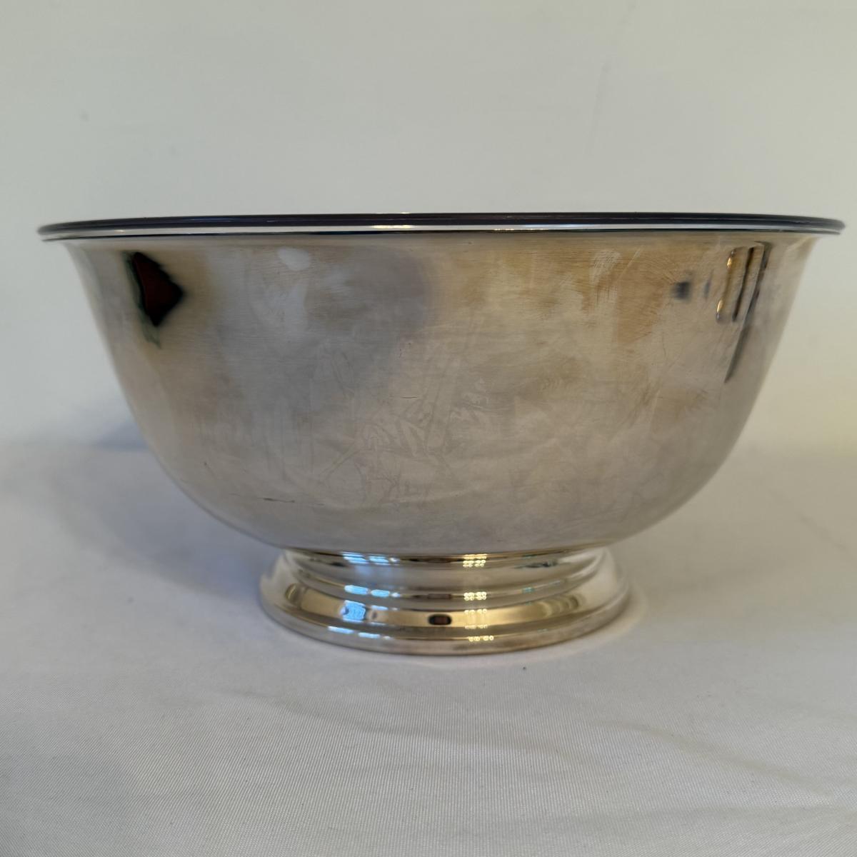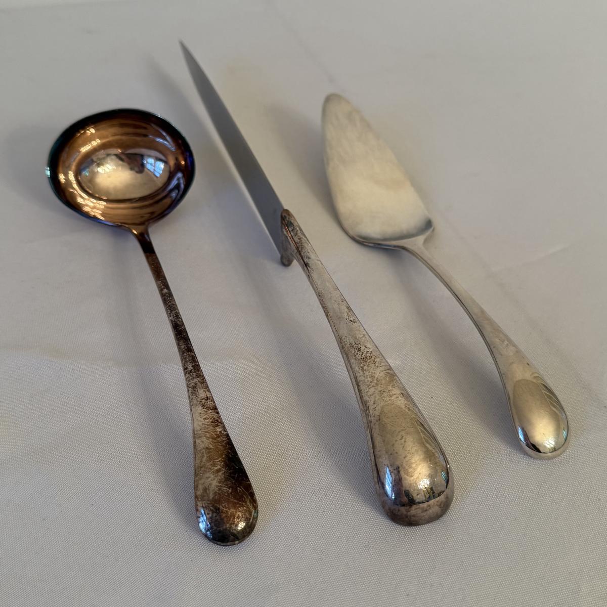 Lot includes a Oneida Paul Revere silverplate bowl, with a box set of Gerber knives, three Dansk serving utensils, three cheese knives, two fun decorative animal spoons and more. Bowl measures 10”D x 5”H. Dansk utensils are a bit tarnished.