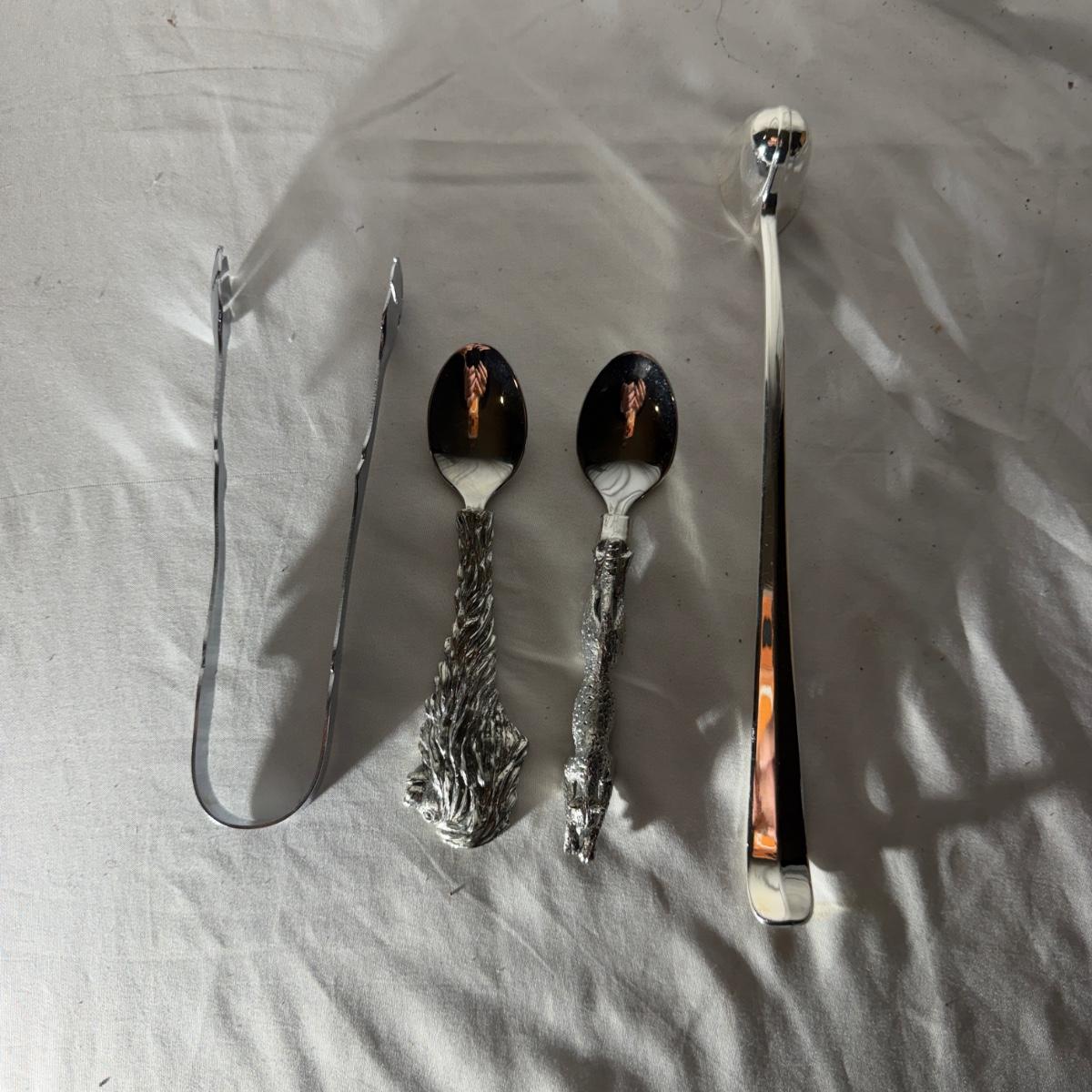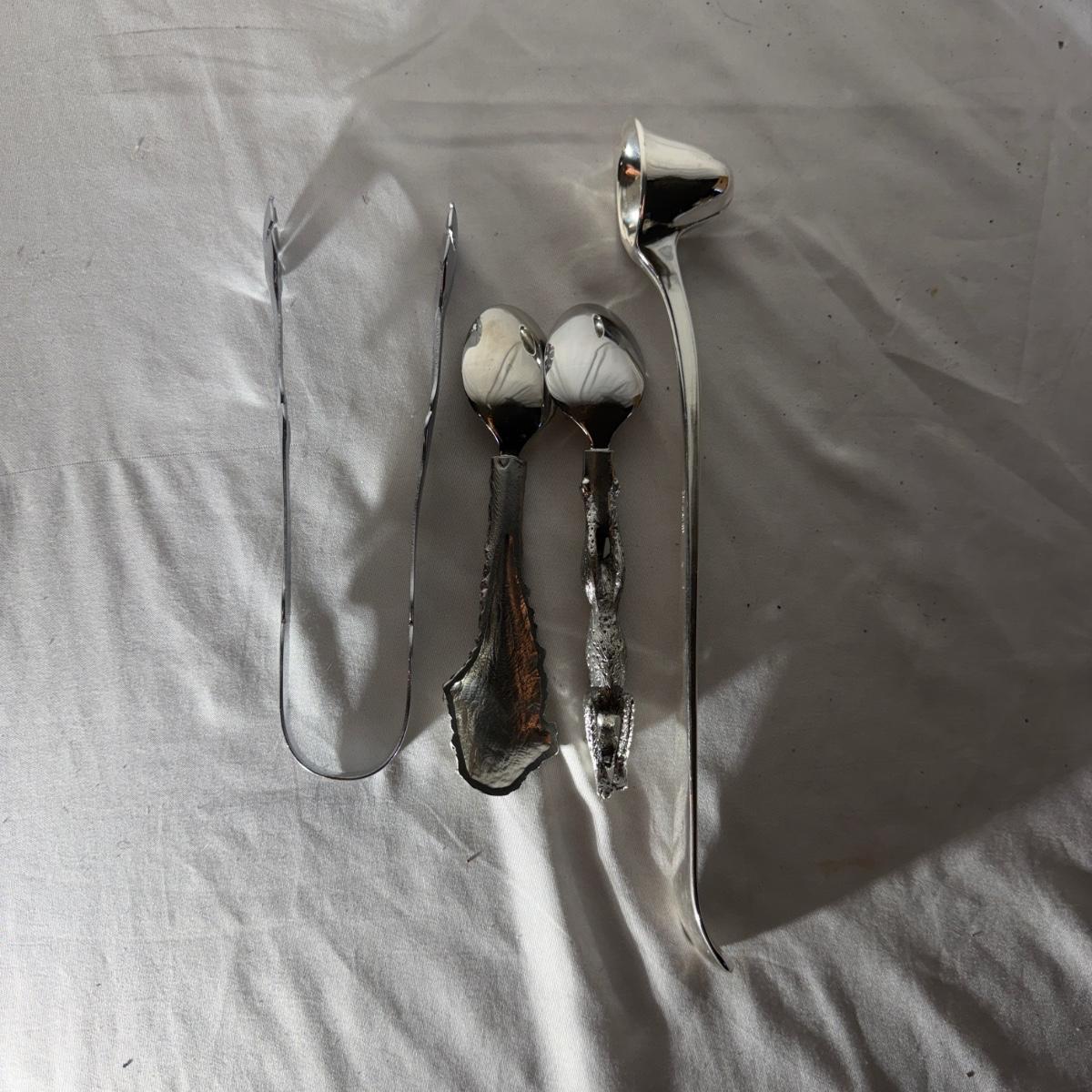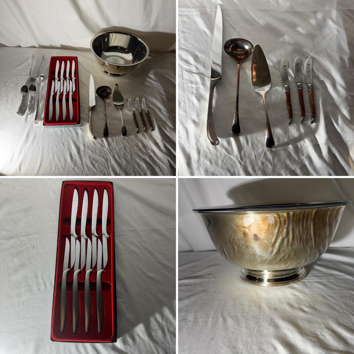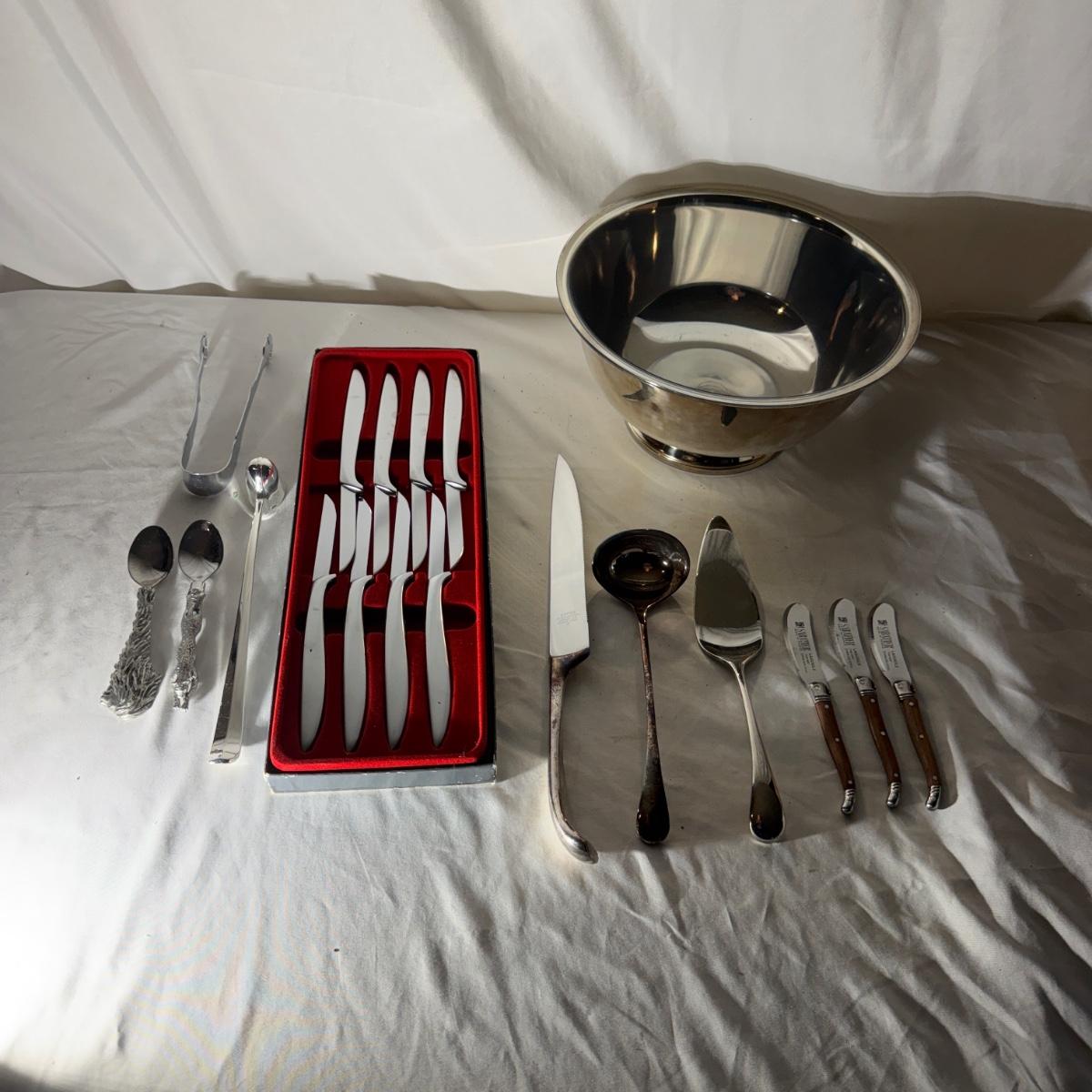 Lot includes a Oneida Paul Revere silverplate bowl, with Gerber knives, three Dansk serving utensils, three cheese knives, two decorative spoons and more.