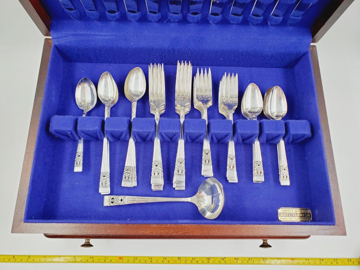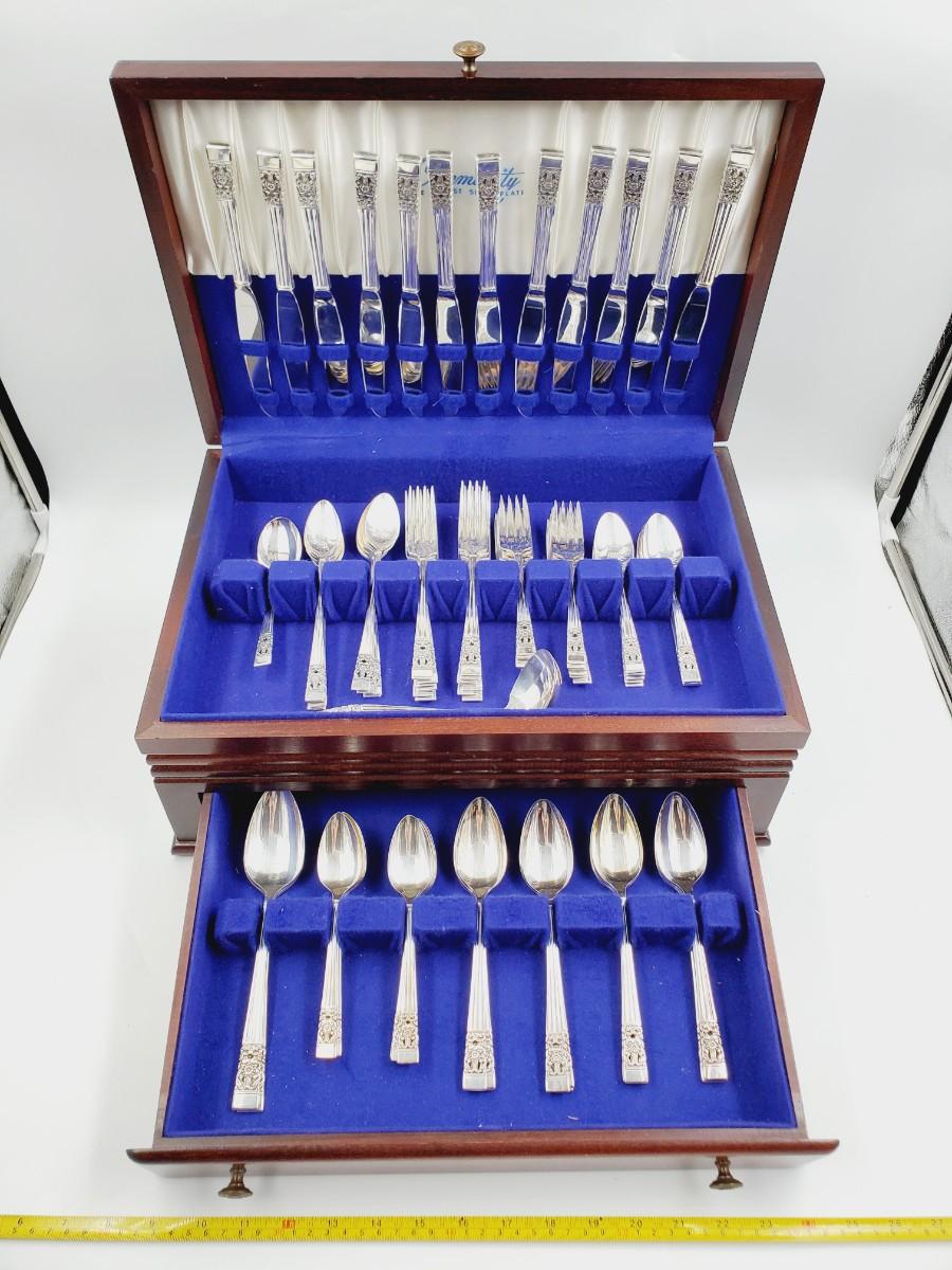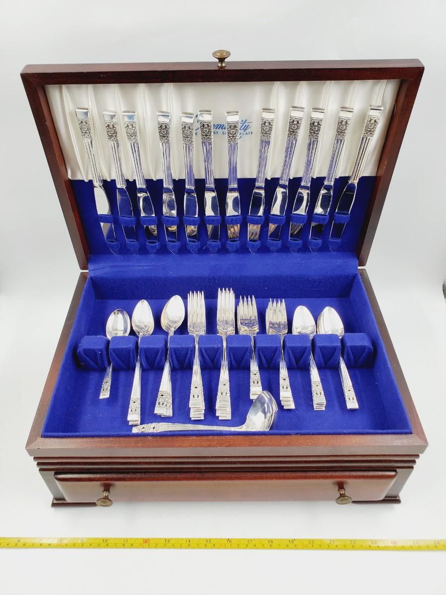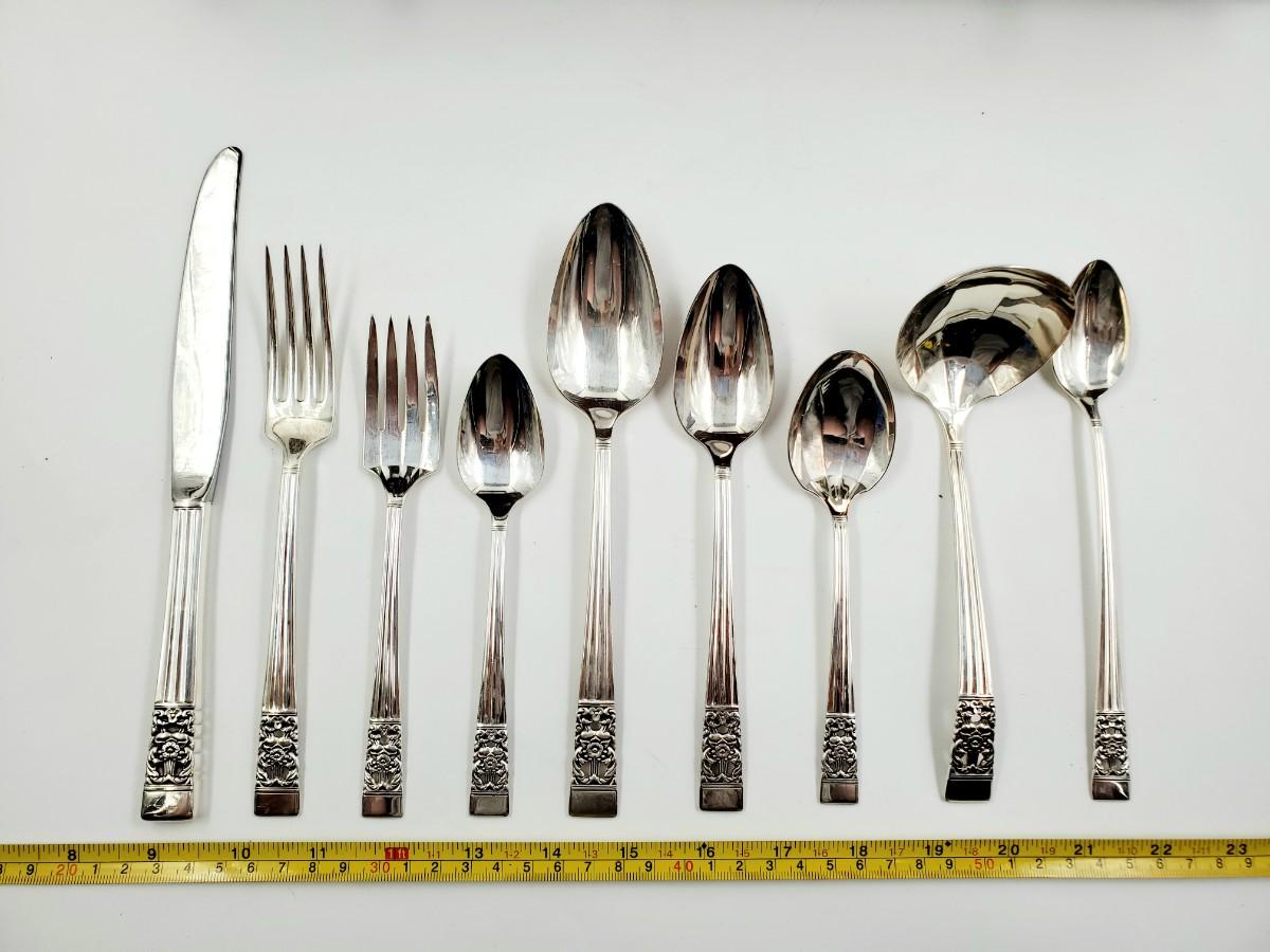 87 beautiful pieces of Oneida "Coronation" silver-plated silverware. All in good condition.