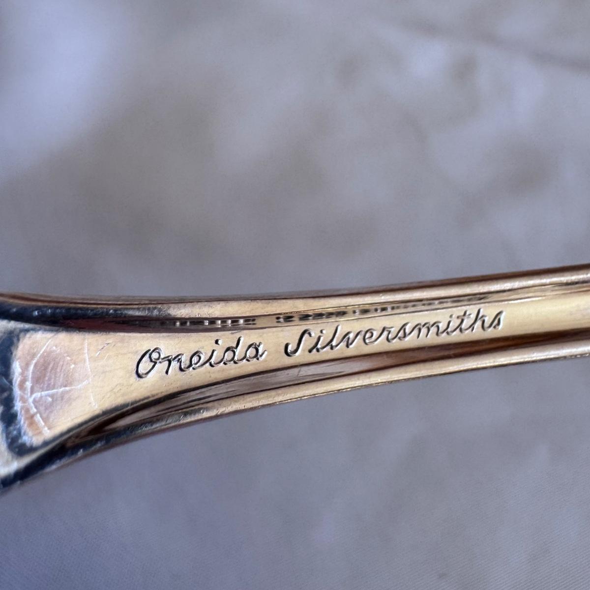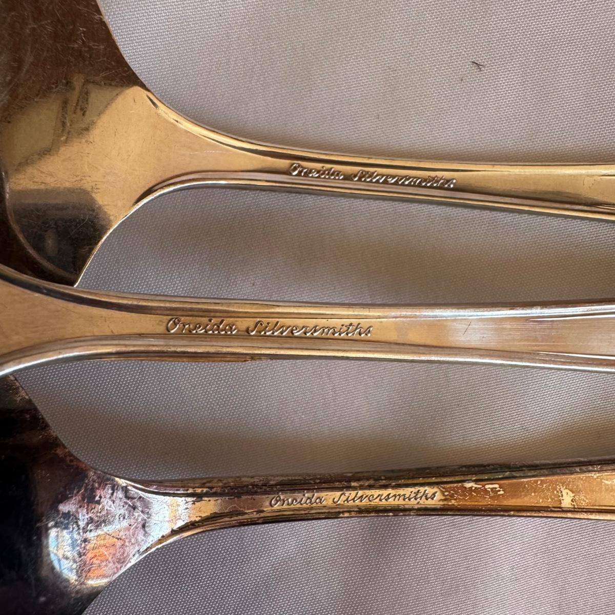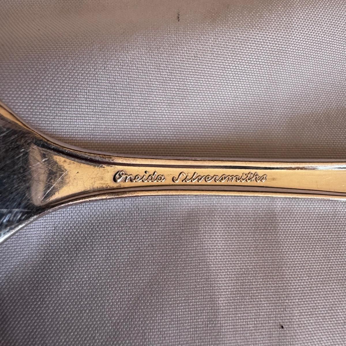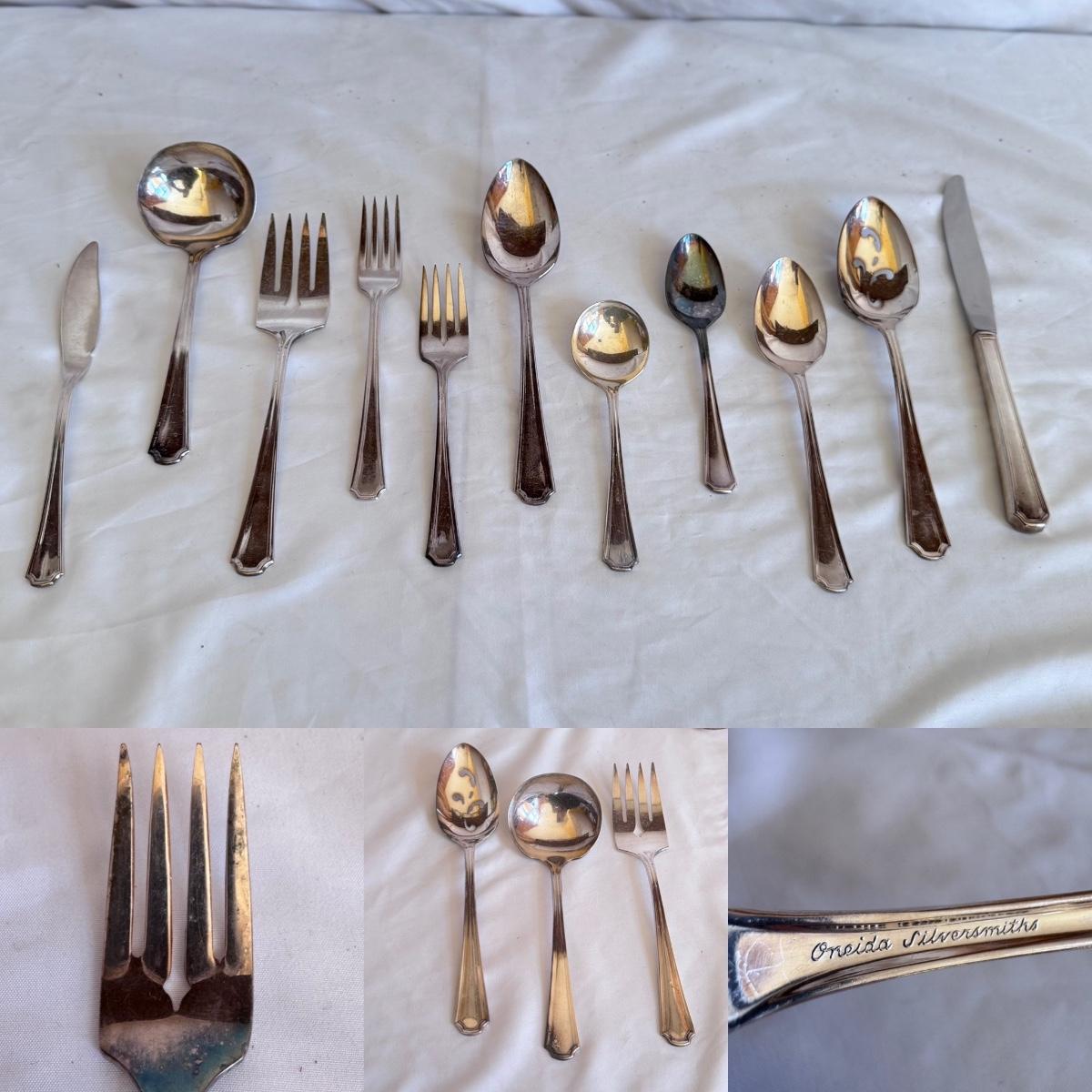This lot of Oneida flatware includes eight standard dinner forks, eight dinner knives, eight salad forks, nineteen spoons of various sizes, and three serving utensils. All have a bit of tarnish on them. The dinner knives are the only utensils not stamped, but they have an identical pattern. All appear to be silver plated. Shipping available.