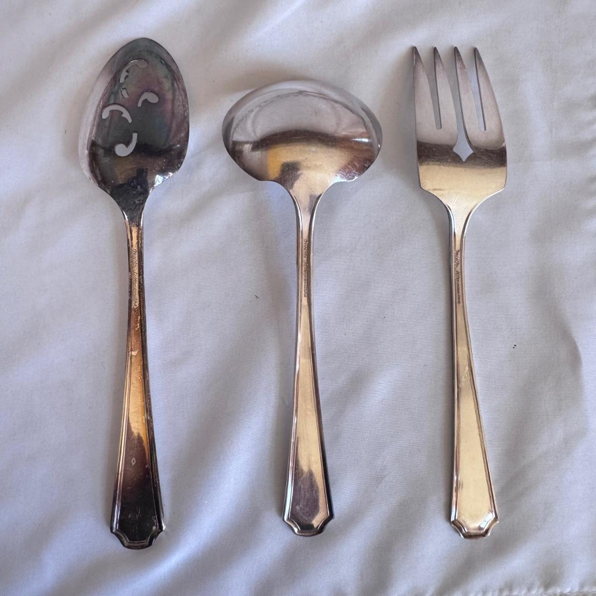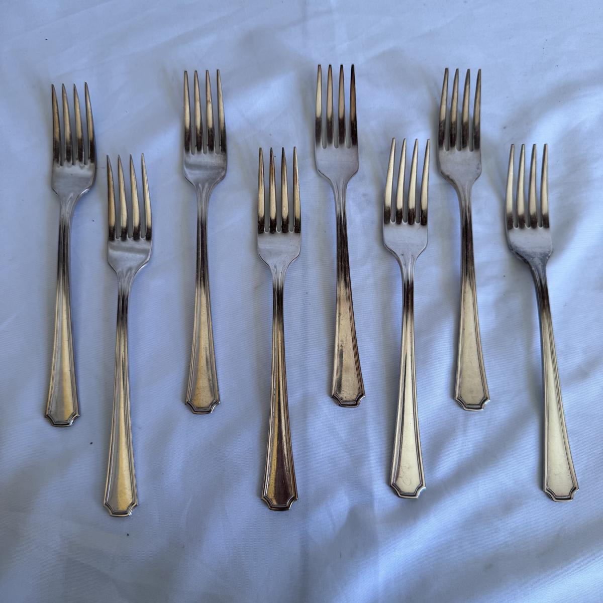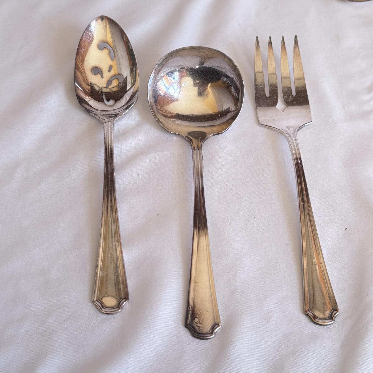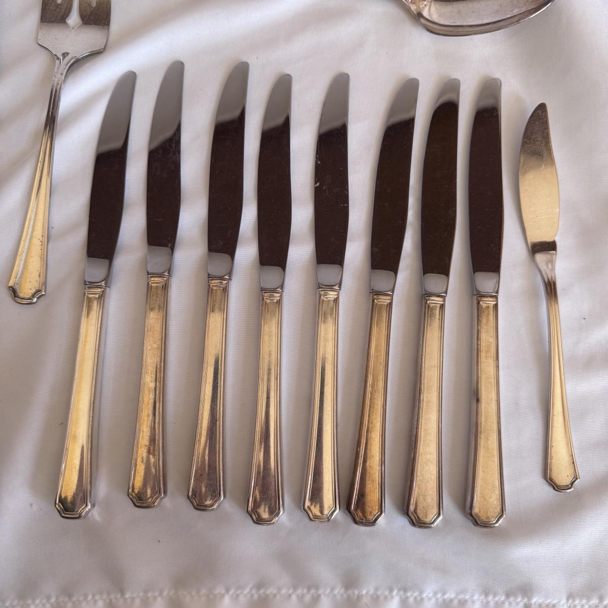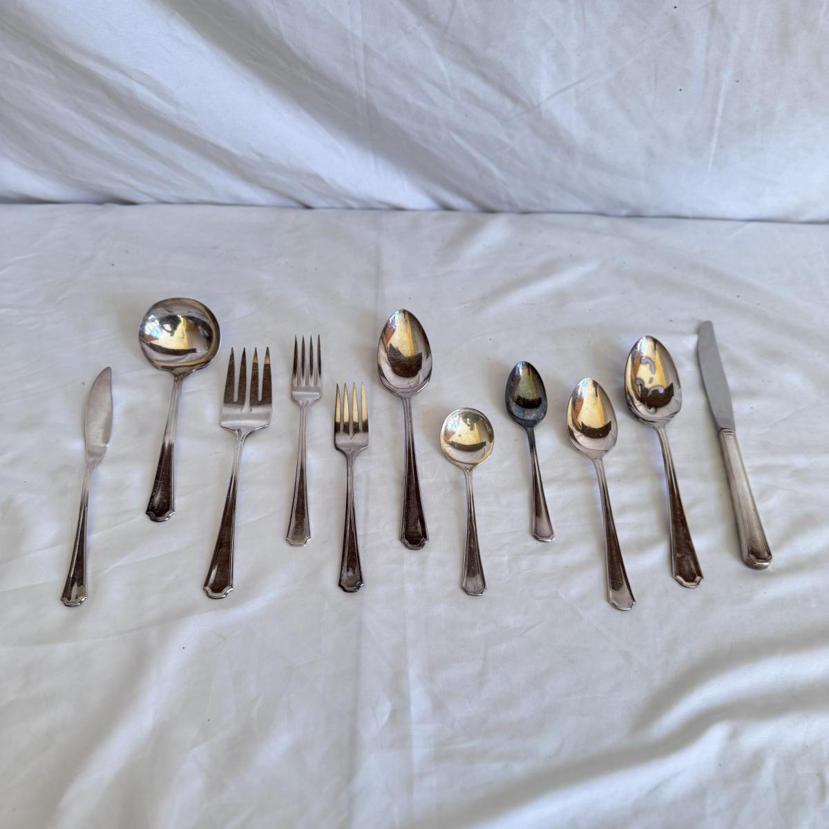 This lot of Oneida flatware includes eight standard dinner forks, eight dinner knives, eight salad forks, nineteen spoons of various sizes, and three serving utensils. All have a bit of tarnish on them. The dinner knives are the only utensils not stamped, but they have an identical pattern. All appear to be silver plated. Shipping available.