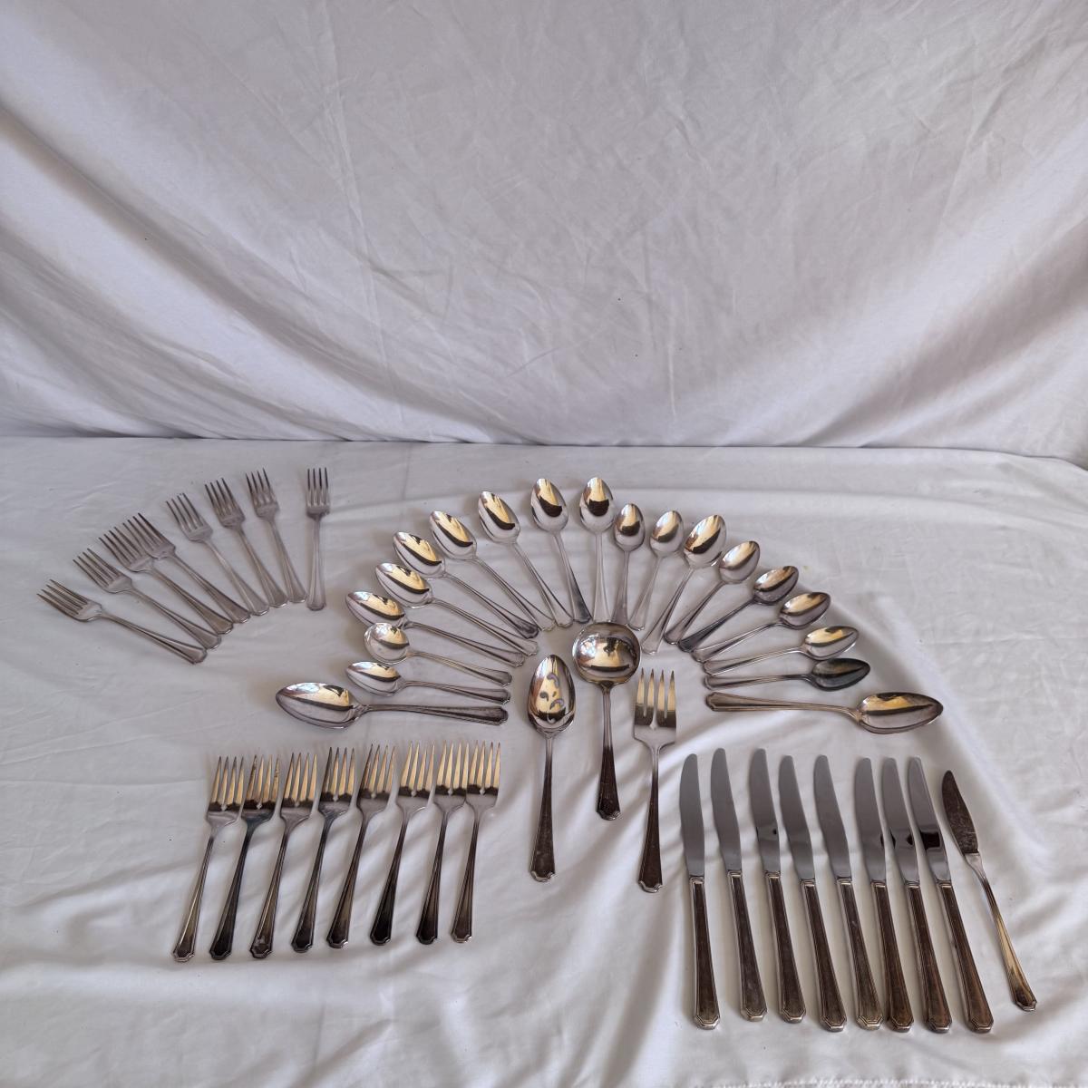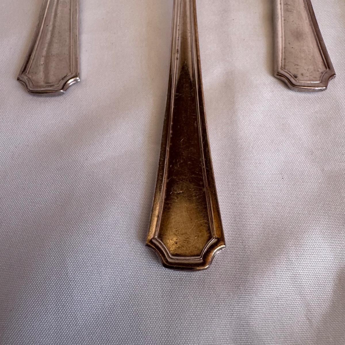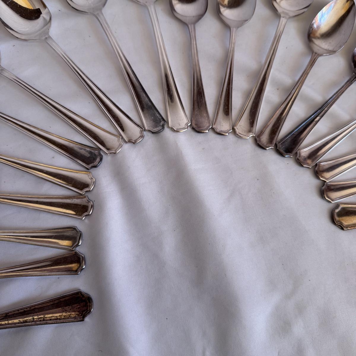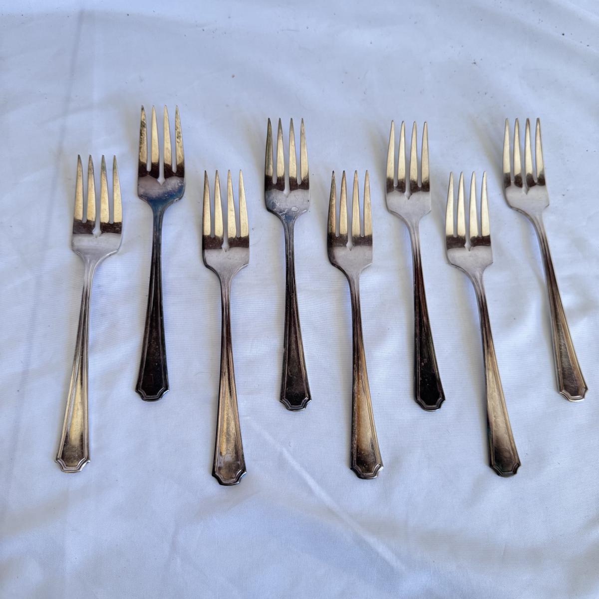 This lot of Oneida flatware includes eight standard dinner forks, eight dinner knives, eight salad forks, nineteen spoons of various sizes, and three serving utensils. All have a bit of tarnish on them. The dinner knives are the only utensils not stamped, but they have an identical pattern. All appear to be silver plated. Shipping available.