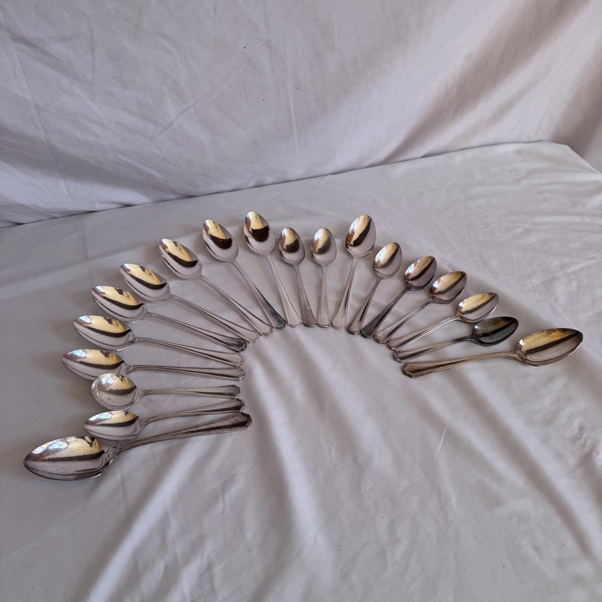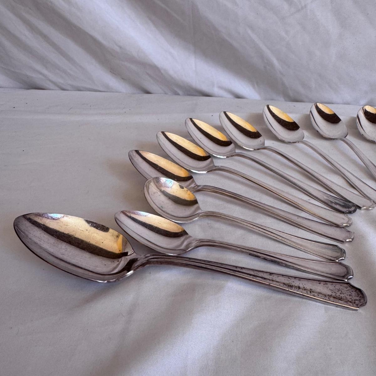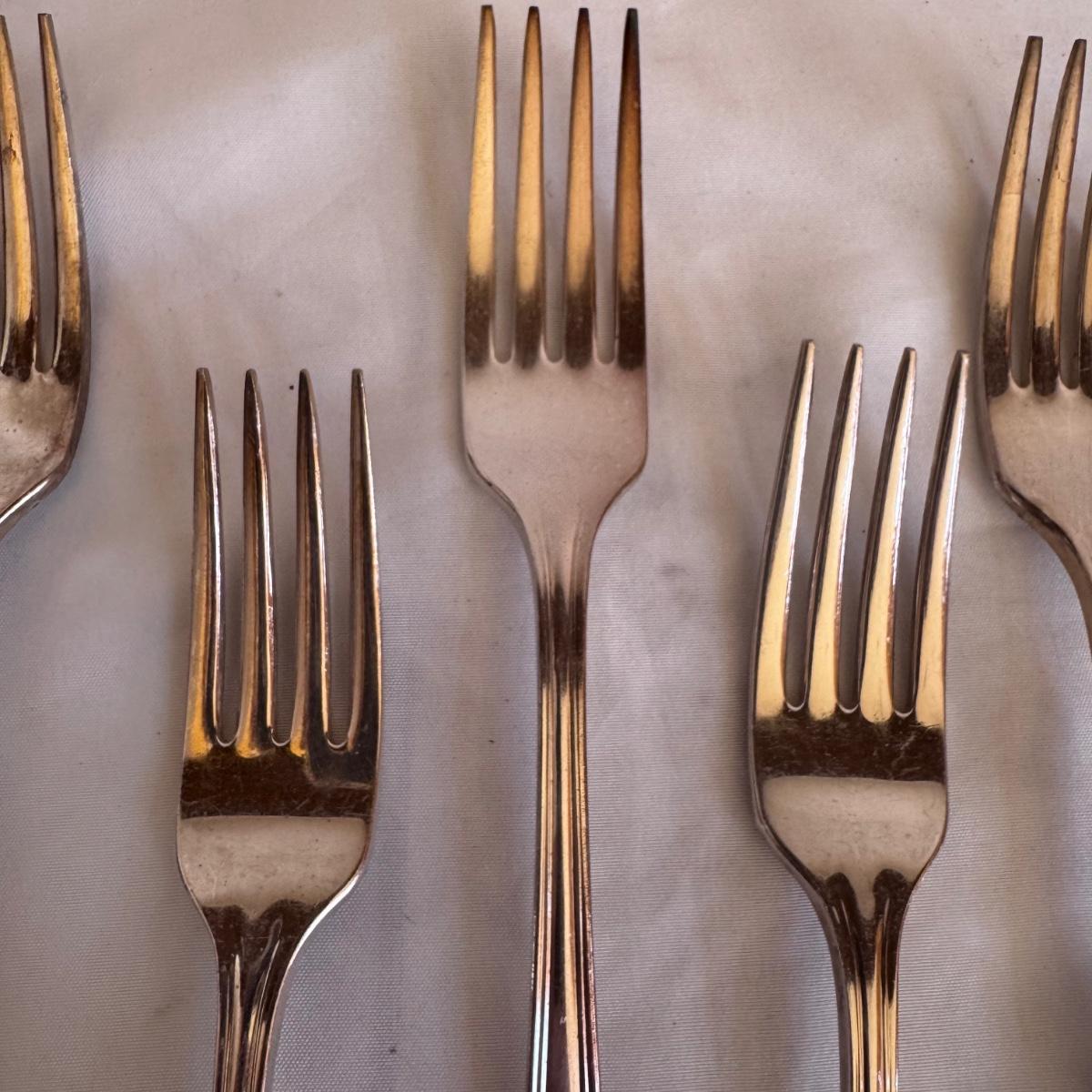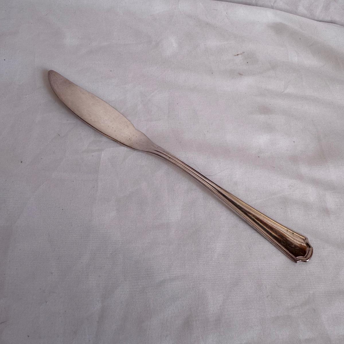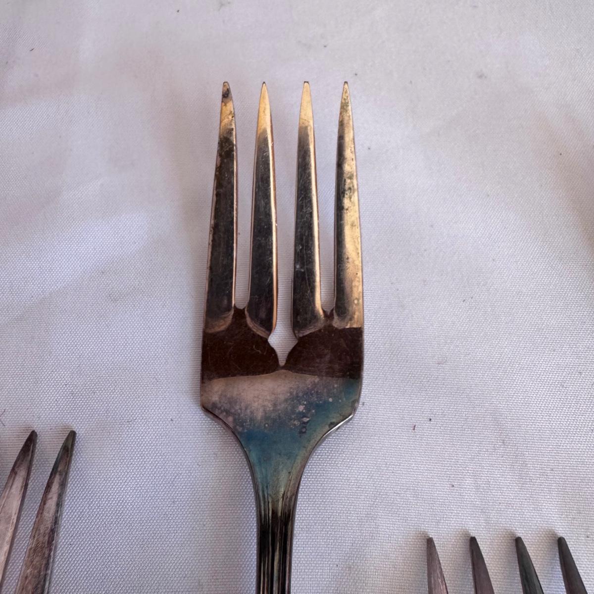 This lot of Oneida flatware includes eight standard dinner forks, eight dinner knives, eight salad forks, nineteen spoons of various sizes, and three serving utensils. All have a bit of tarnish on them. The dinner knives are the only utensils not stamped, but they have an identical pattern. All appear to be silver plated. Shipping available.