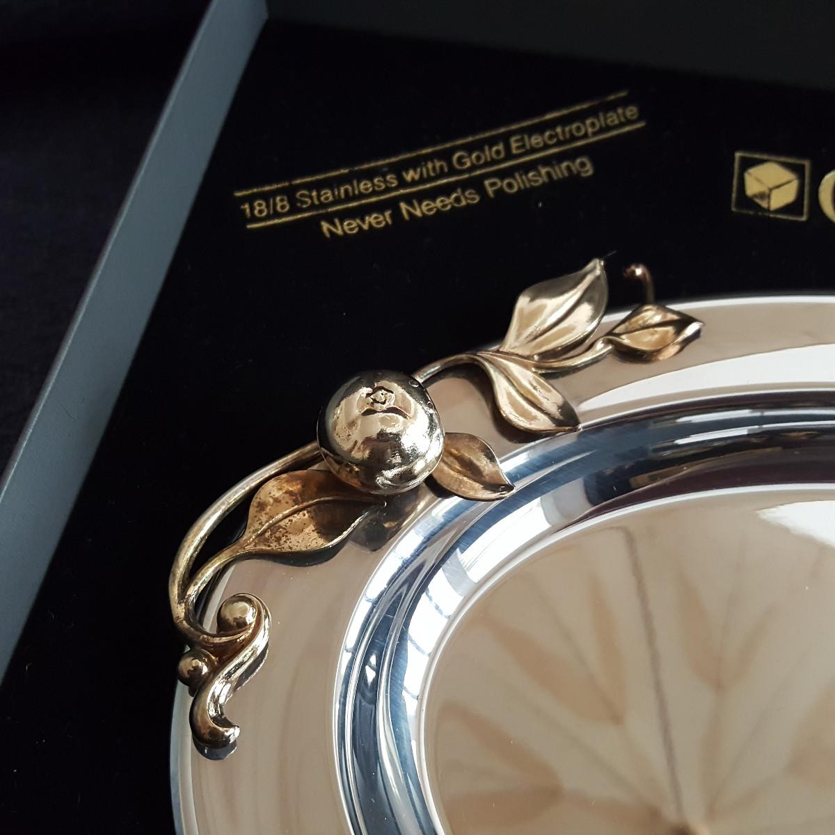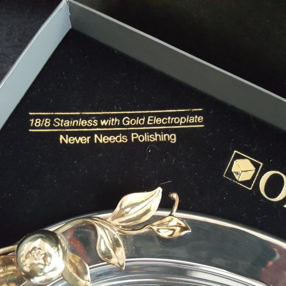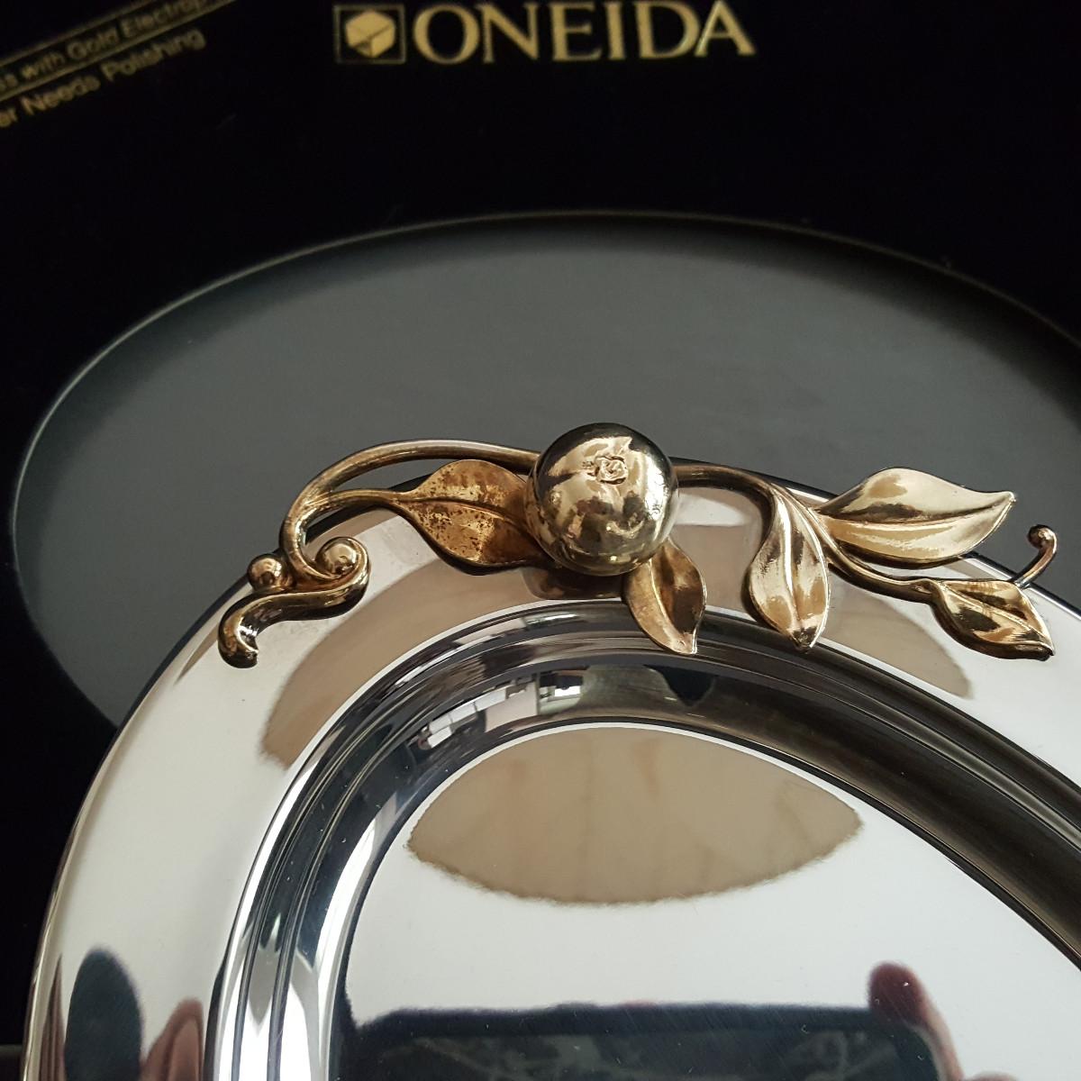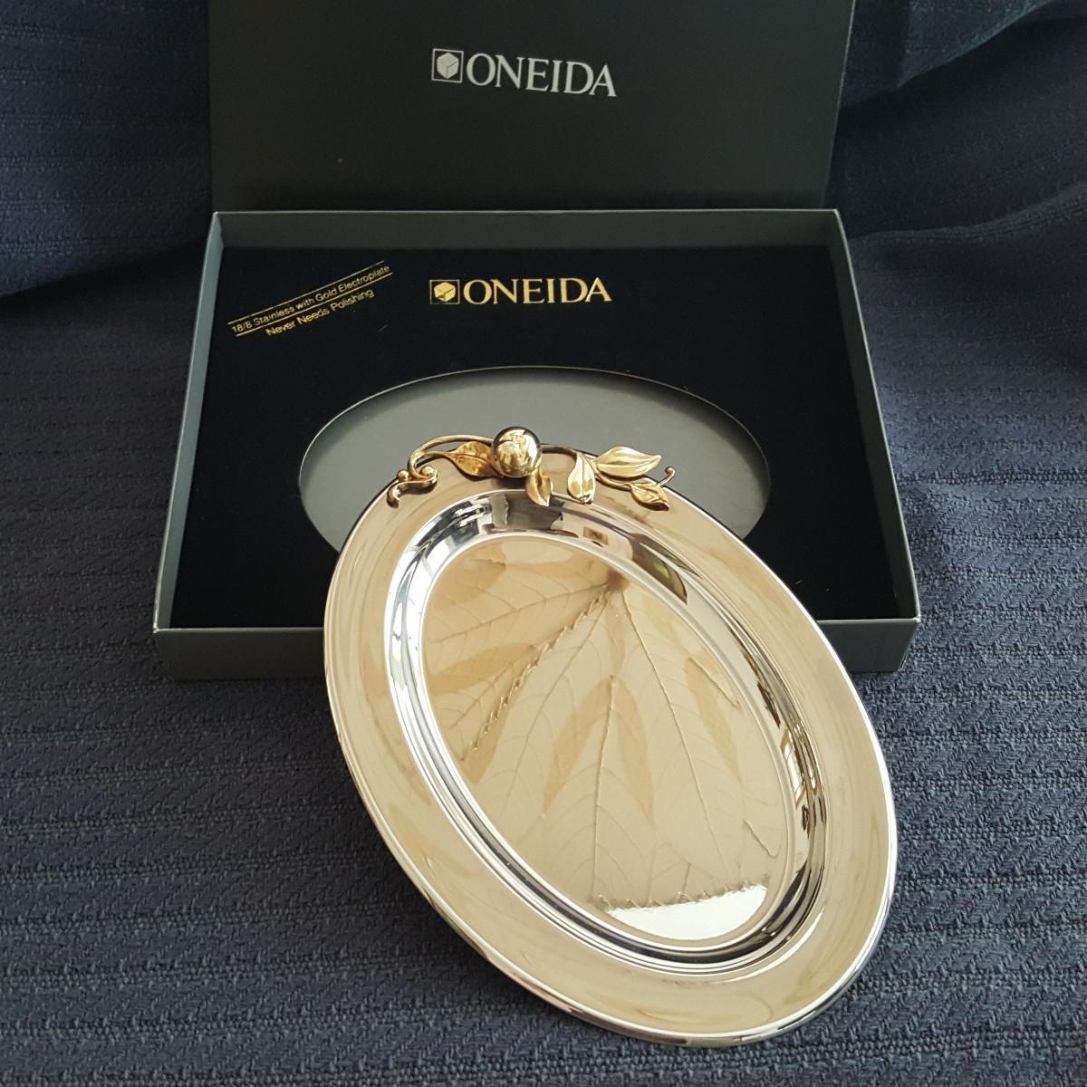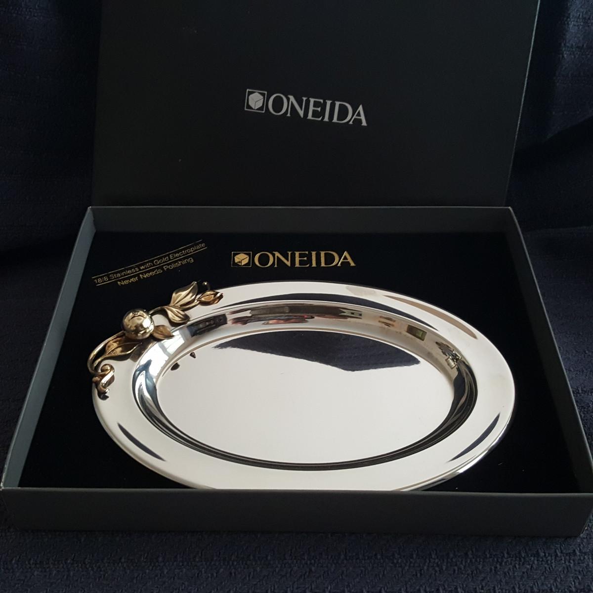 This auction lot is for a new, unused Oneida Stainless Steel Serving Tray. The tray which is 18/8 Stainless Steel with Gold Electroplate - will never need polishing. It measures about 9-inches long and 7-inches wide. Nice and useful wedding or anniversary gift idea.