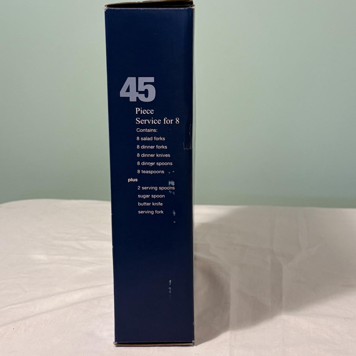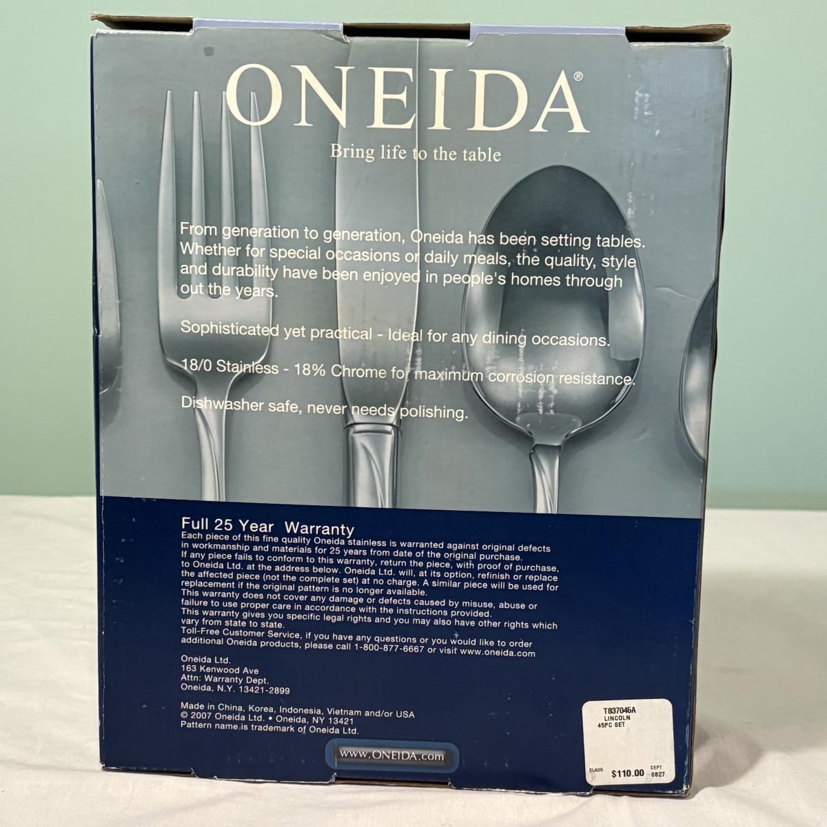 This lot includes a 45 piece service for eight of Oneida ‘Lincoln’ stainless steel flatware. The set appears to be new in box. Refer to pictures for exact contents.