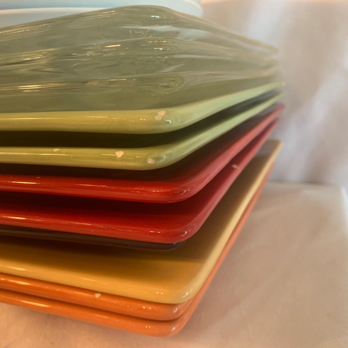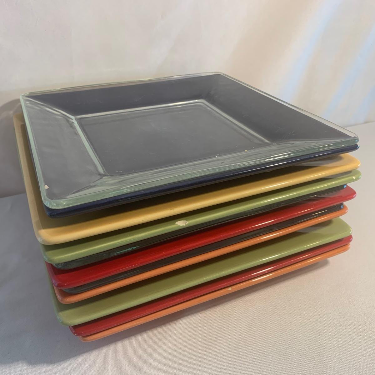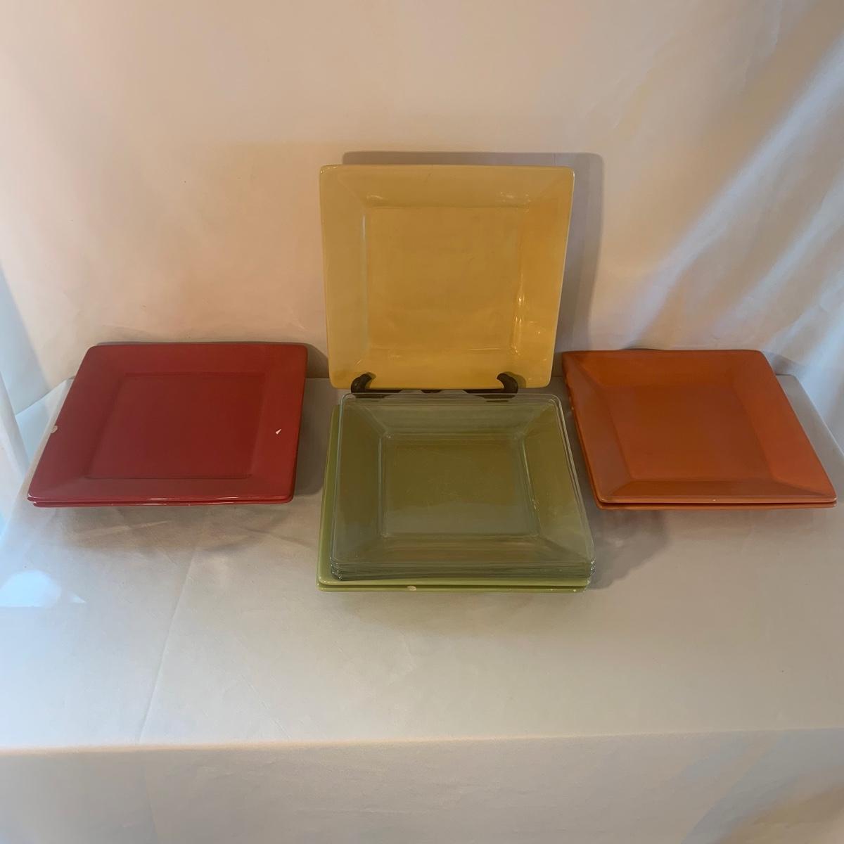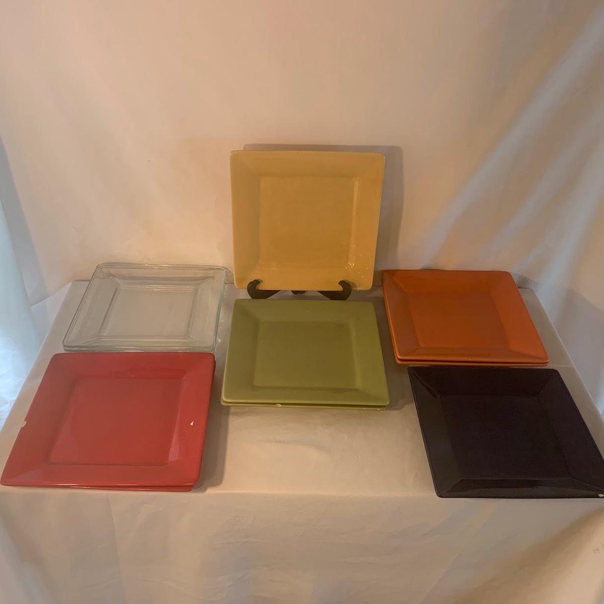 Color Burst Stoneware by Oneida and square dinnerware by Corsica. Lot includes eight Oneida stoneware dishes and 11 square dinner plates. Stoneware plates include two blue, two yellow, two red, and two orange plates. Square dinnerware includes two orange plates, three clear glass plates, two green plates, two red plates, one blue plate, and one yellow plate. Largest plate measures approximately, 10.25” x 10.25” x 1.25”H. All items are used and show signs of wear. Please see photos for more details. Shipping available.