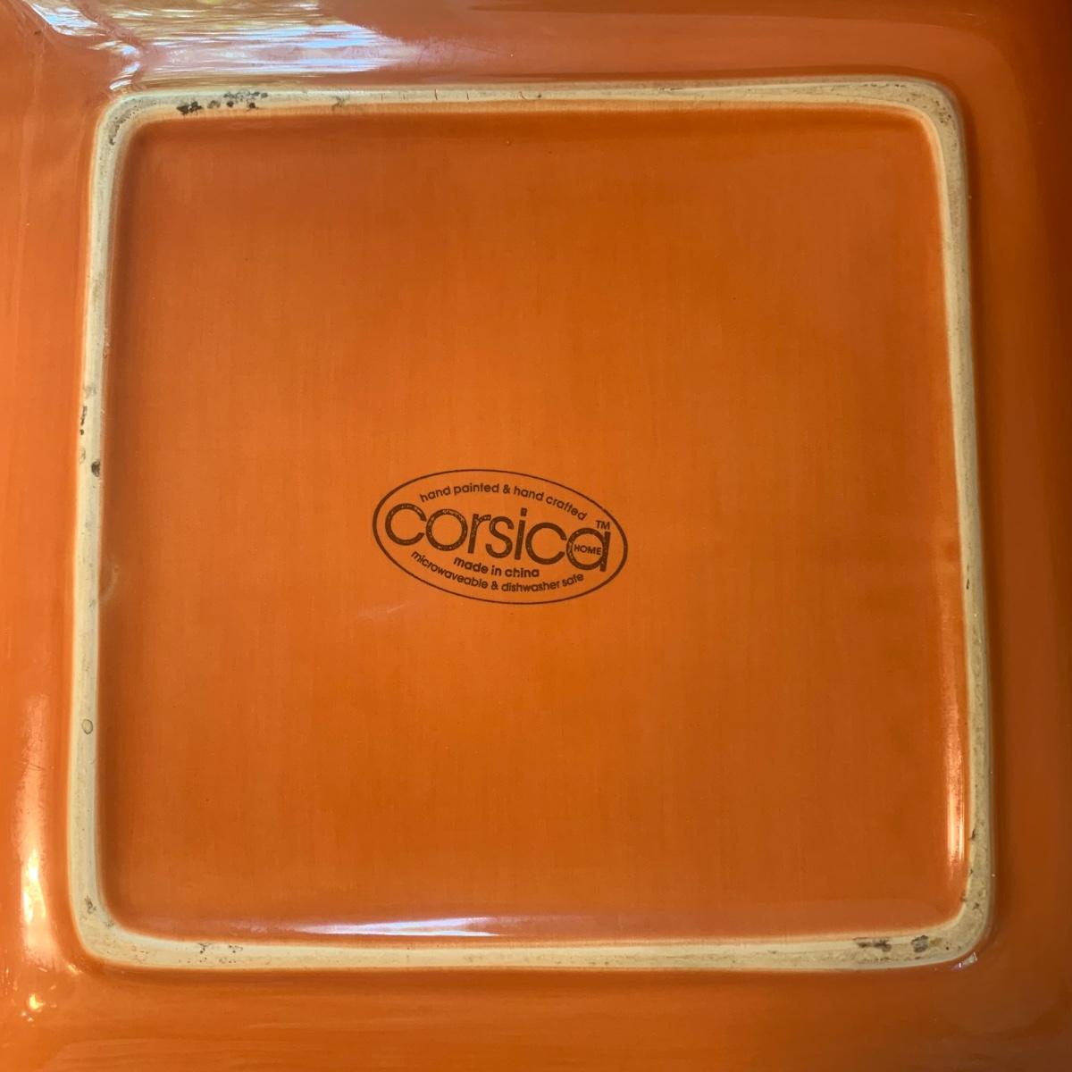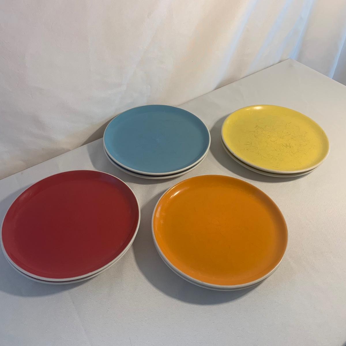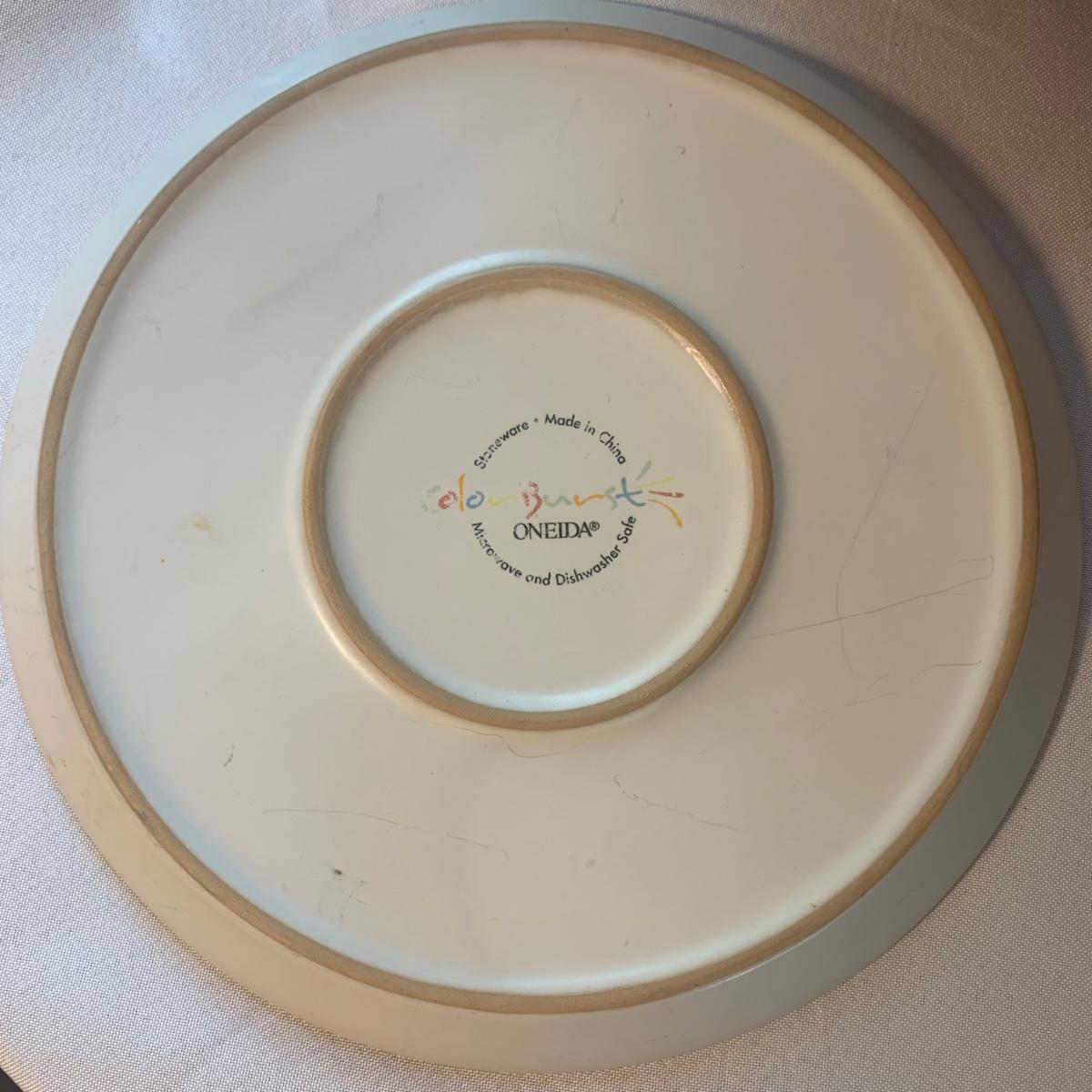 Color Burst Stoneware by Oneida and square dinnerware by Corsica. Lot includes eight Oneida stoneware dishes and 11 square dinner plates. Stoneware plates include two blue, two yellow, two red, and two orange plates. Square dinnerware includes two orange plates, three clear glass plates, two green plates, two red plates, one blue plate, and one yellow plate. Largest plate measures approximately, 10.25” x 10.25” x 1.25”H. All items are used and show signs of wear. Please see photos for more details. Shipping available.