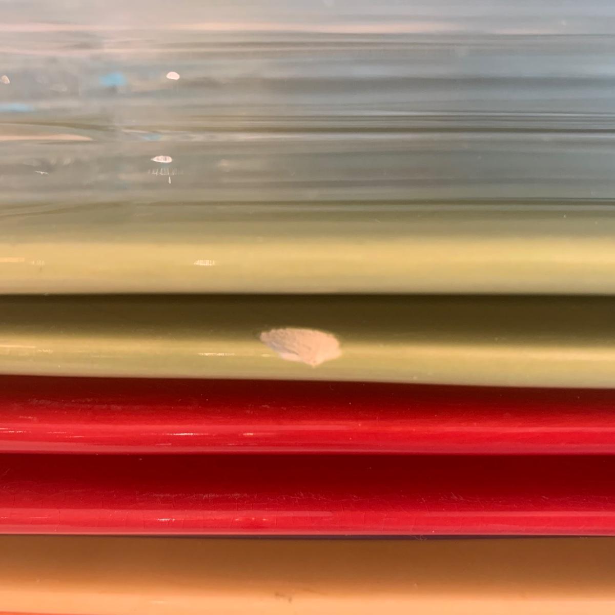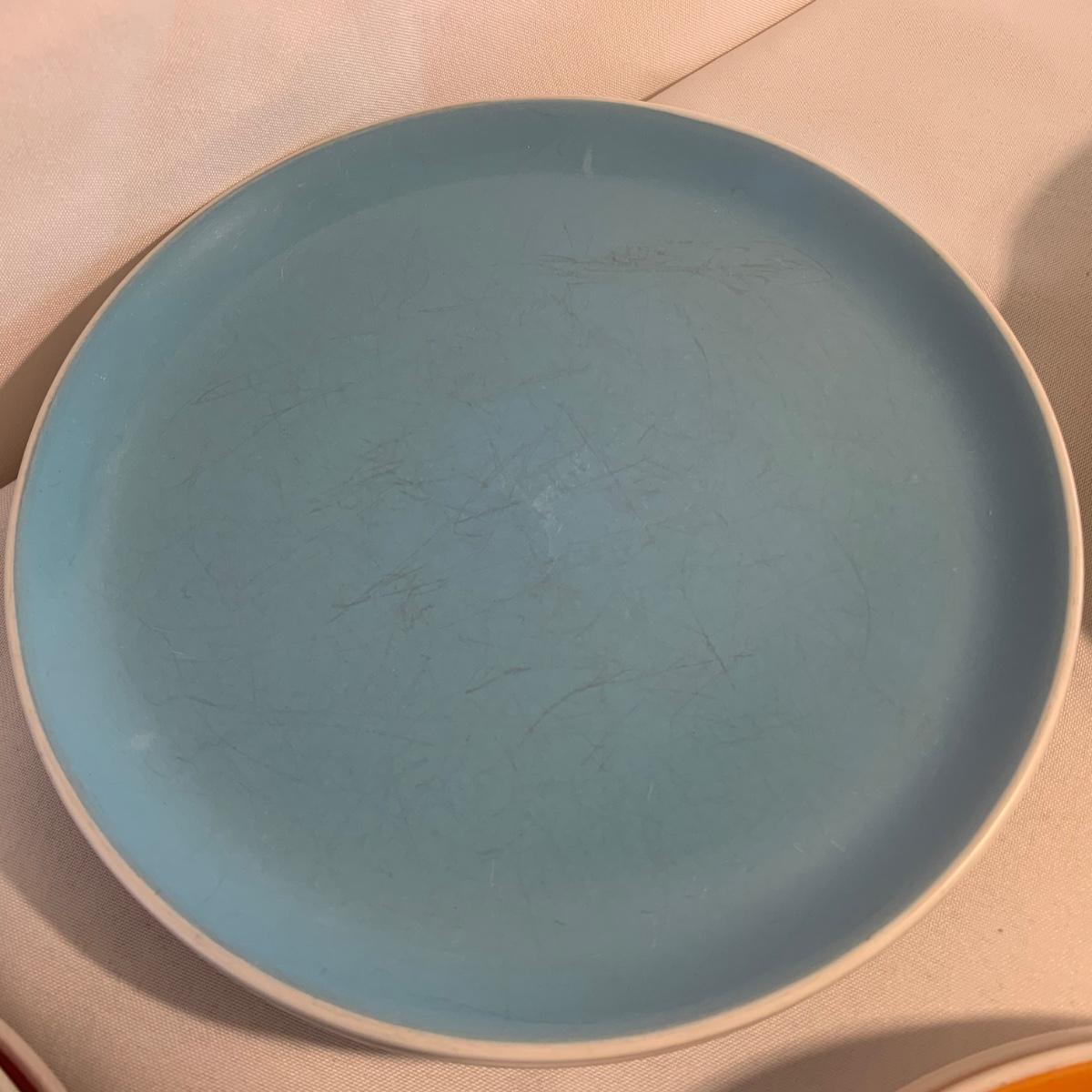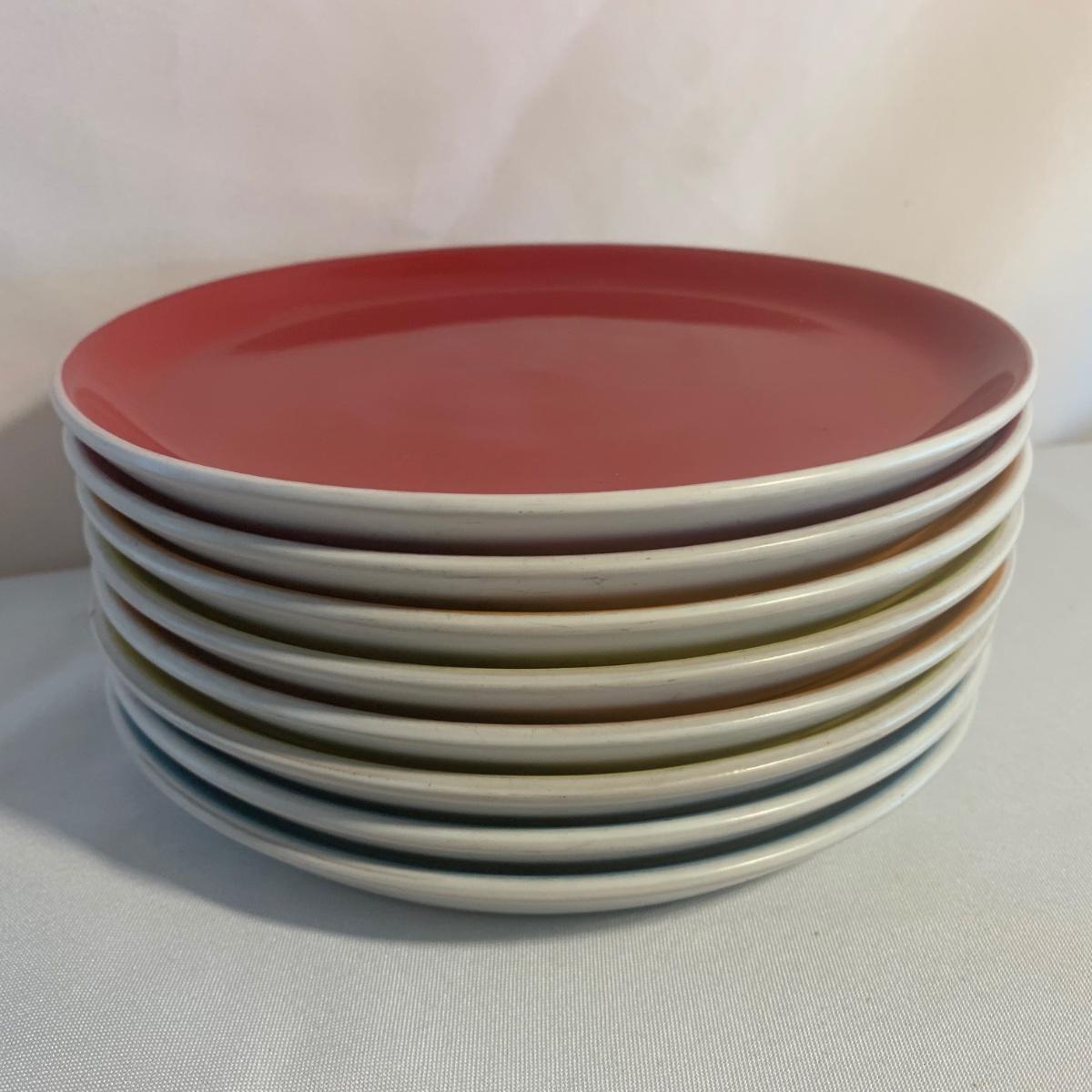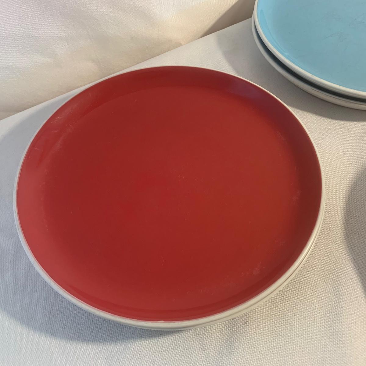 Color Burst Stoneware by Oneida and square dinnerware by Corsica. Lot includes eight Oneida stoneware dishes and 11 square dinner plates. Stoneware plates include two blue, two yellow, two red, and two orange plates. Square dinnerware includes two orange plates, three clear glass plates, two green plates, two red plates, one blue plate, and one yellow plate. Largest plate measures approximately, 10.25” x 10.25” x 1.25”H. All items are used and show signs of wear. Please see photos for more details. Shipping available.
