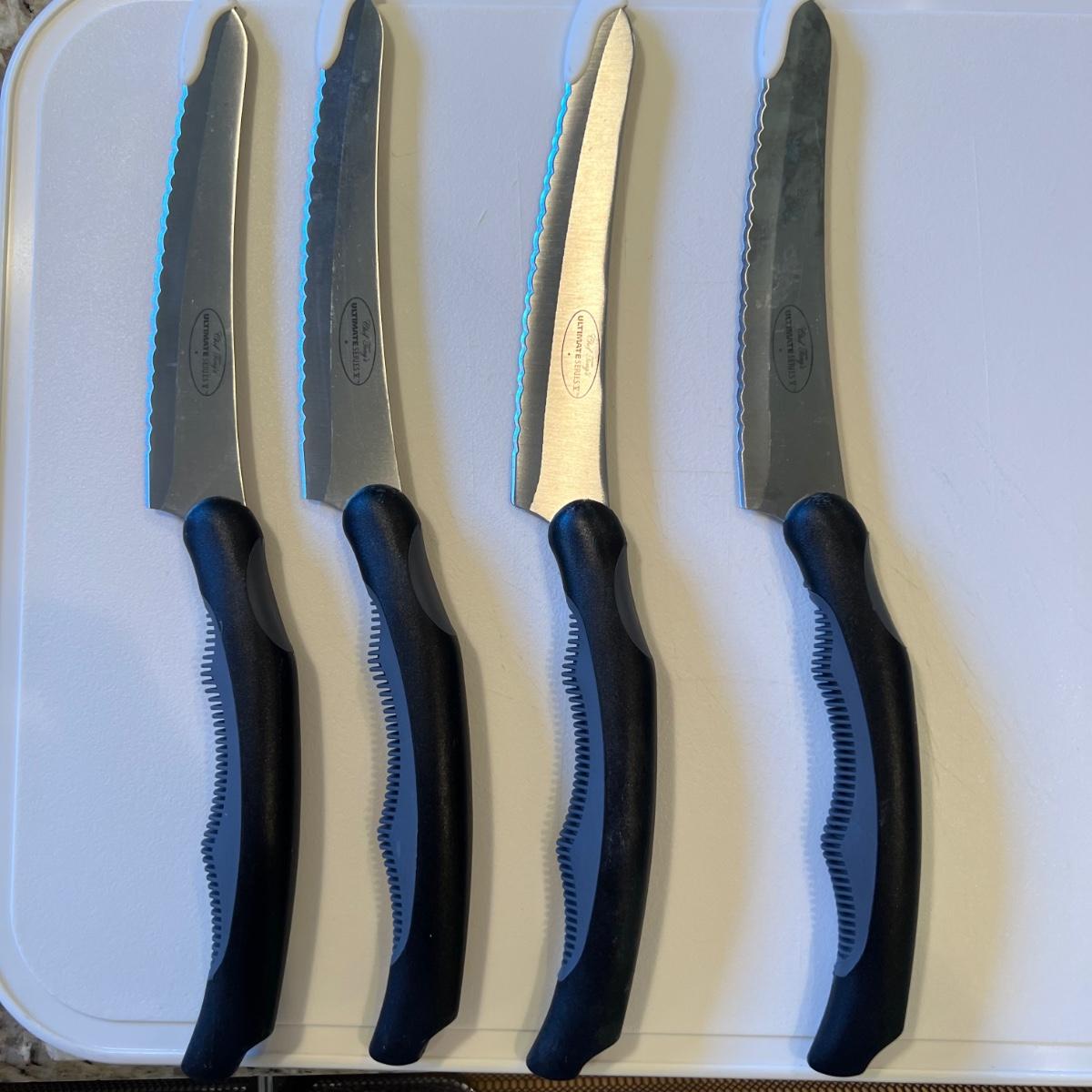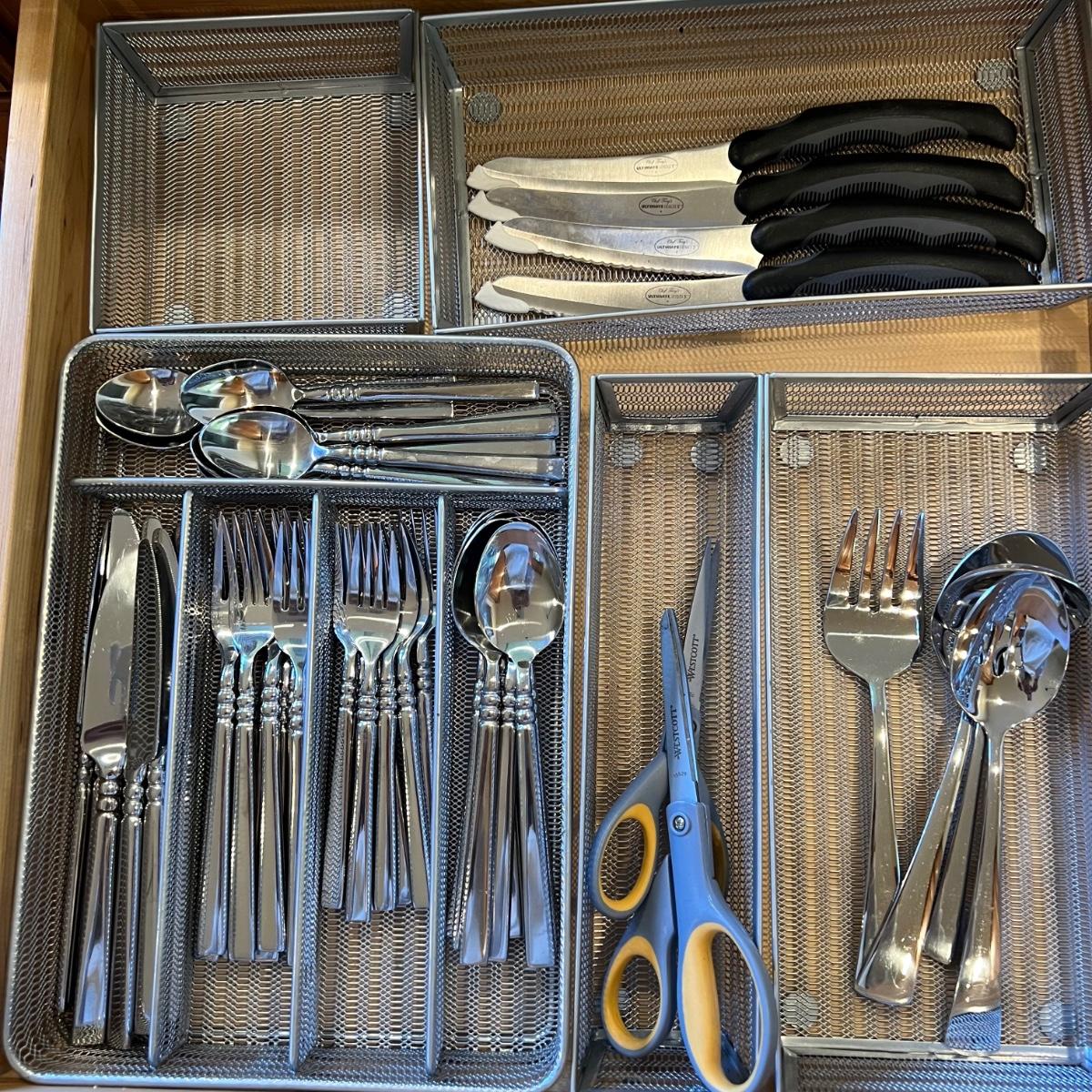 A full 40 piece set of Oneida Flatware. Also included two pair of scissors and four serving utensils. Additionally, lot includes four steak knives and five metal drawer organizing metal baskets.