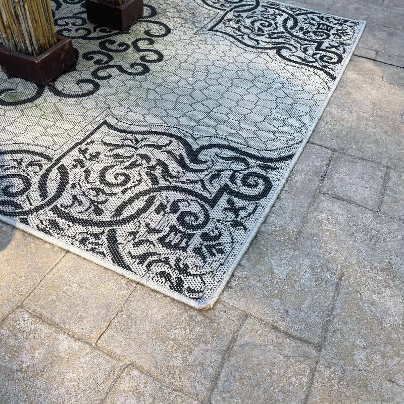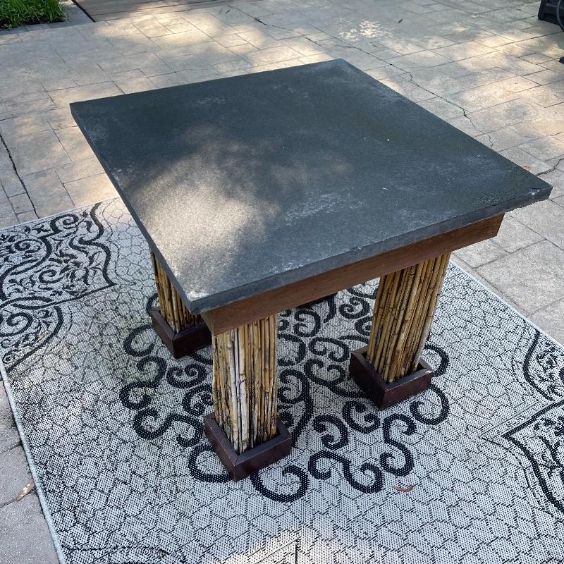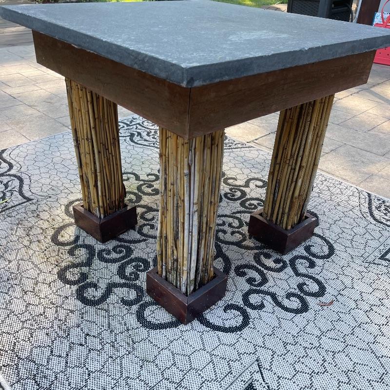 Heavy!! Custom made Blue Stone table has a base constructed of Spanish Cedar. The bamboo wrapped legs add a zen feeling to this statement piece. 6’ x 4’ rug is included!
