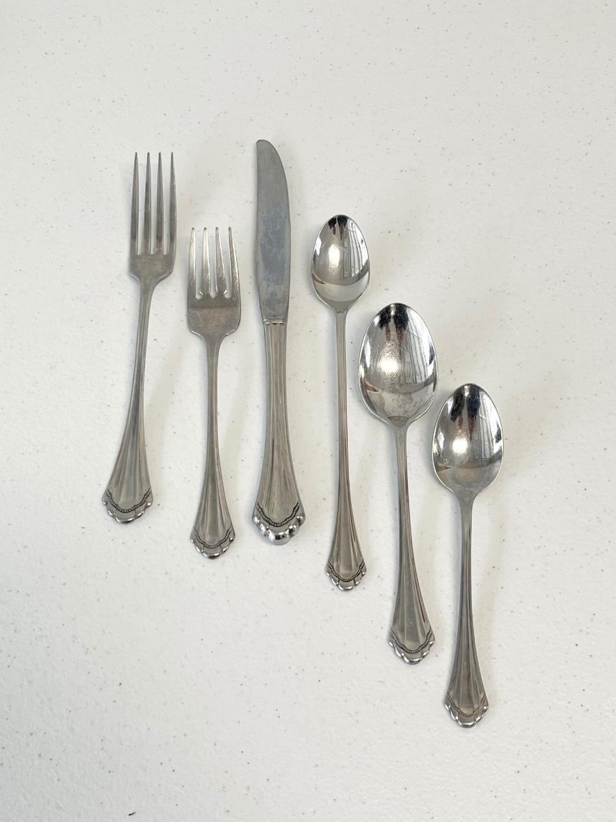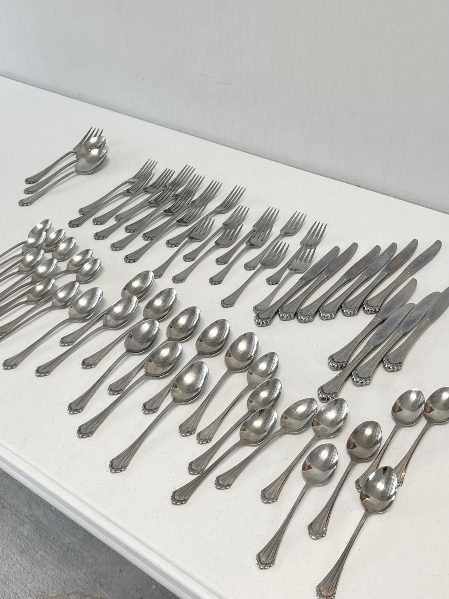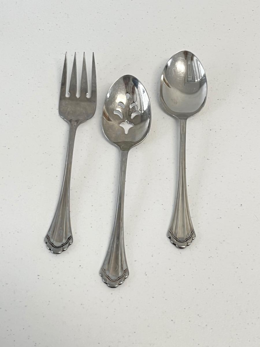 62 Pieces ~ 10 Each DinnerFork, Butter knife, Long handle tea spoons, Teaspoons, Soup spoons & only 9 salad Forks, set also includes 3 serving Pieces.