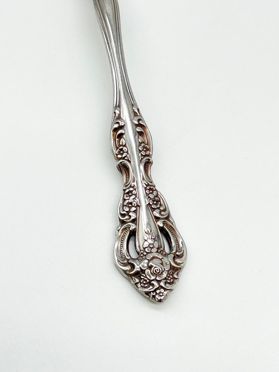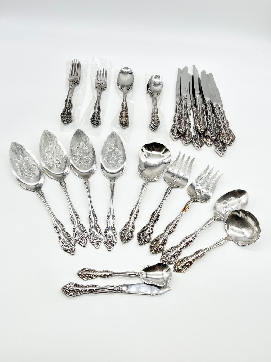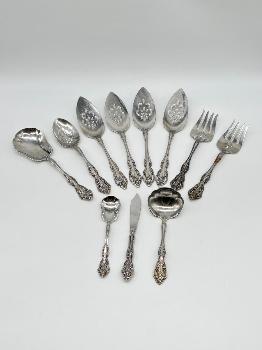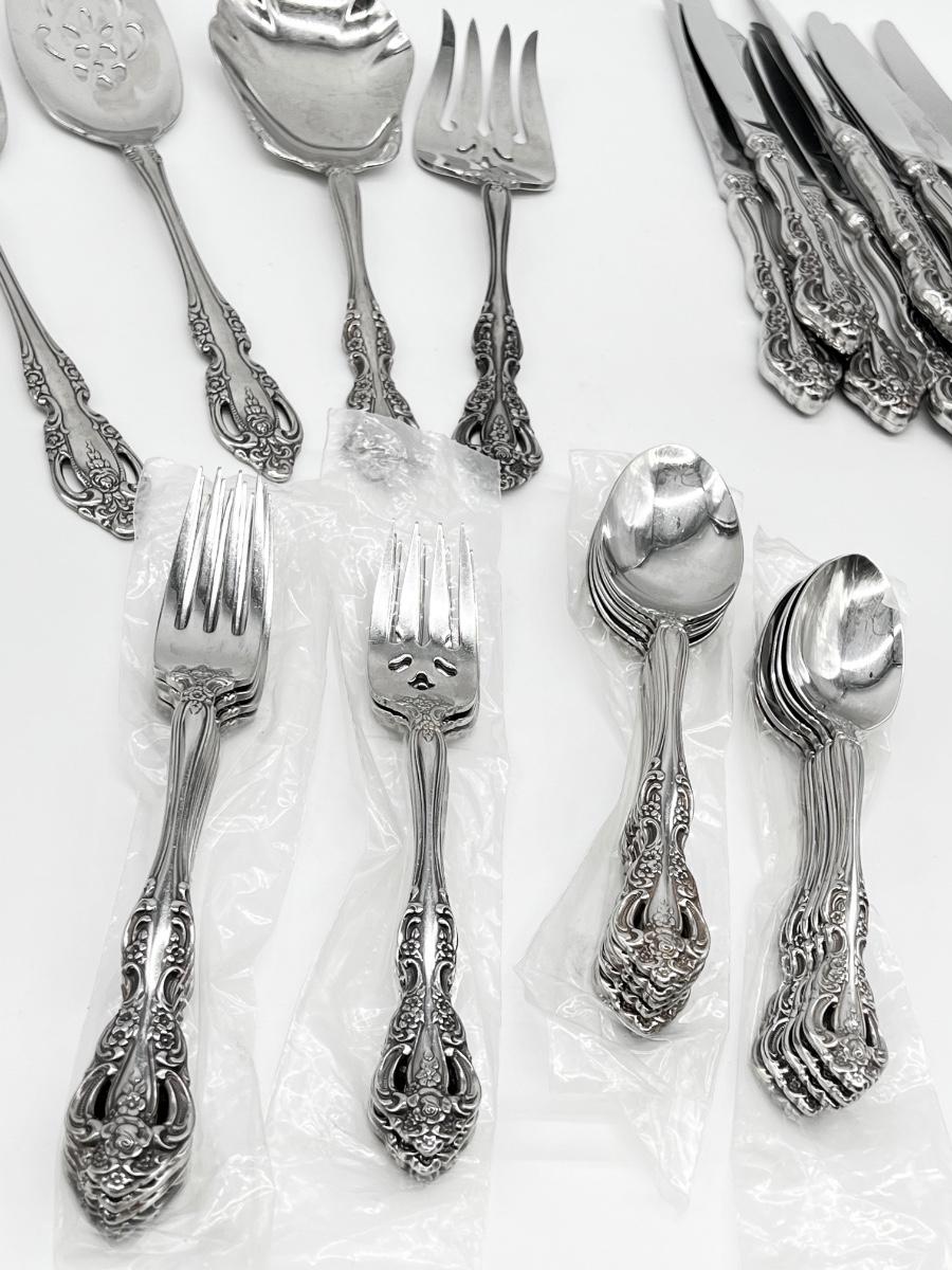 Set includes: 11 serving pieces ~ 4 dinner forks ~ 3 salad forks ~ 6 soup spoons ~ 5 teaspoons ~ 10 butter knives ~ see photos