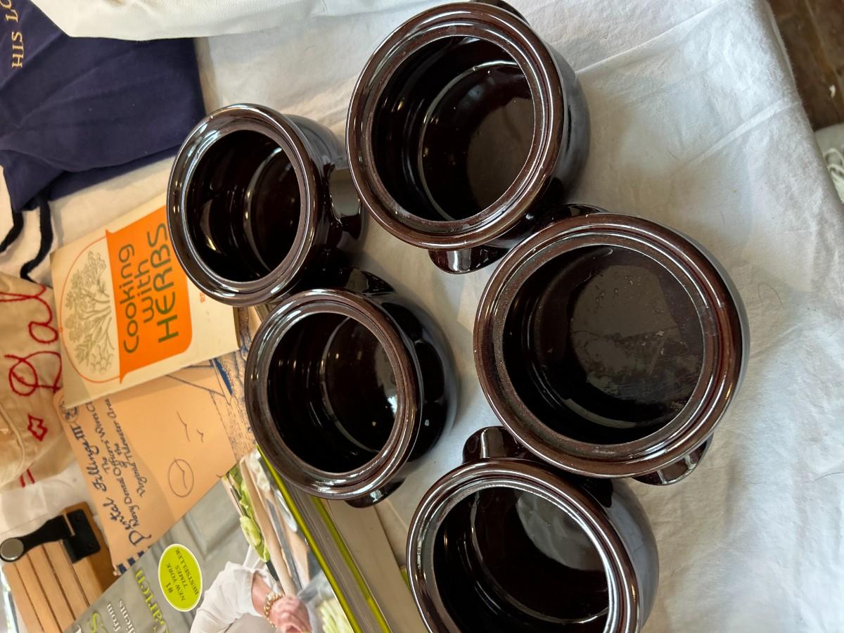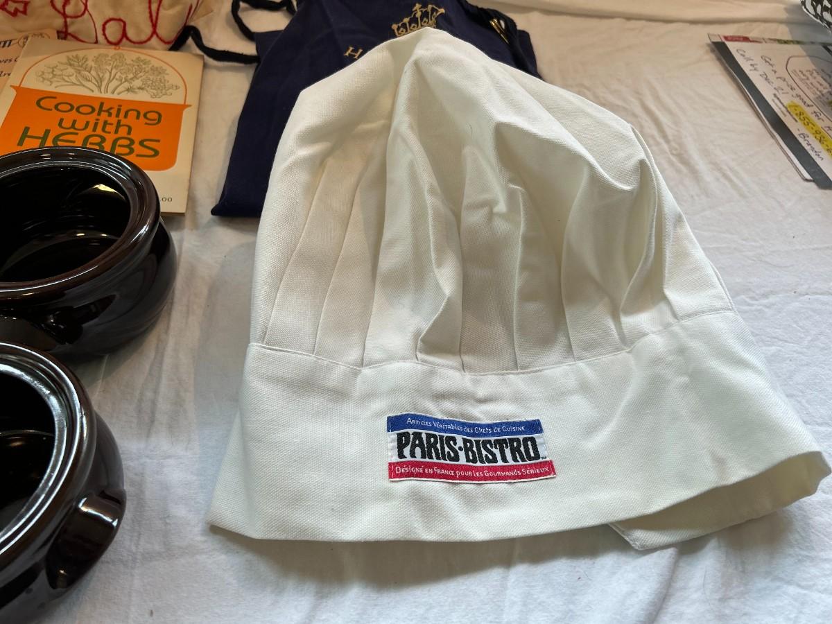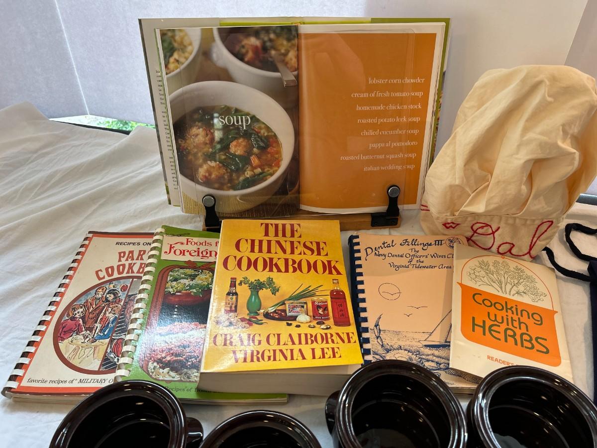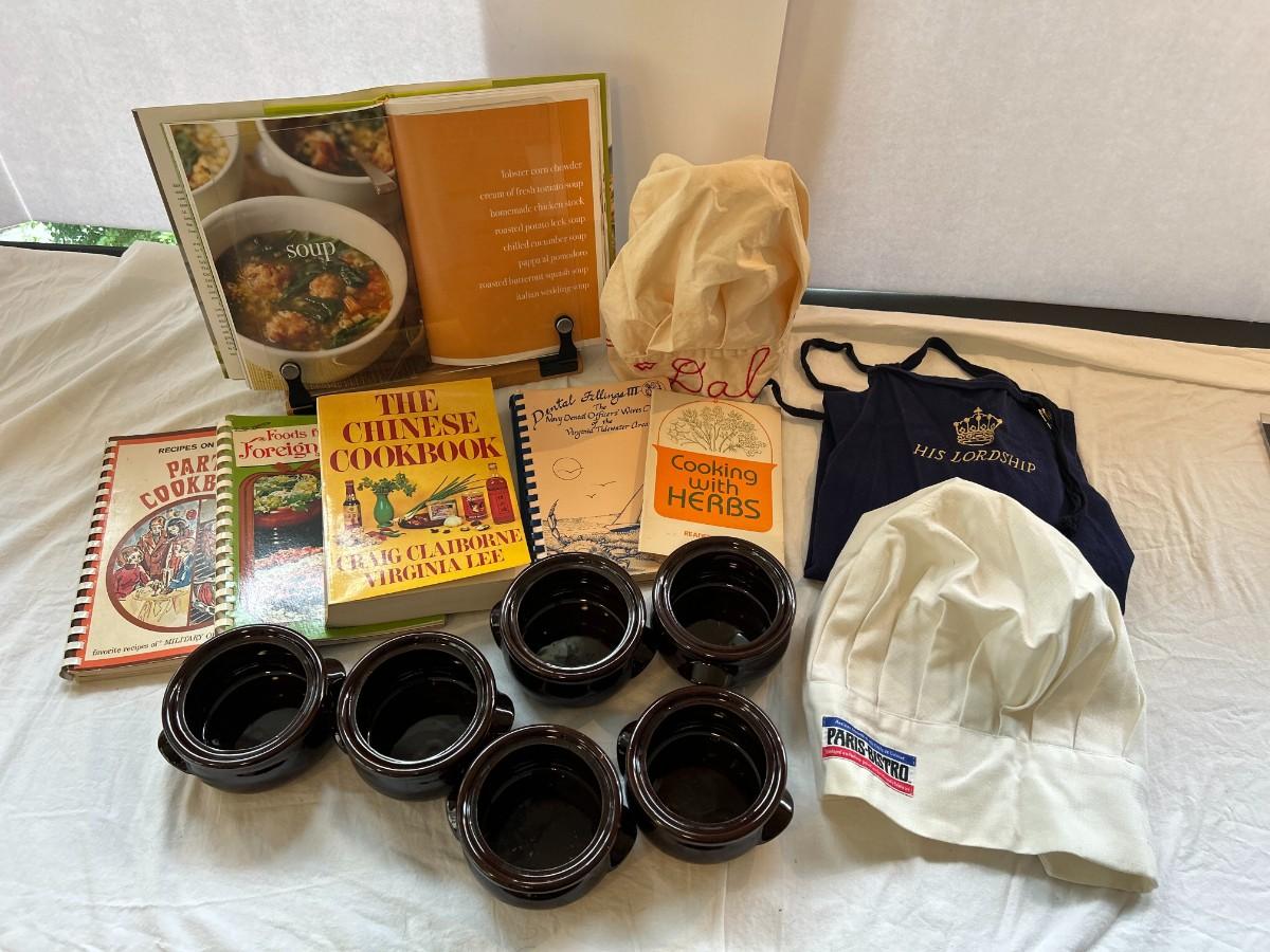 Six onion soup bowls with chef's hat, apron and books of recipes to try something other than onion soup