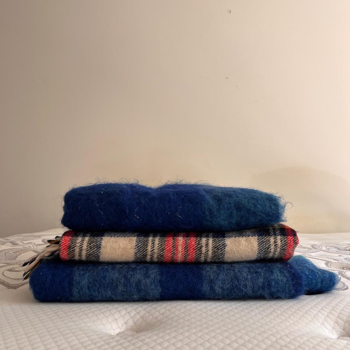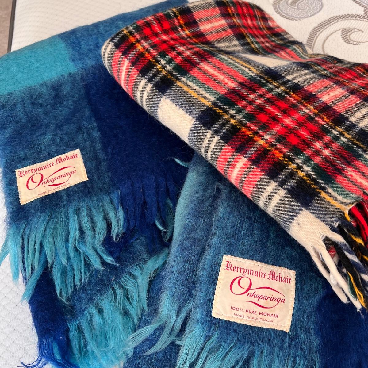 This lot includes two Onkaparinga Kerrymuire Mohair blankets and one plaid blanket that appears to be vintage. The Onkaparinga blankets measure 55” x 70”H. The plaid blanket measures 50”x 62”H. There are a few stains on the plaid blanket - see pictures included. Mattress not included. Shipping available.