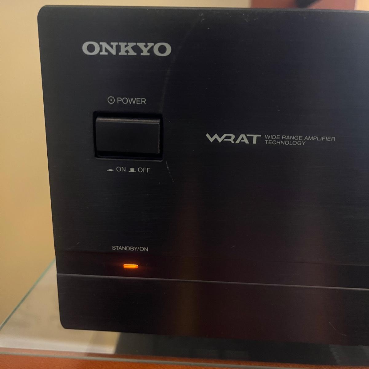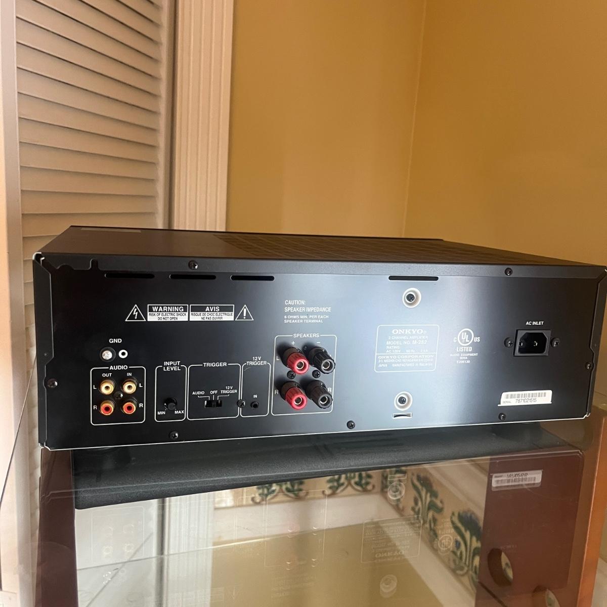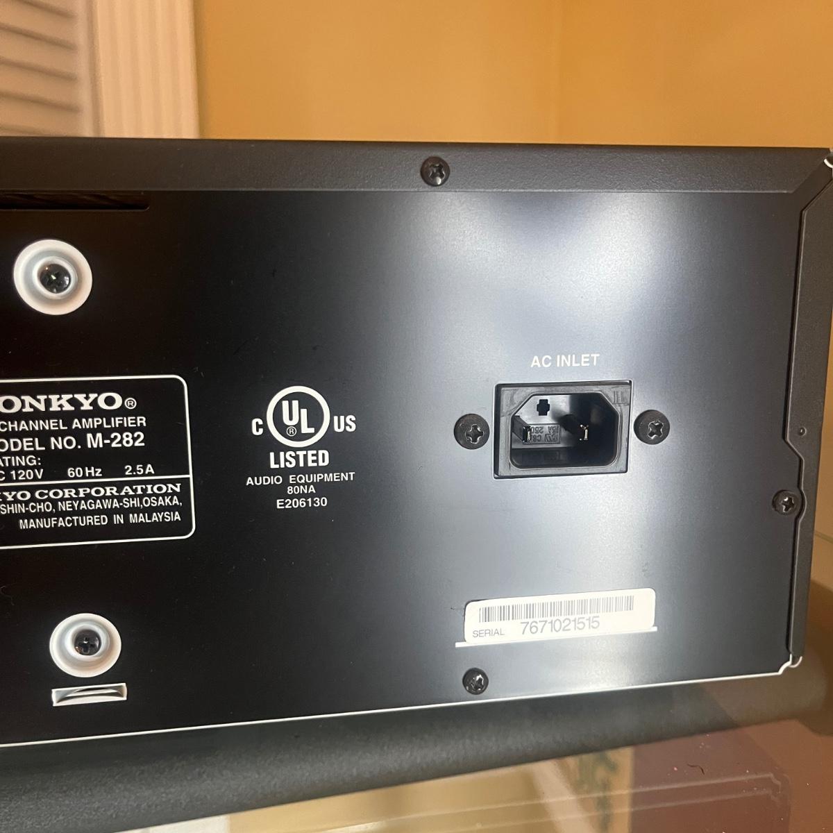 Lot includes four identcal Onkyo two channel amplifiers that measure 17” x 11” x 5.5”H. All machines powered on when plugged in. Instruction manual included.