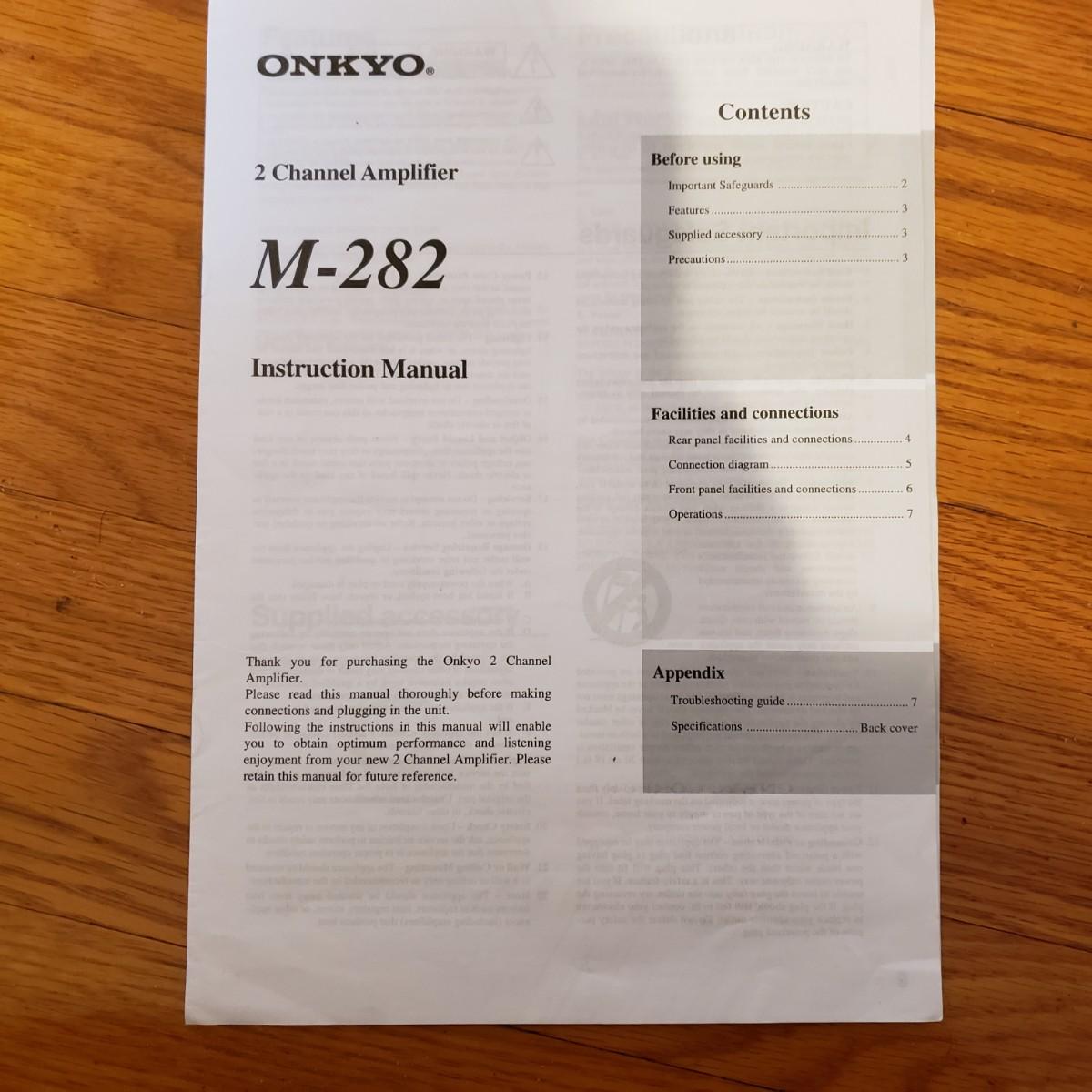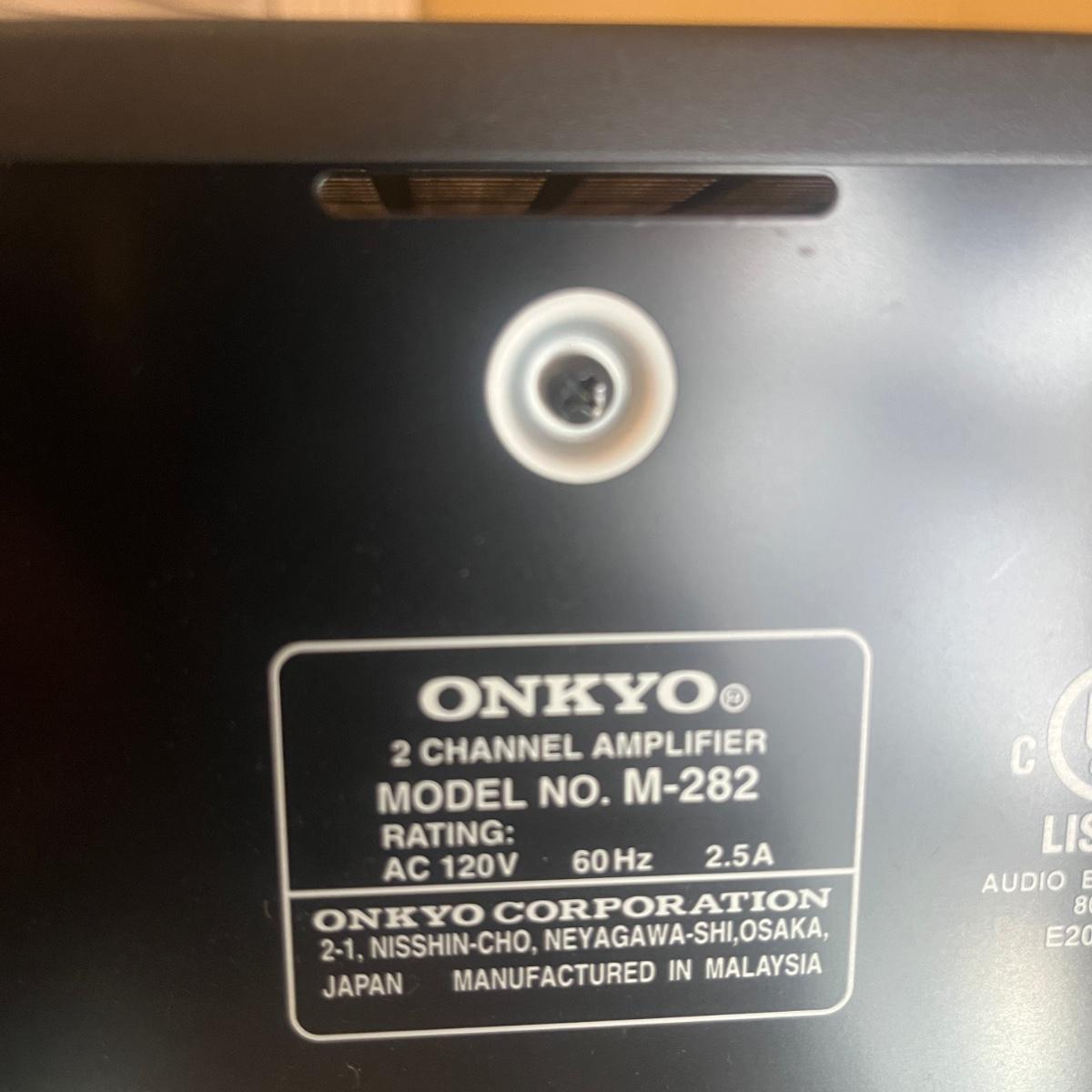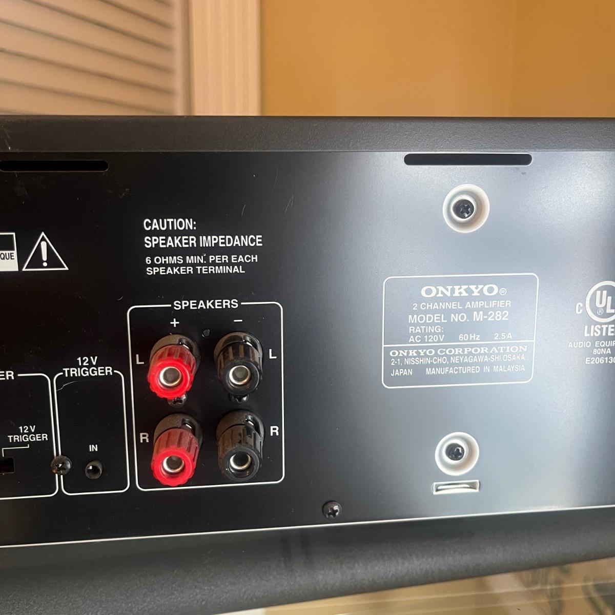 Lot includes four identcal Onkyo two channel amplifiers that measure 17” x 11” x 5.5”H. All machines powered on when plugged in. Instruction manual included.