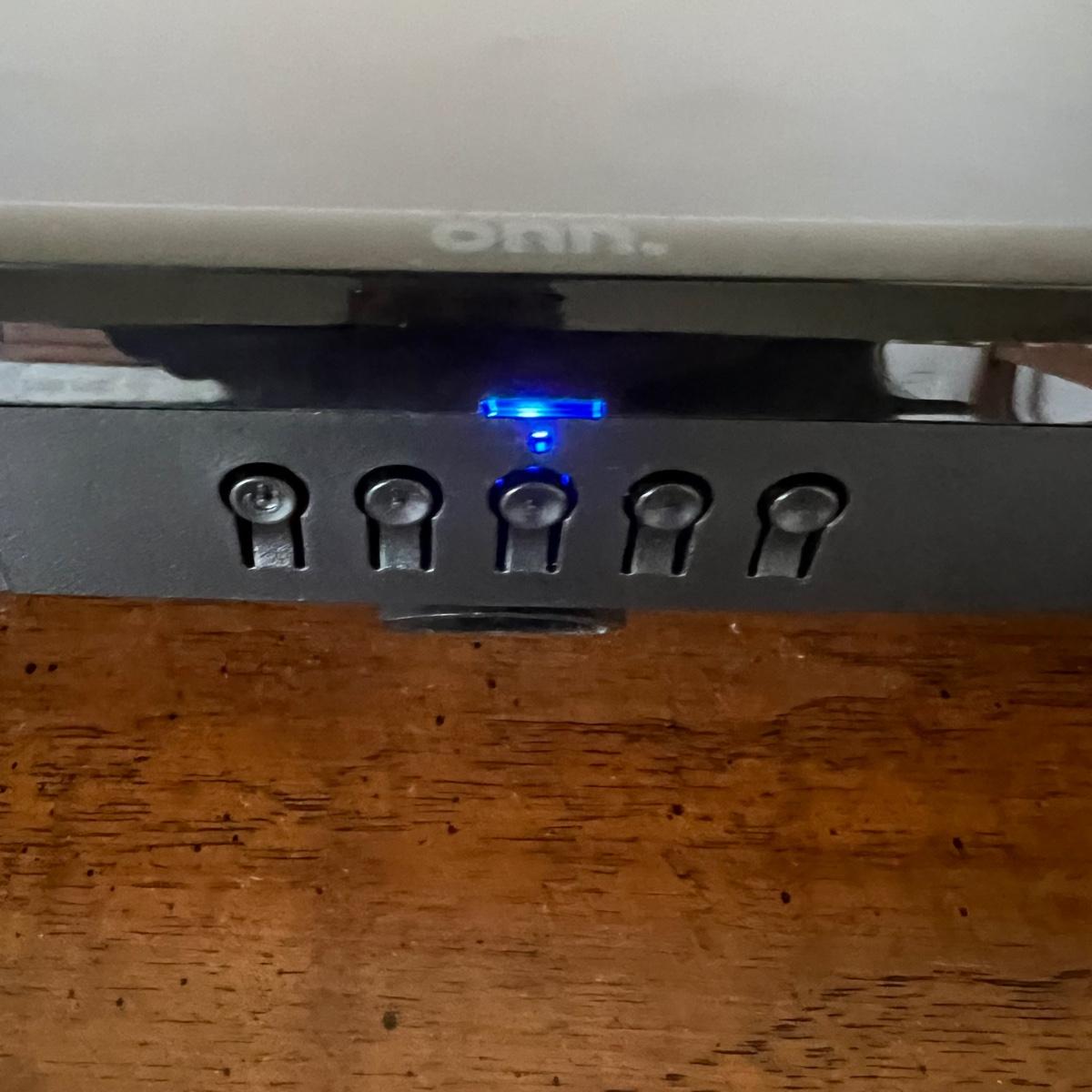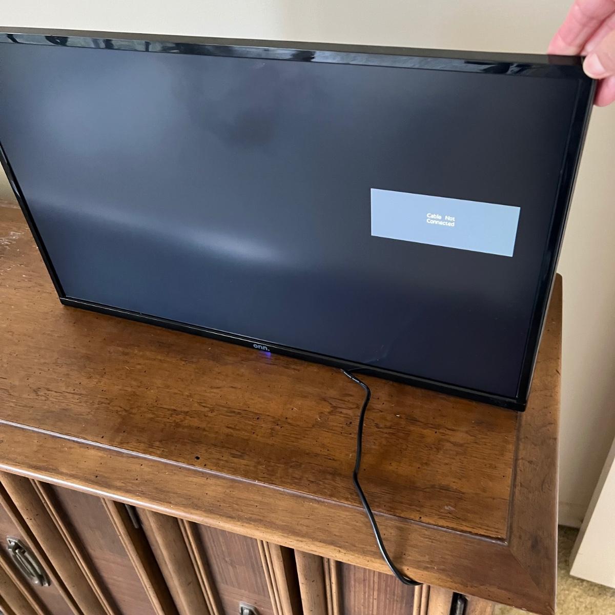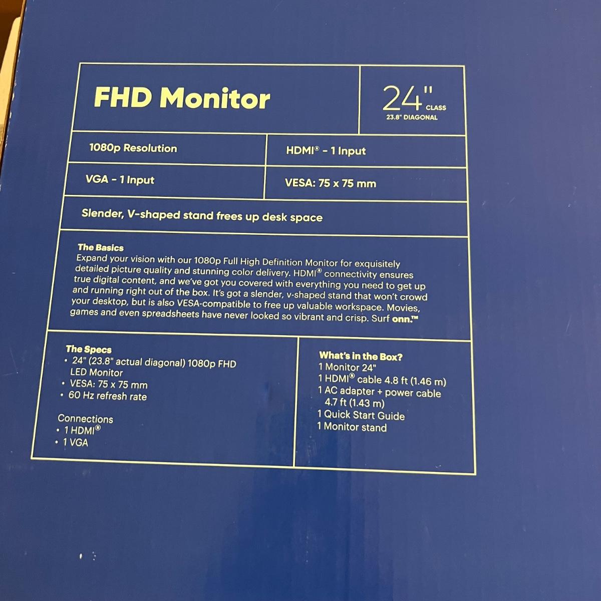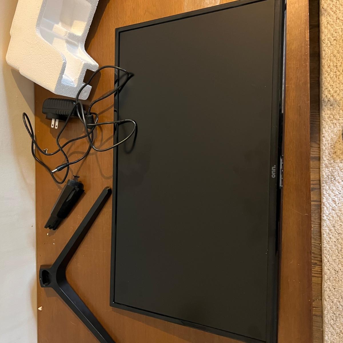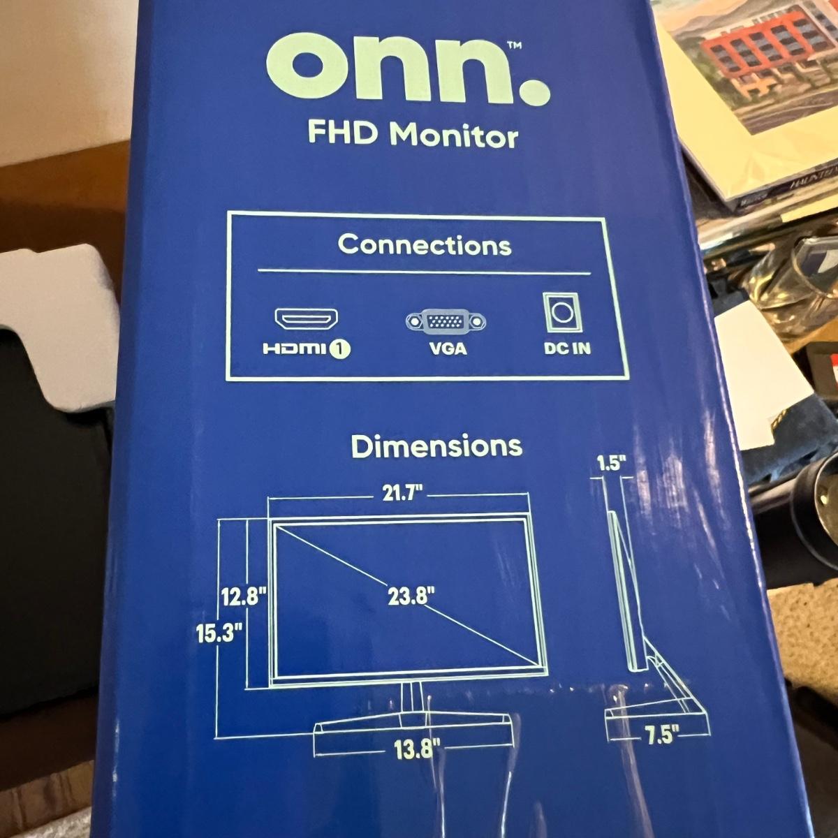 This Onn FHD monitor powered on when plugged in. Comes with box; item is possibly new but we cannot guarantee this. See images for measurements and other information.