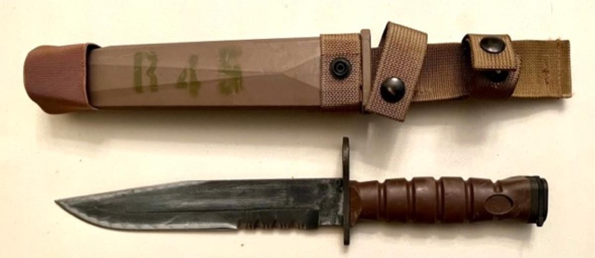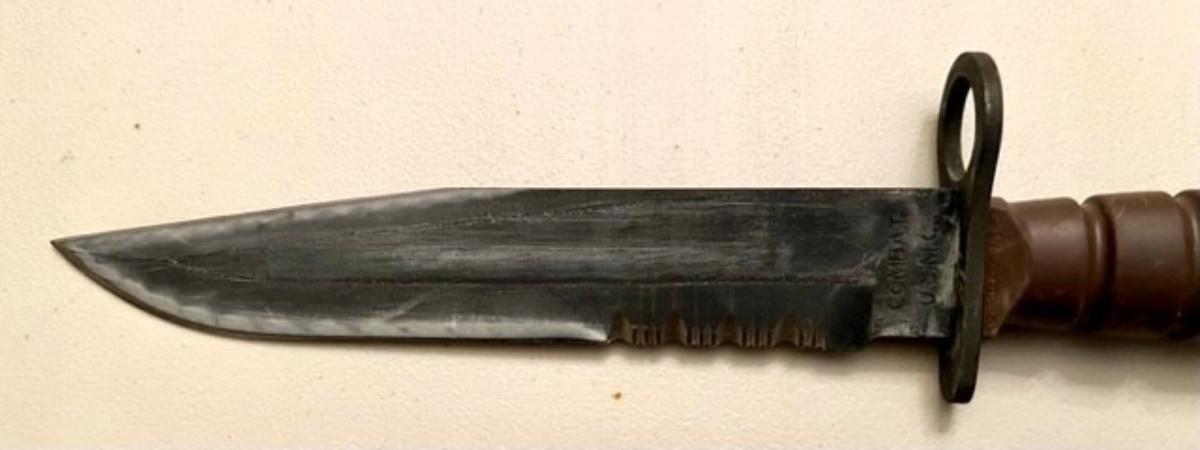 8" blade- serrated drop point black carbon steel. With dynaflex handle. Belived to be combat used and sharpened on both sides. Sold as is