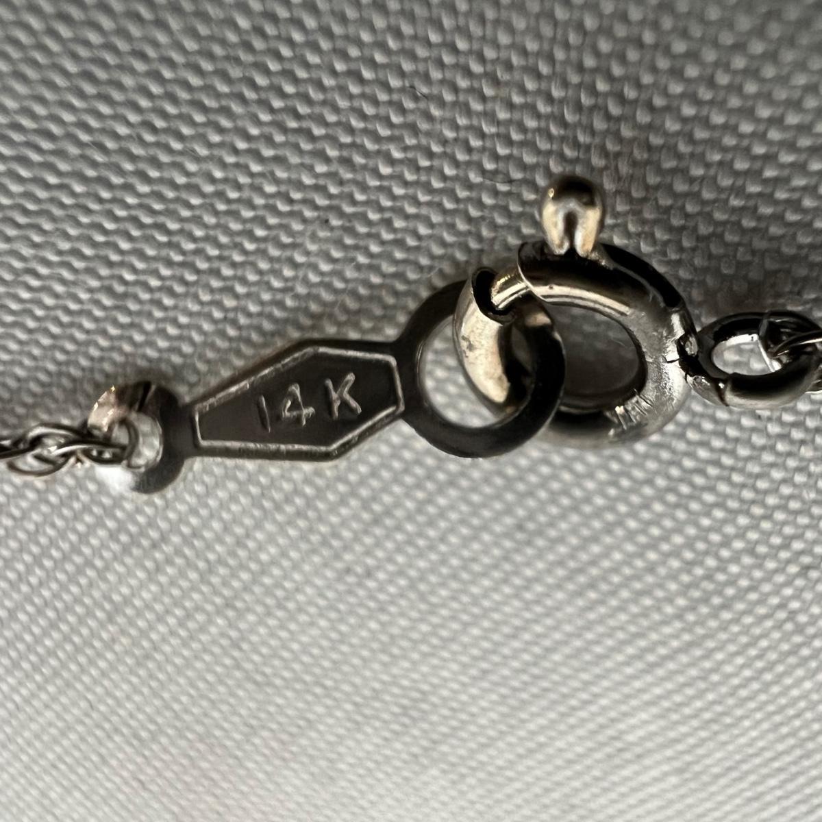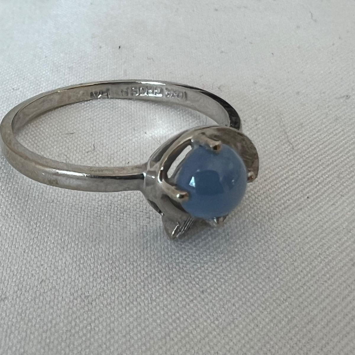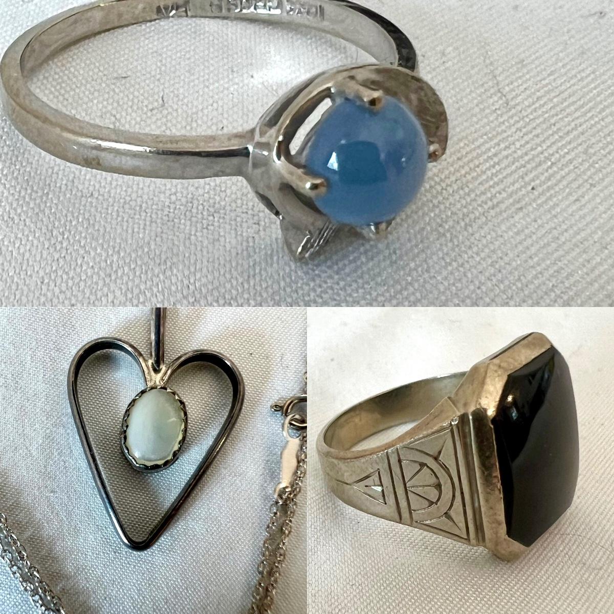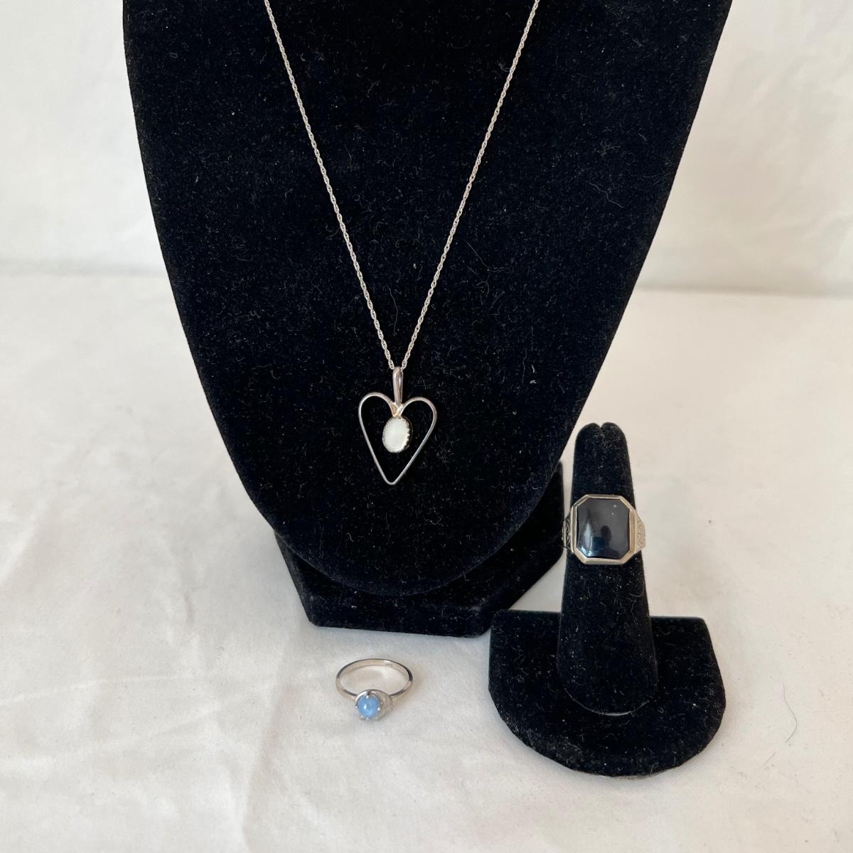 Two rings and a necklace each feature a stone. The large ring has what appears to be a black onyx stone and the other ring has a pretty periwinkle colored stone, the necklace has a pearly white stone; note the pendant has no mark but the chain it is on, is marked 14K as are the two rings. Necklace chain is 18” long. No stones were tested/verified.
