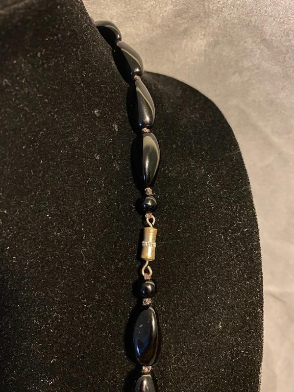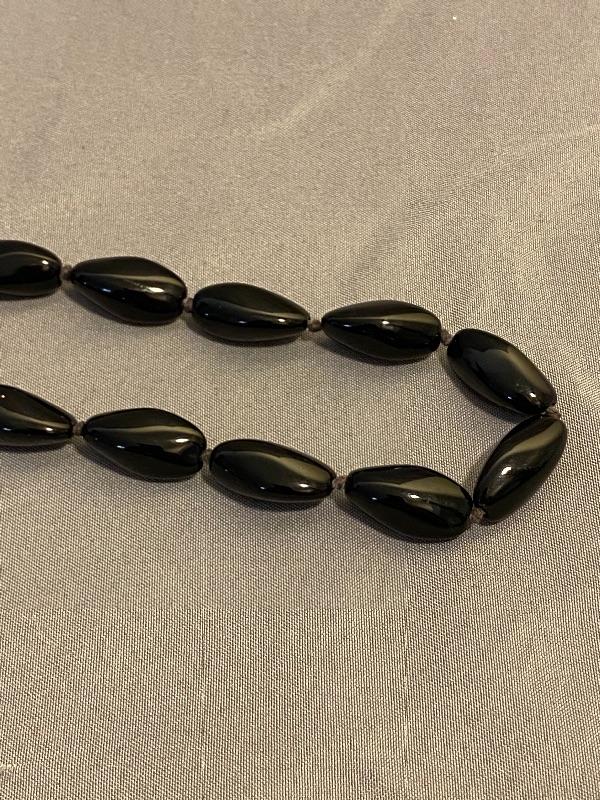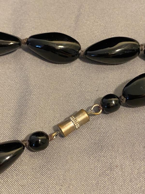 Vintage onyx black glass bead necklace. High shine black beads on thread. Screw together style clasp. Measures 14".