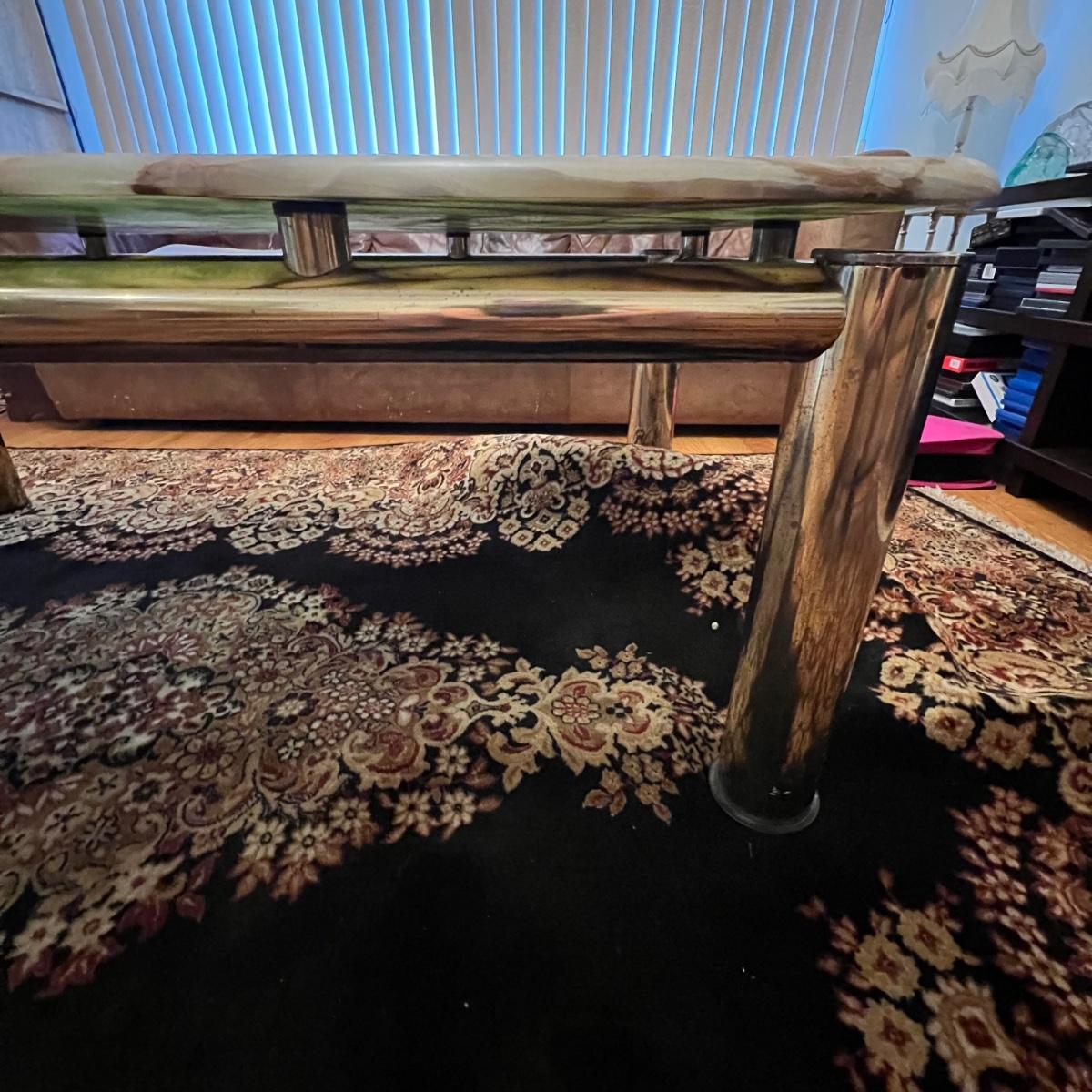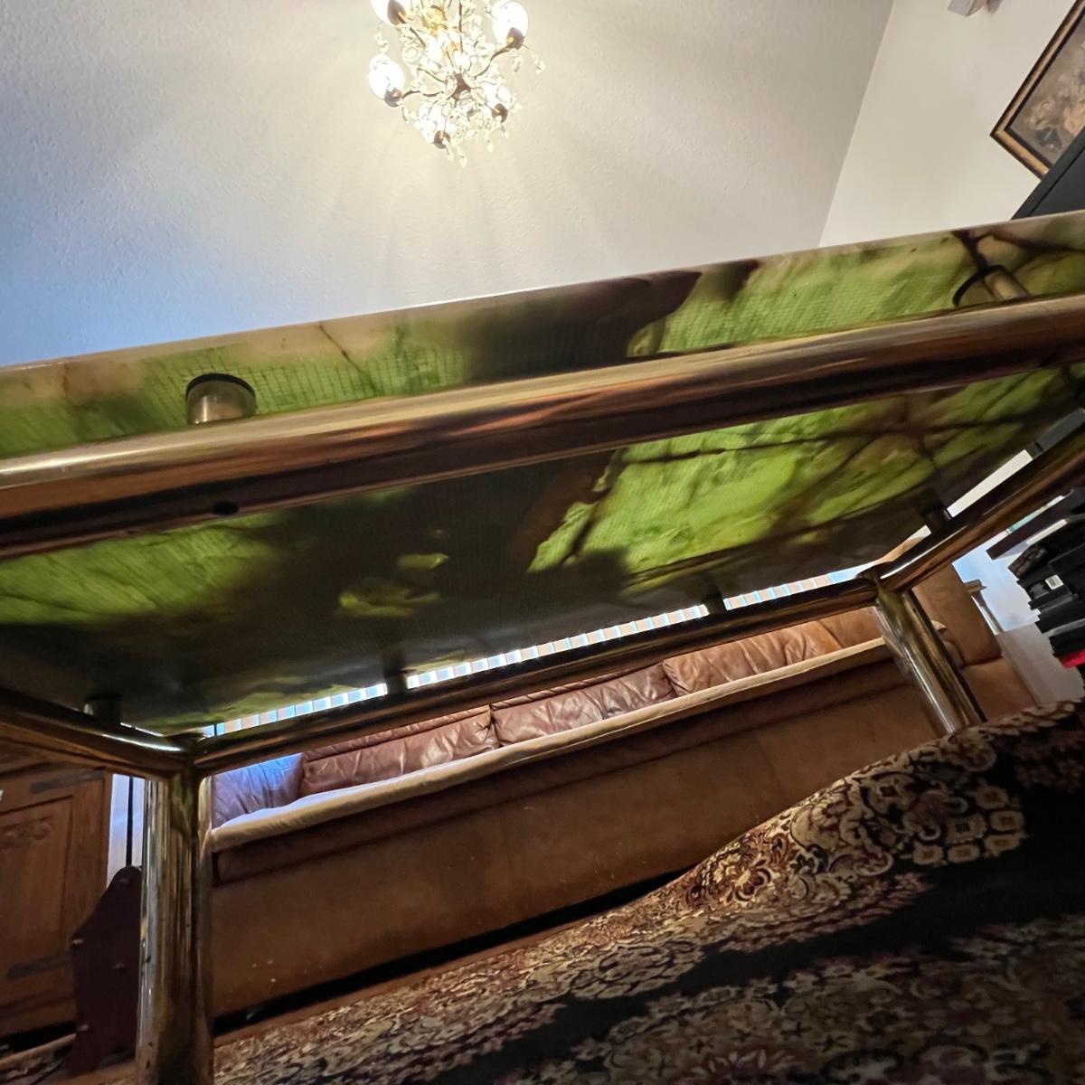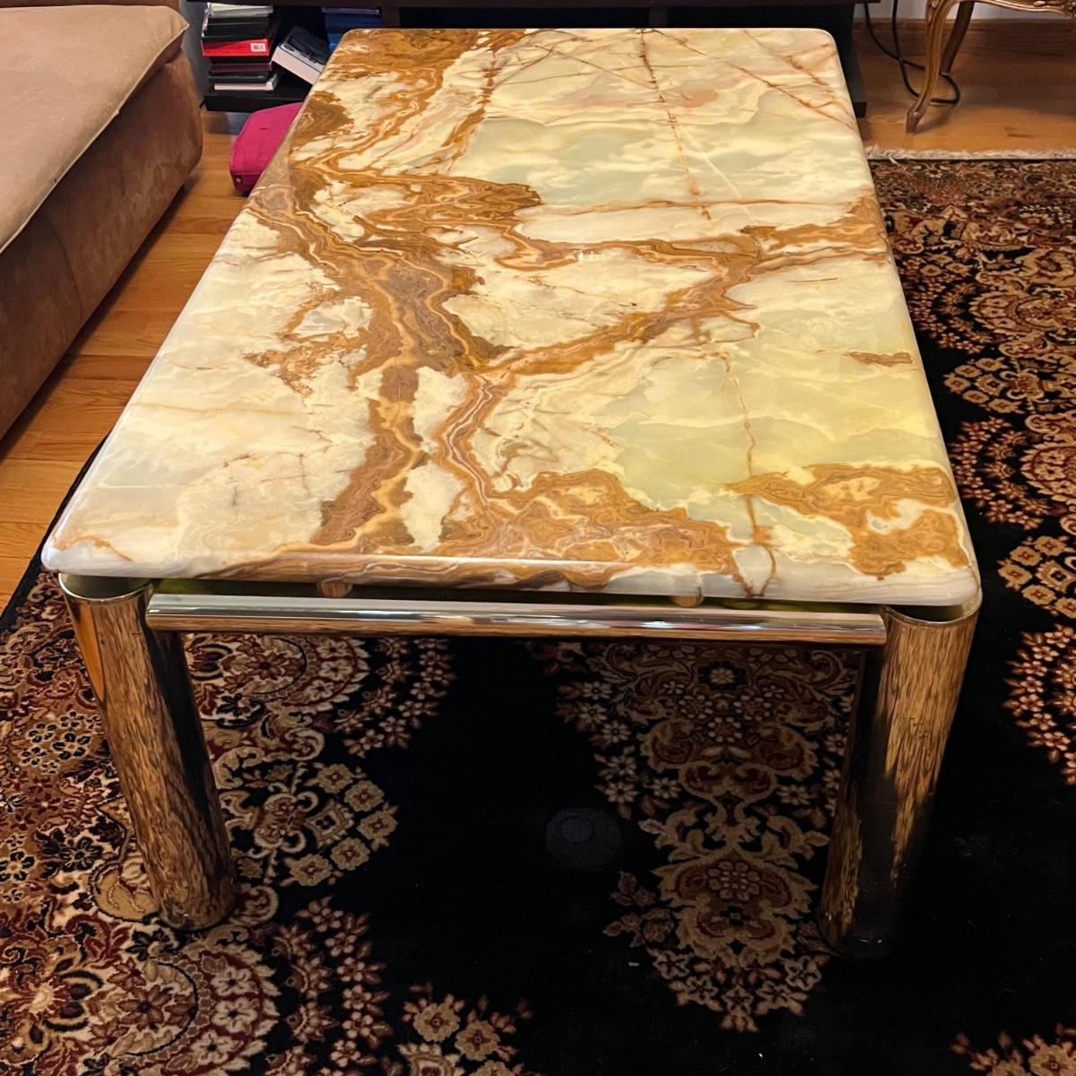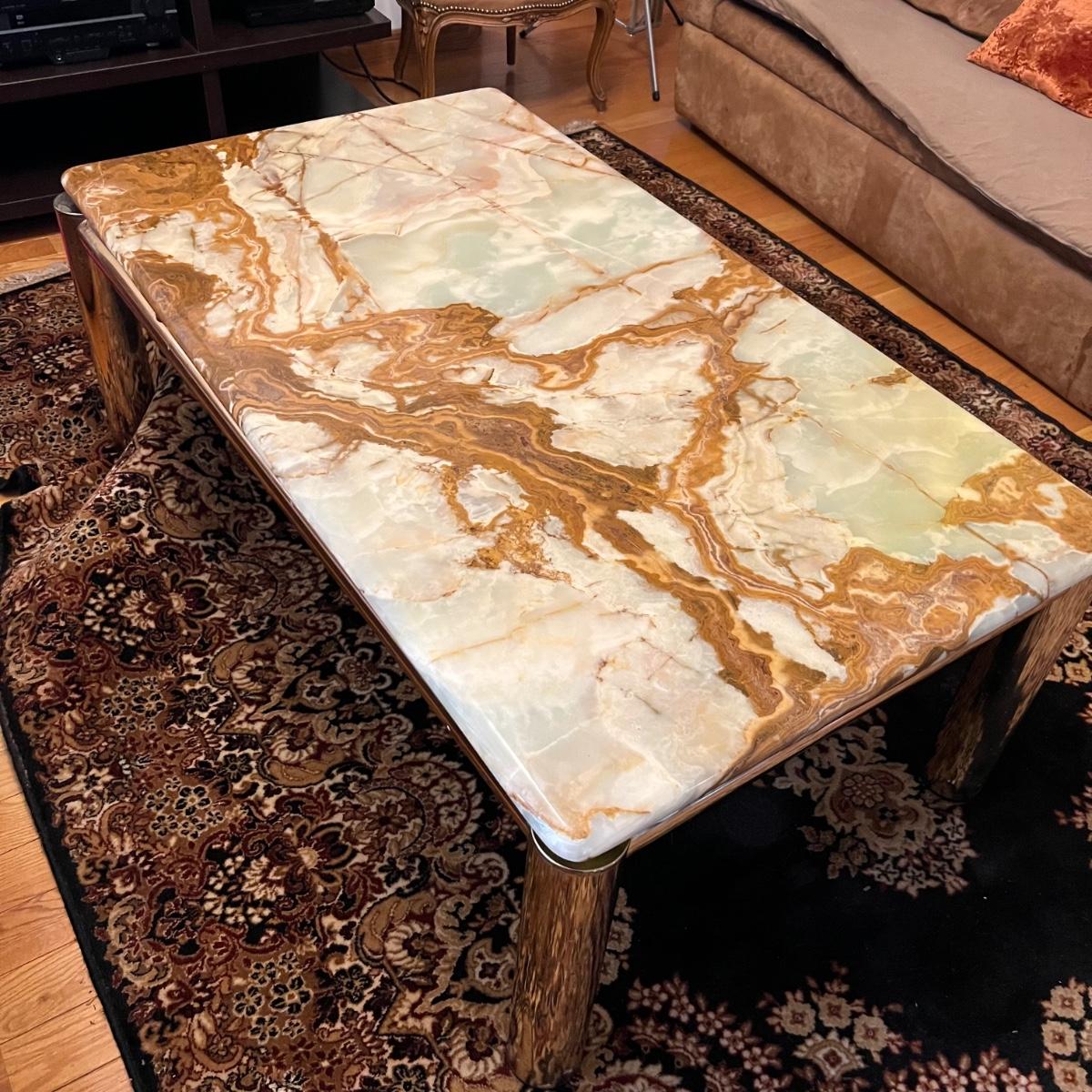 This stunning coffee table features a heavy top which appears to be onyx, it rests on top (detachable) of a brass colored metal modern frame; note there are marks on the legs that appear to be permanent.