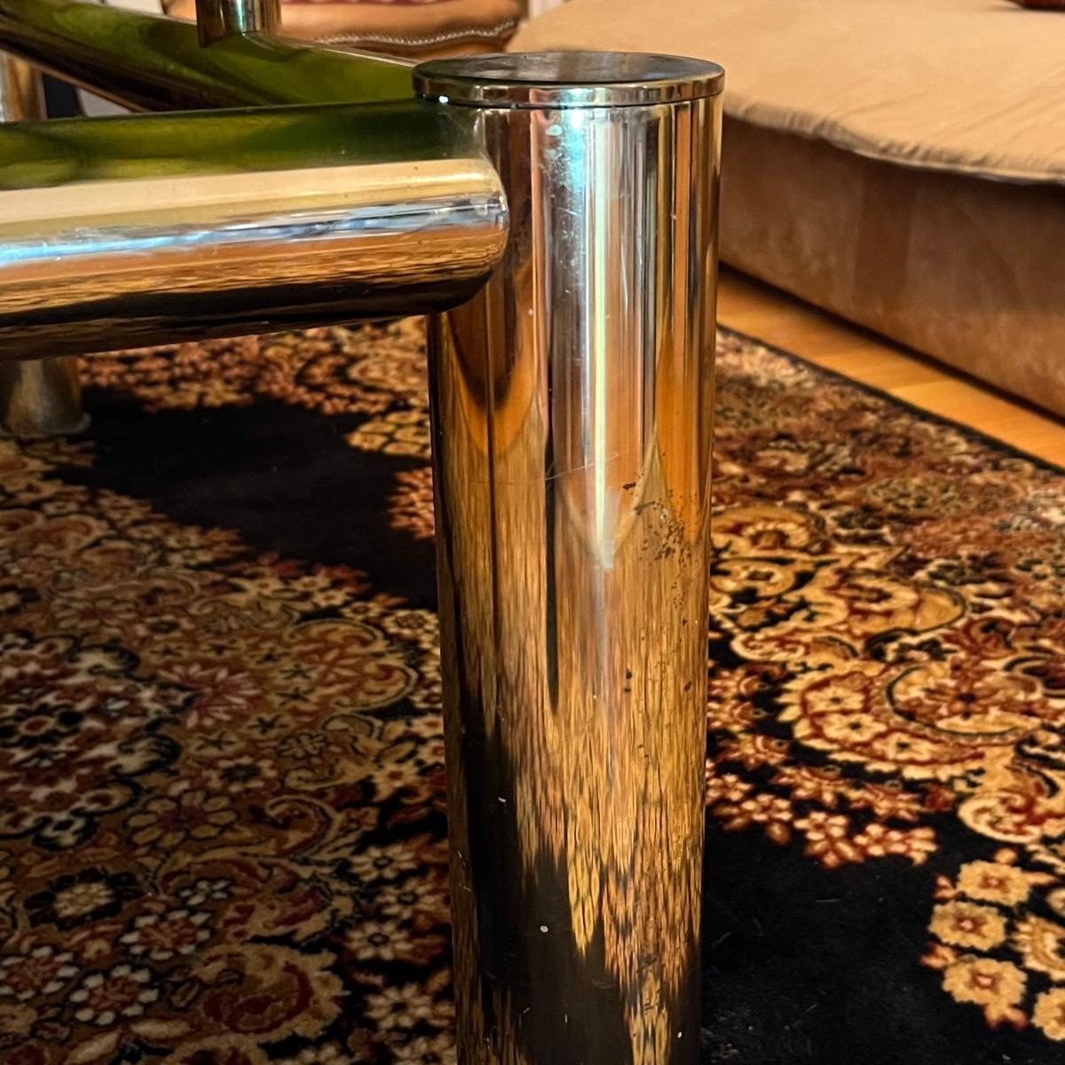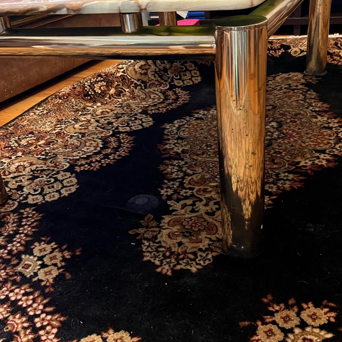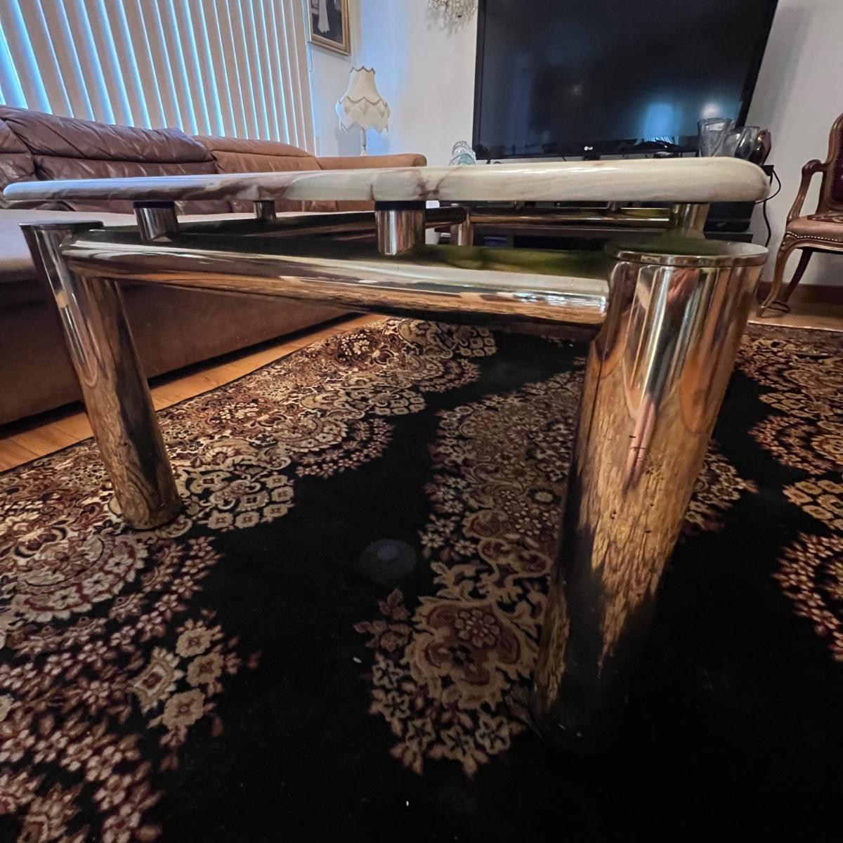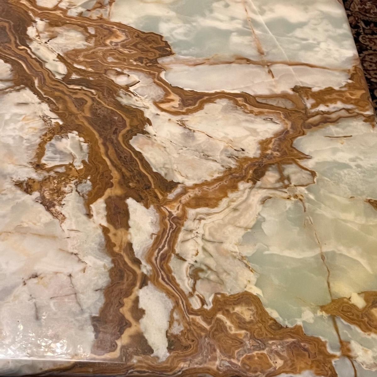 This stunning coffee table features a heavy top which appears to be onyx, it rests on top (detachable) of a brass colored metal modern frame; note there are marks on the legs that appear to be permanent.