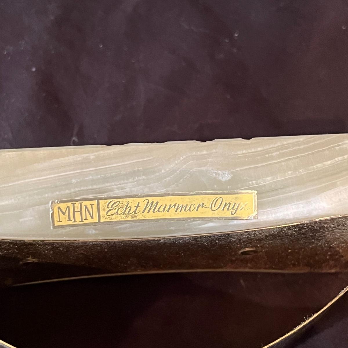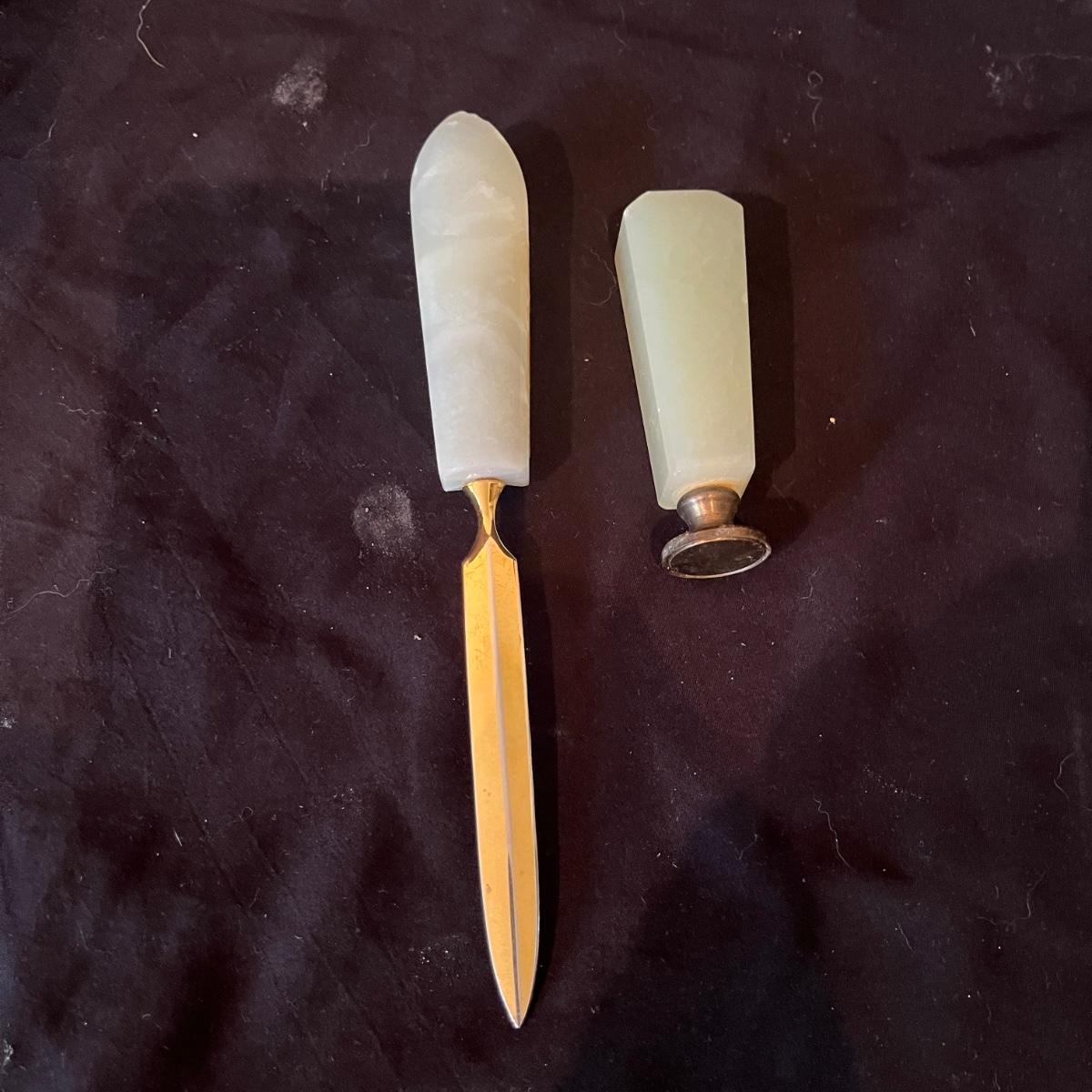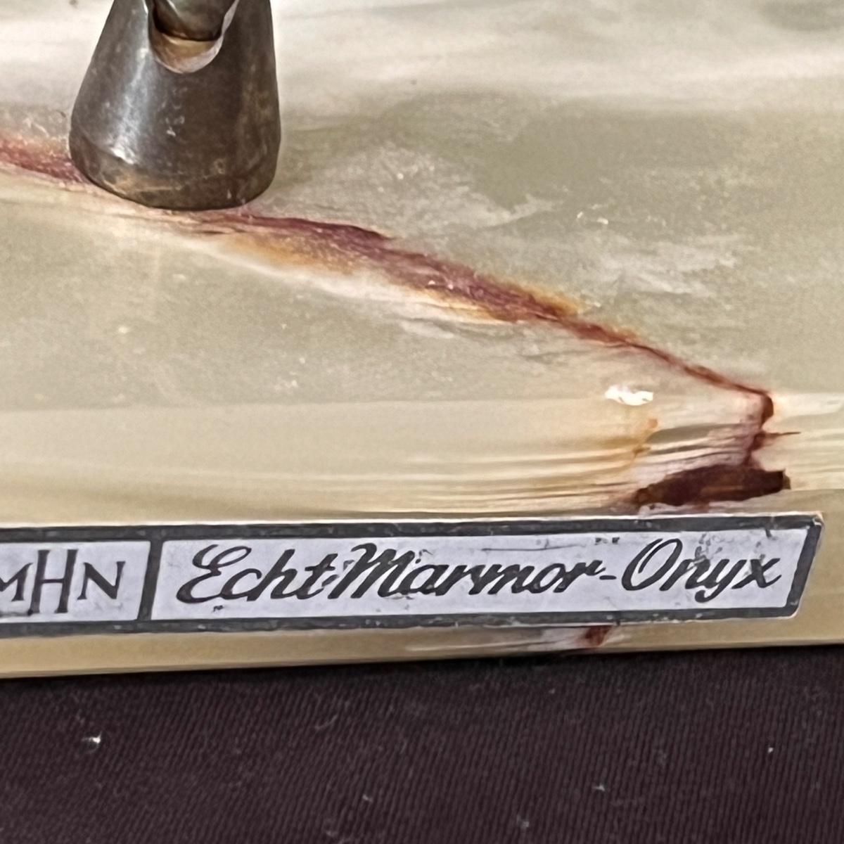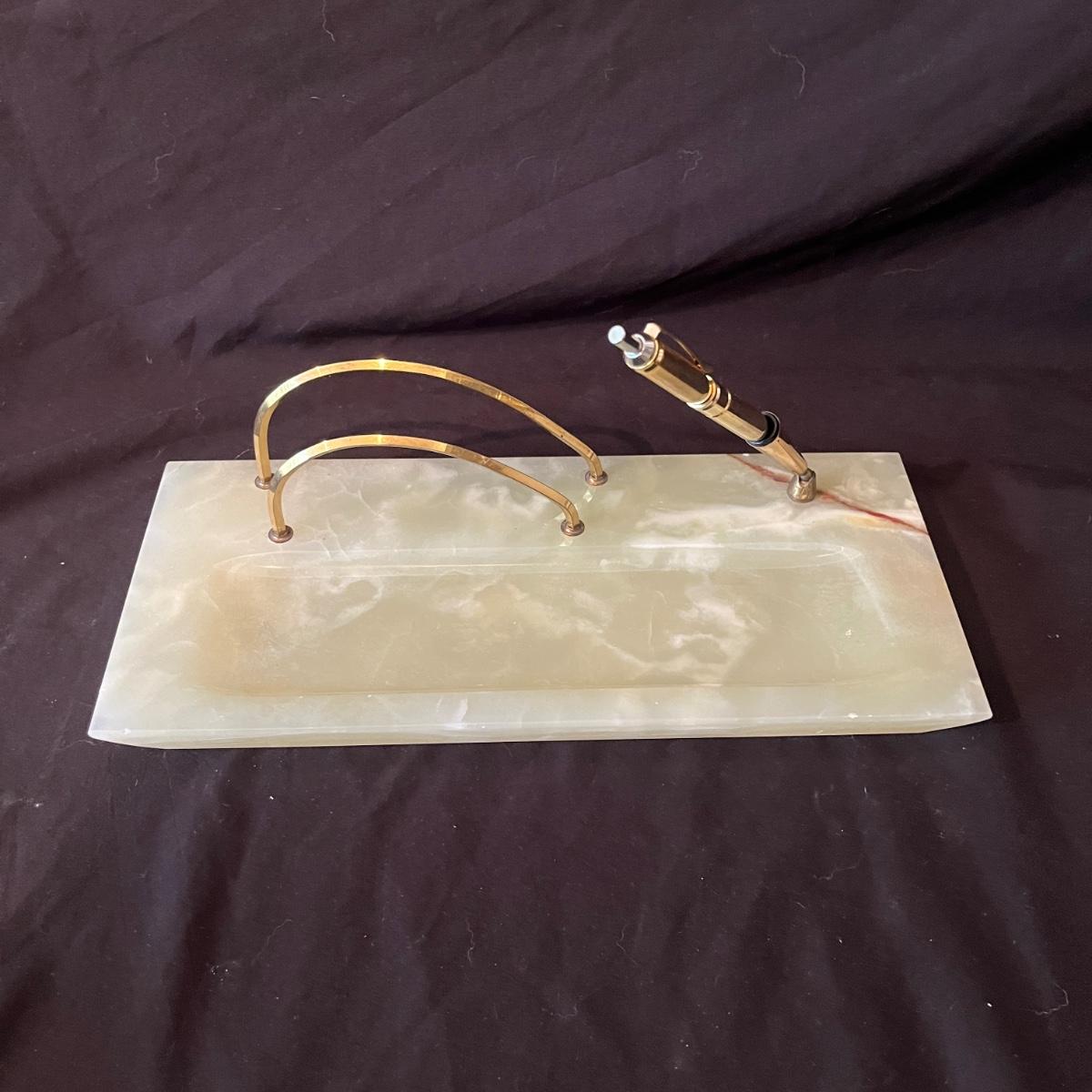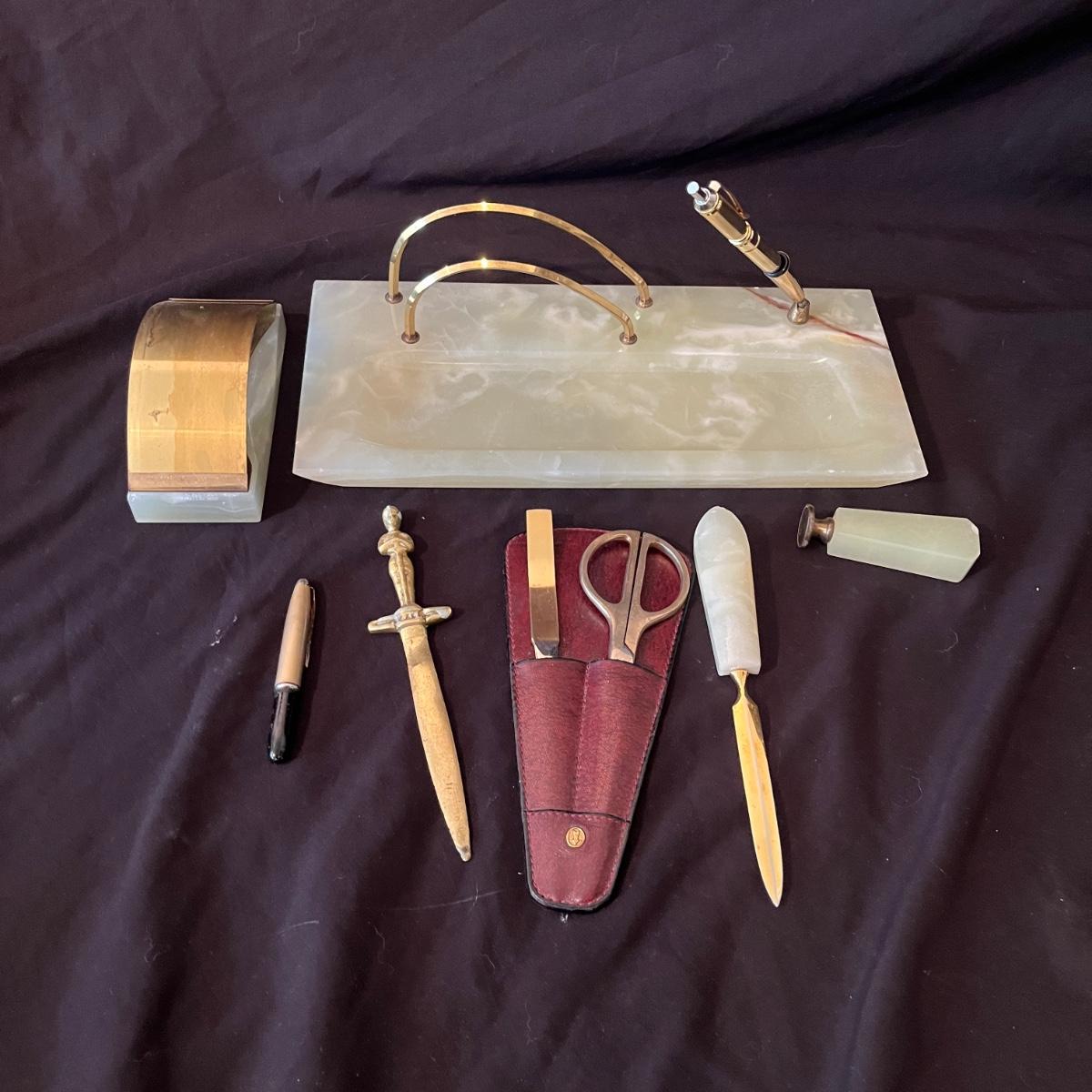 Lot includes an onyx Echt Marmor letter opener, onyx ink blotter, onyx pen and letter holder, scissors and letter opener set, two pens and a brass letter opener. Onyx desk piece measures 5.5” x 12.5” x 3.5”H.