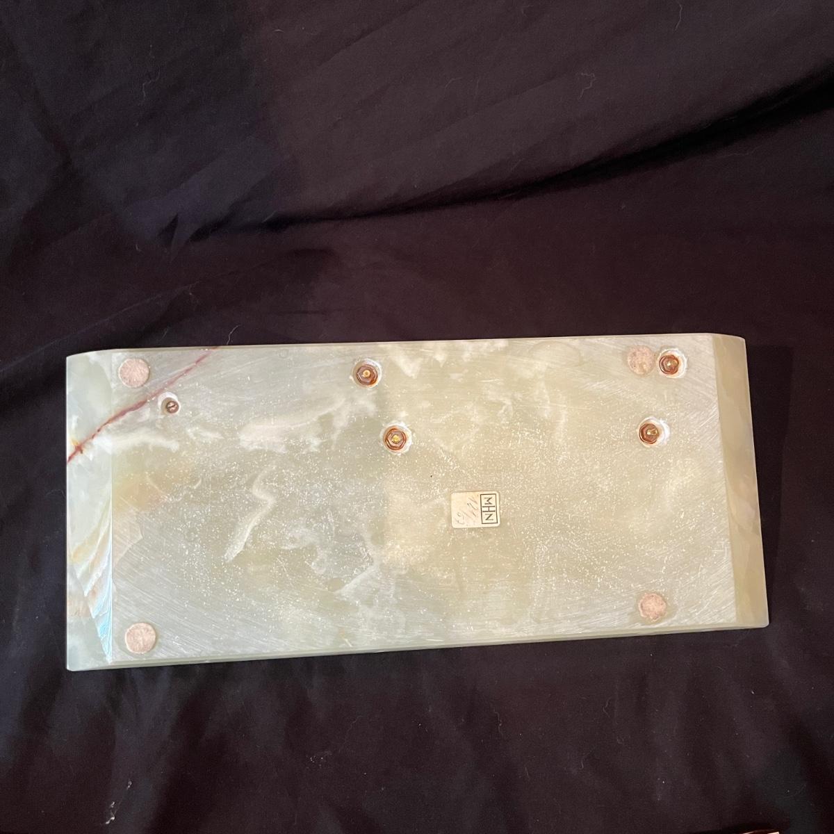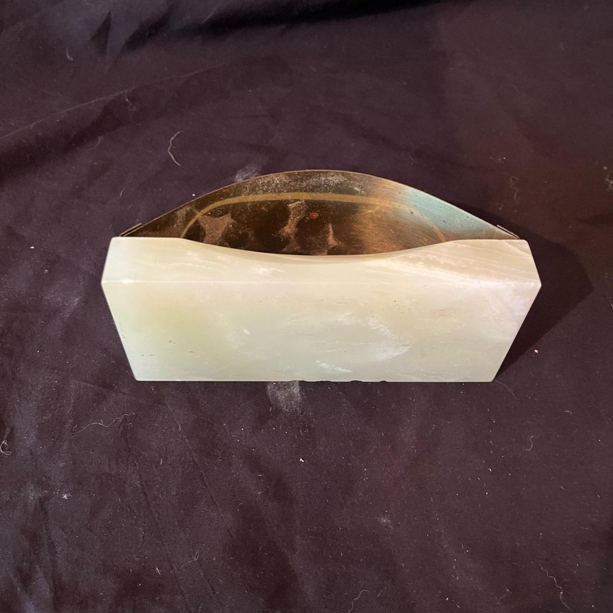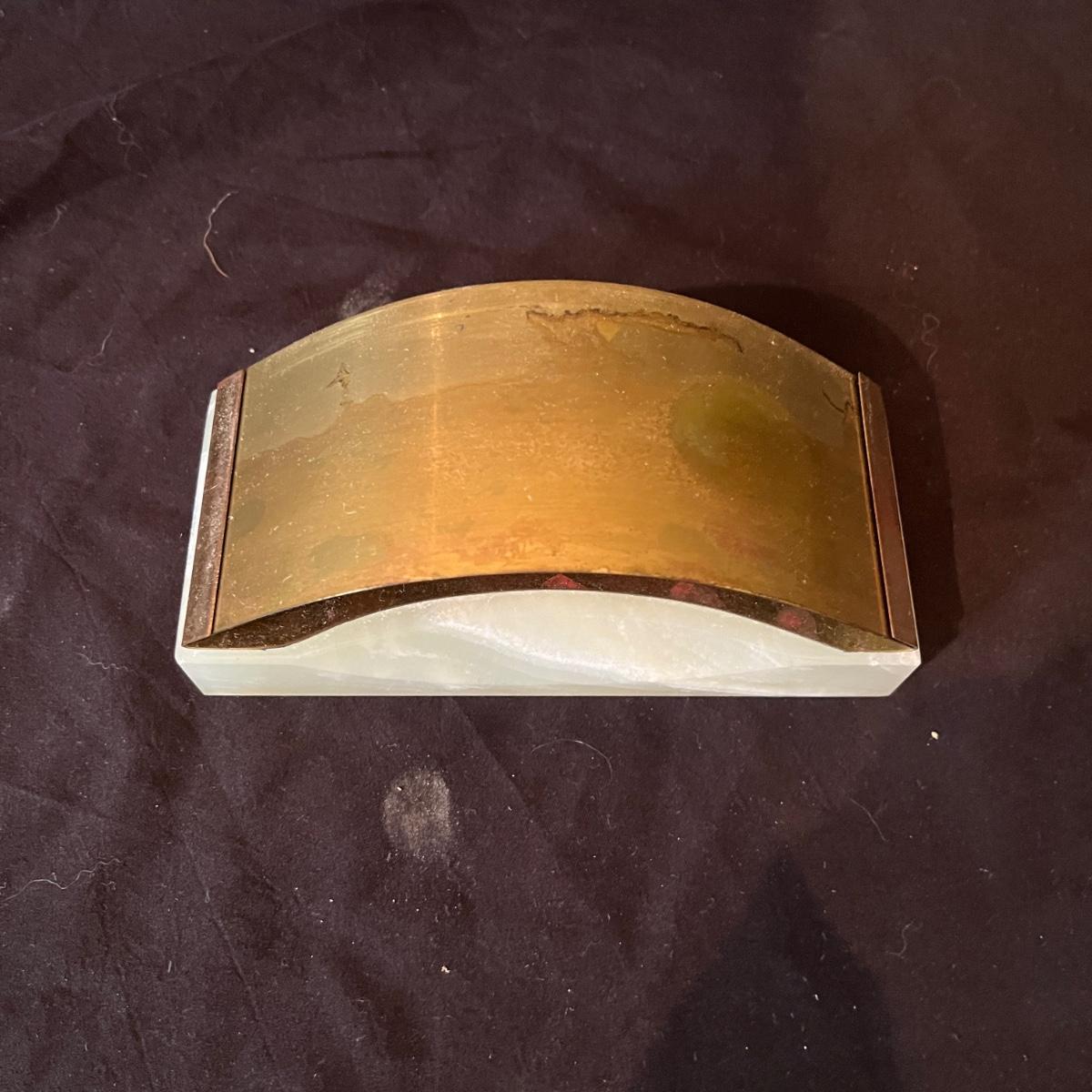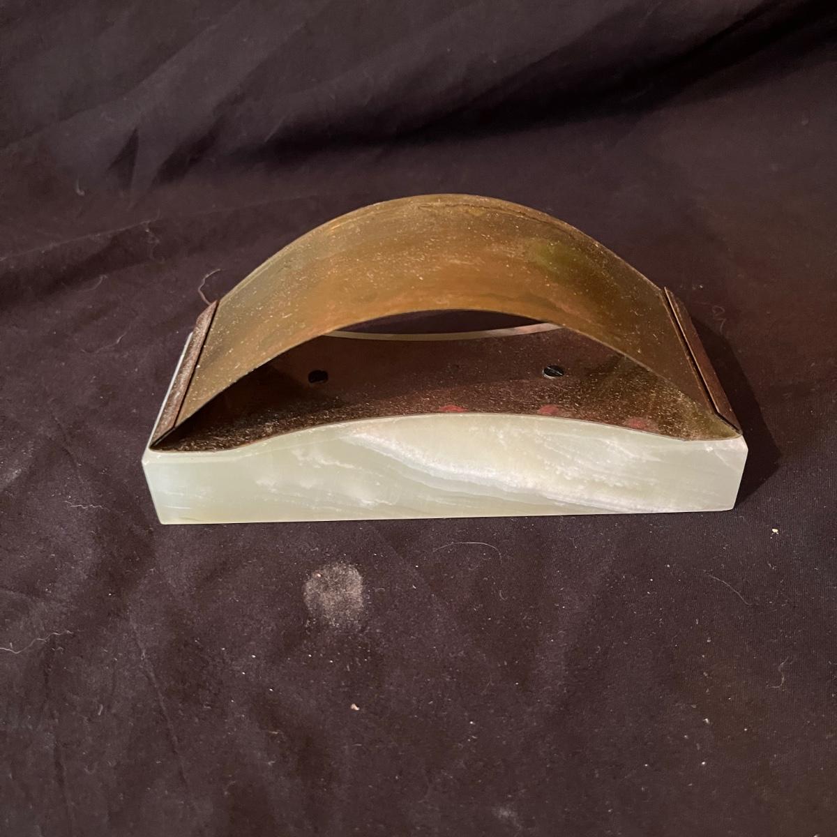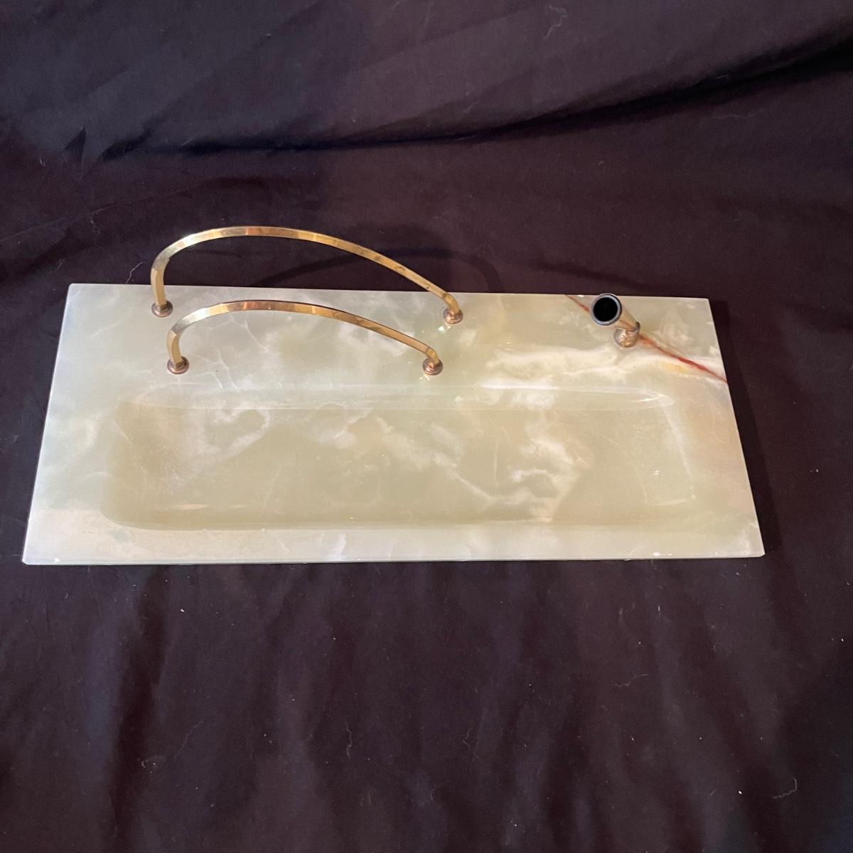 Lot includes an onyx Echt Marmor letter opener, onyx ink blotter, onyx pen and letter holder, scissors and letter opener set, two pens and a brass letter opener. Onyx desk piece measures 5.5” x 12.5” x 3.5”H.