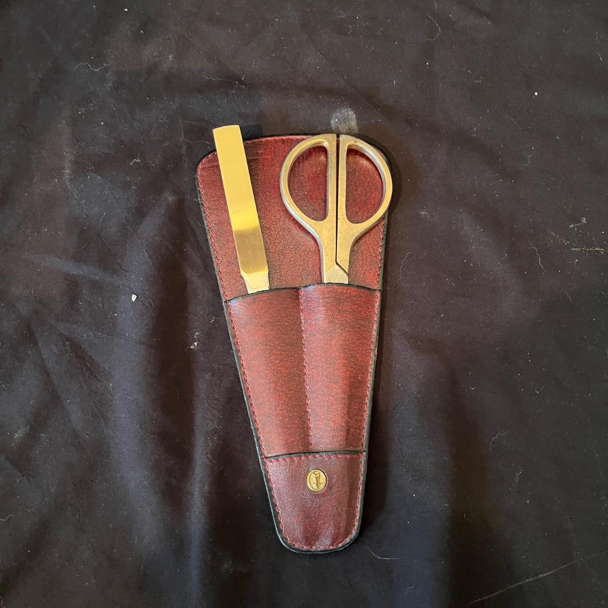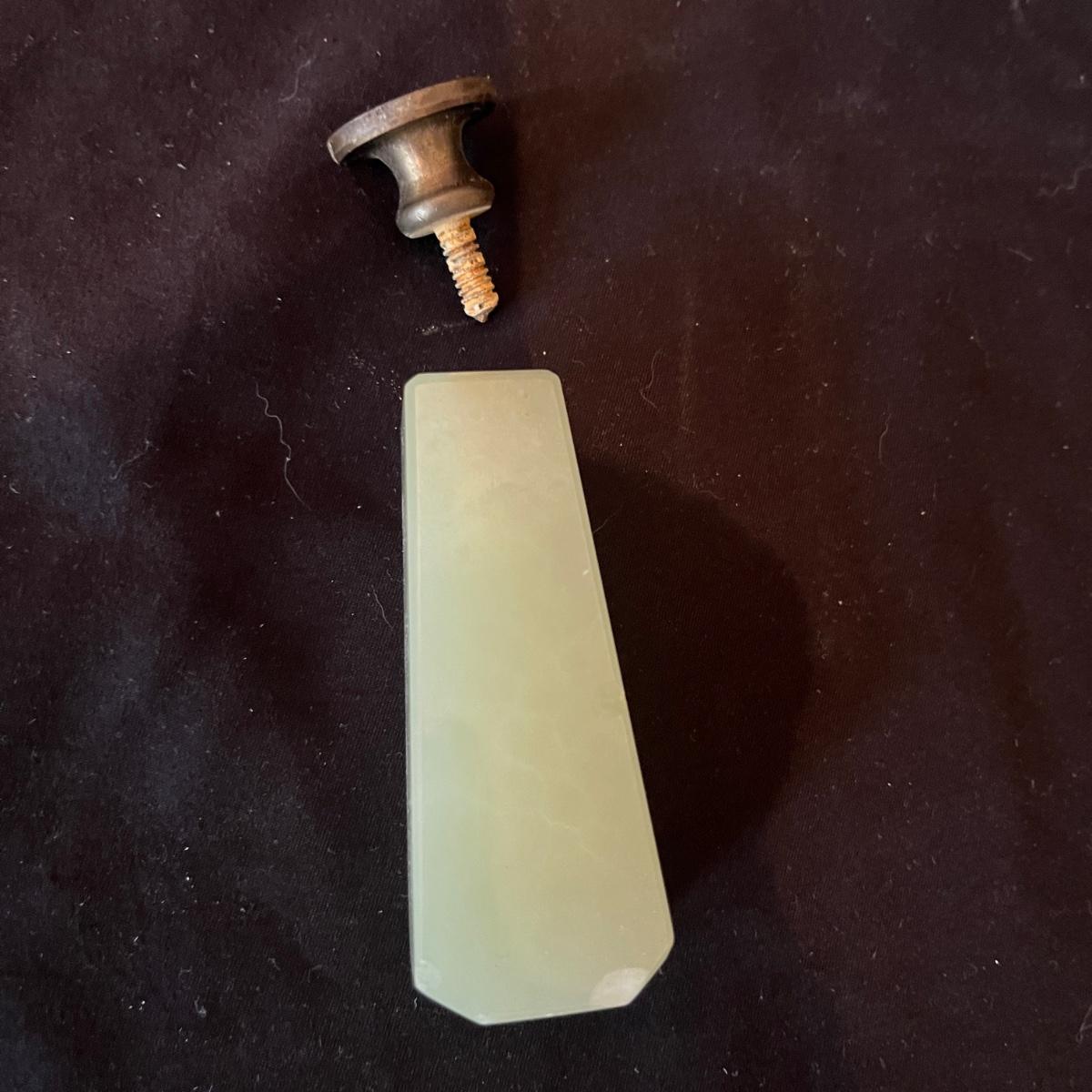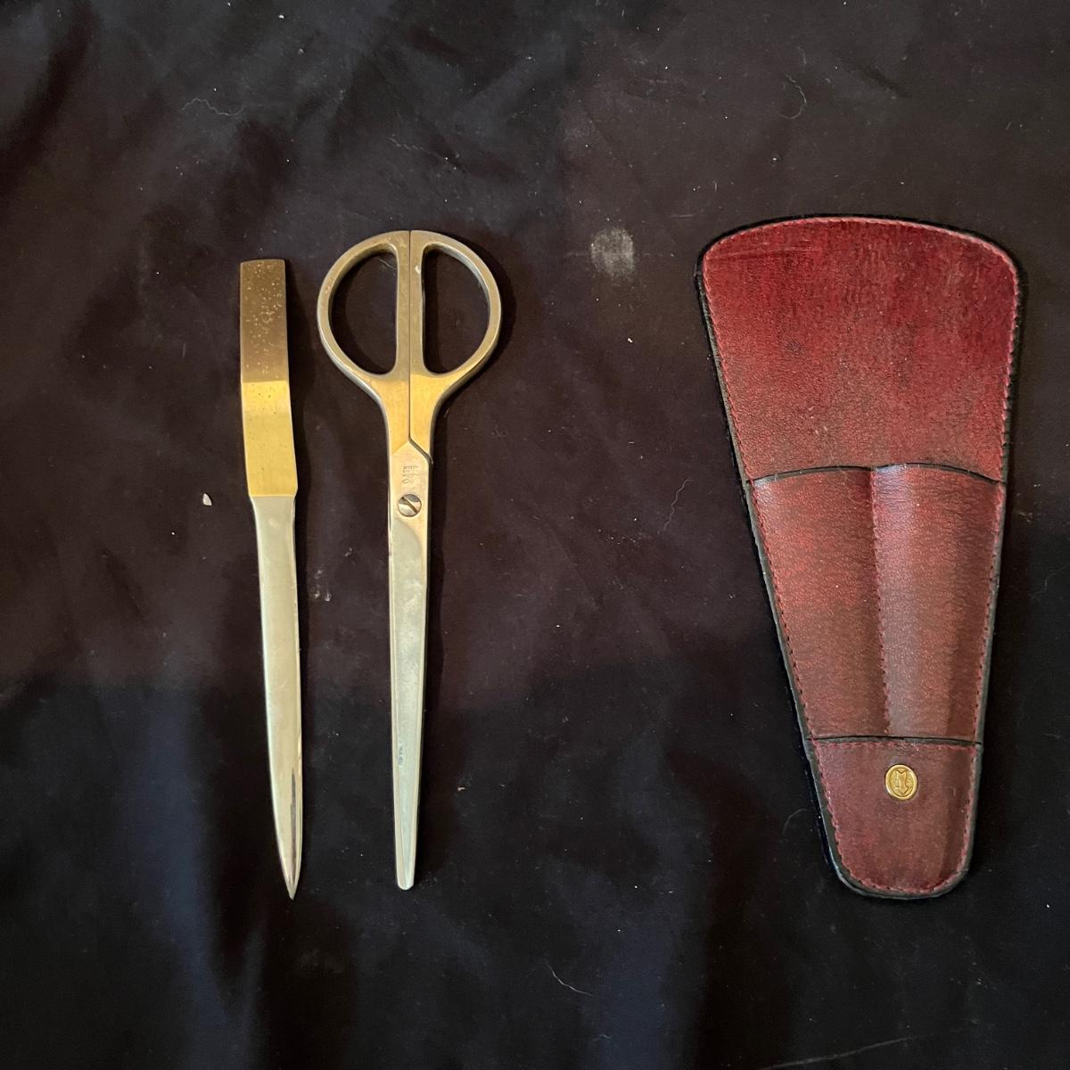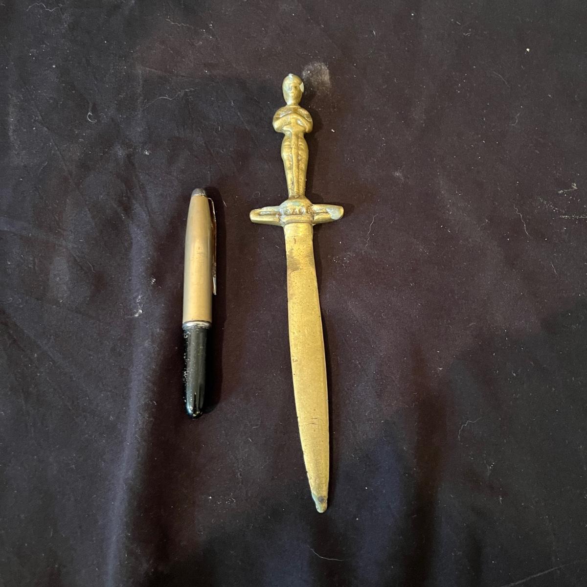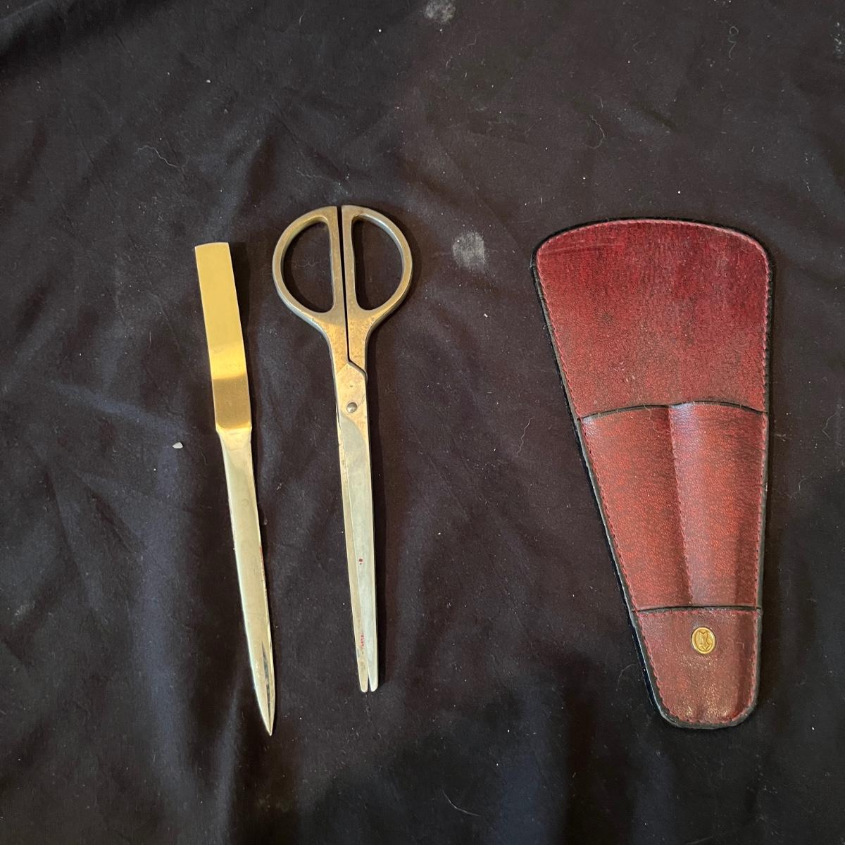 Lot includes an onyx Echt Marmor letter opener, onyx ink blotter, onyx pen and letter holder, scissors and letter opener set, two pens and a brass letter opener. Onyx desk piece measures 5.5” x 12.5” x 3.5”H.