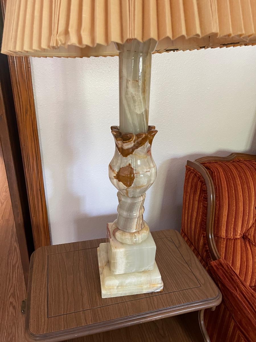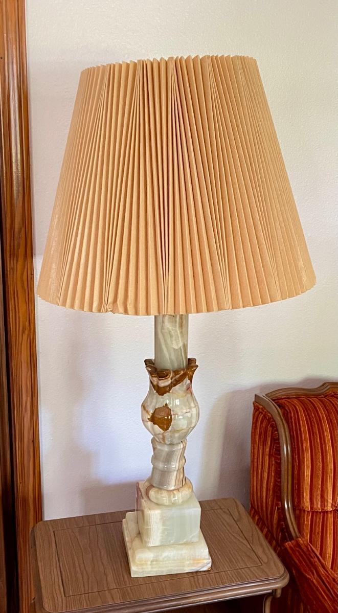 Carved onyx lamp. Interesting details. Purchased while traveling in Mexico 36" tall with 6" base