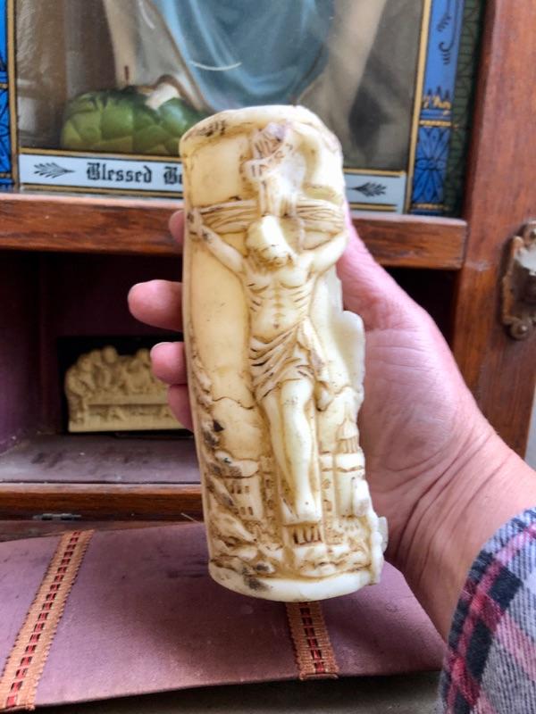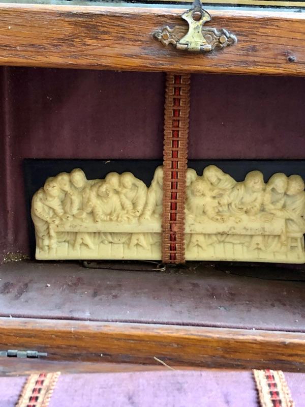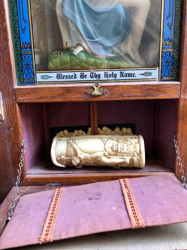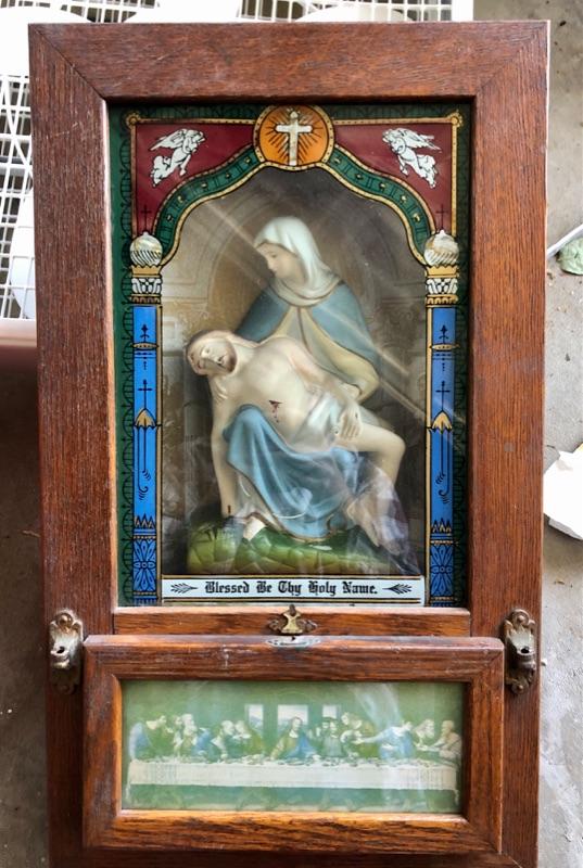 Vintage Catholic wall shrine. Has a bottom compartment for holding items.