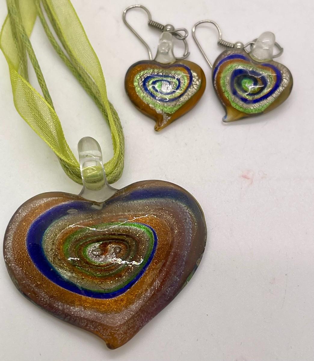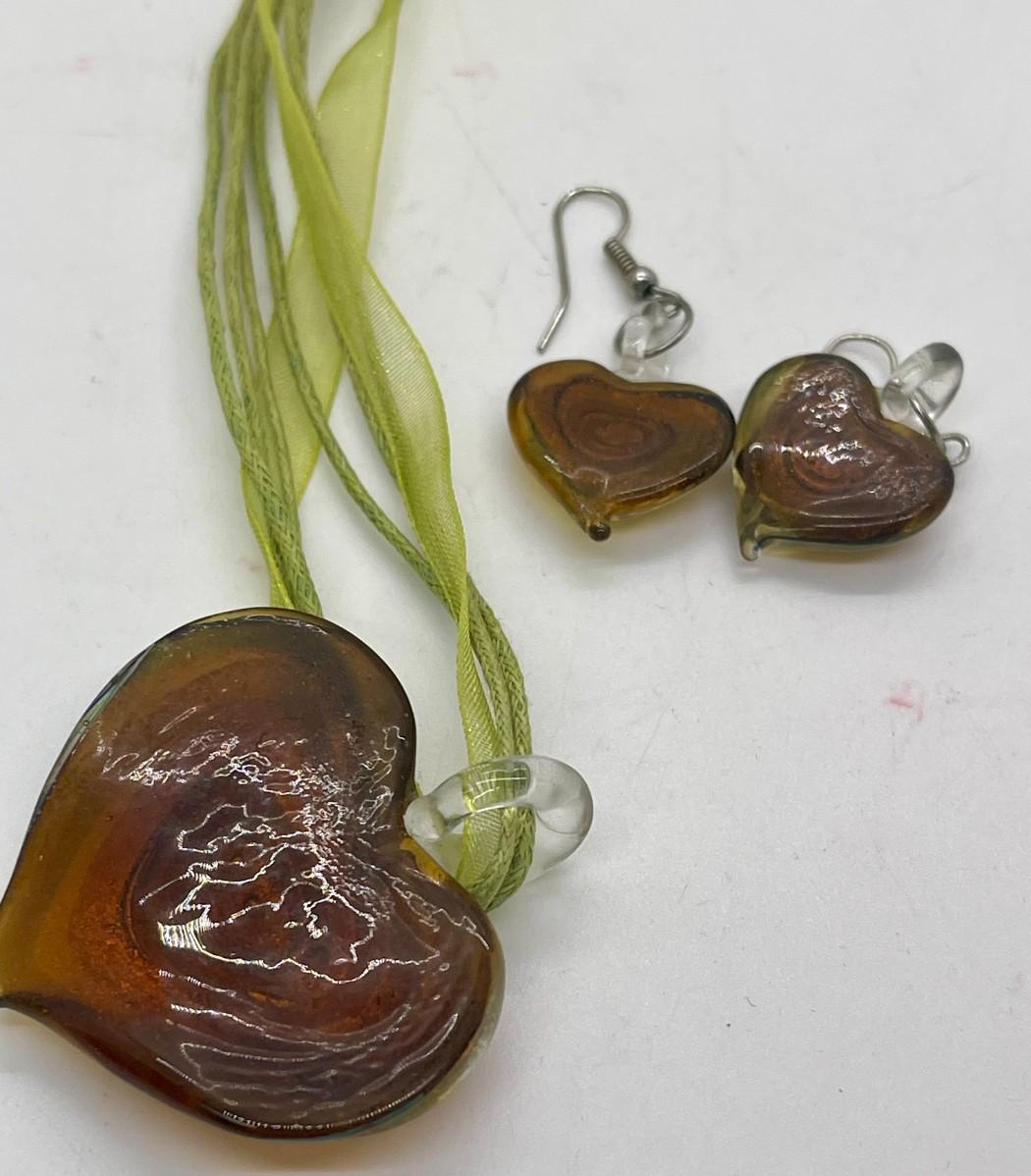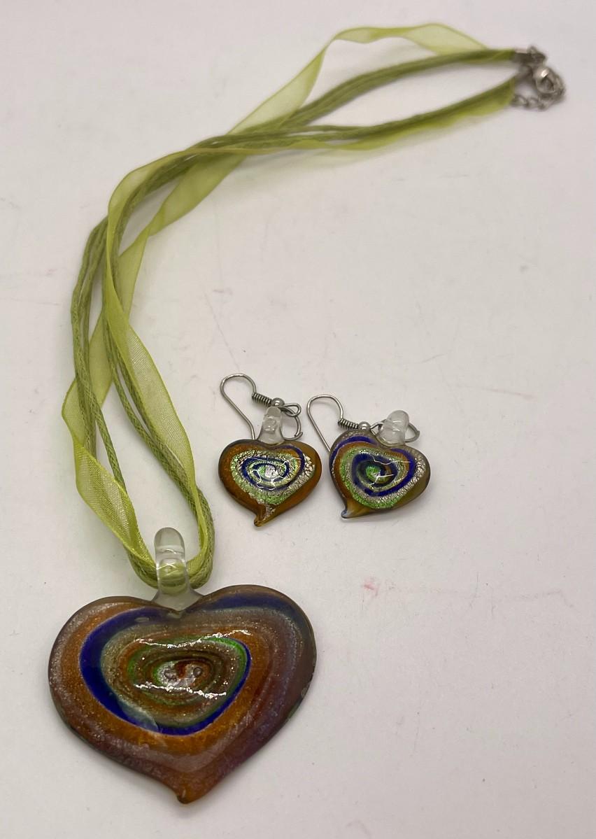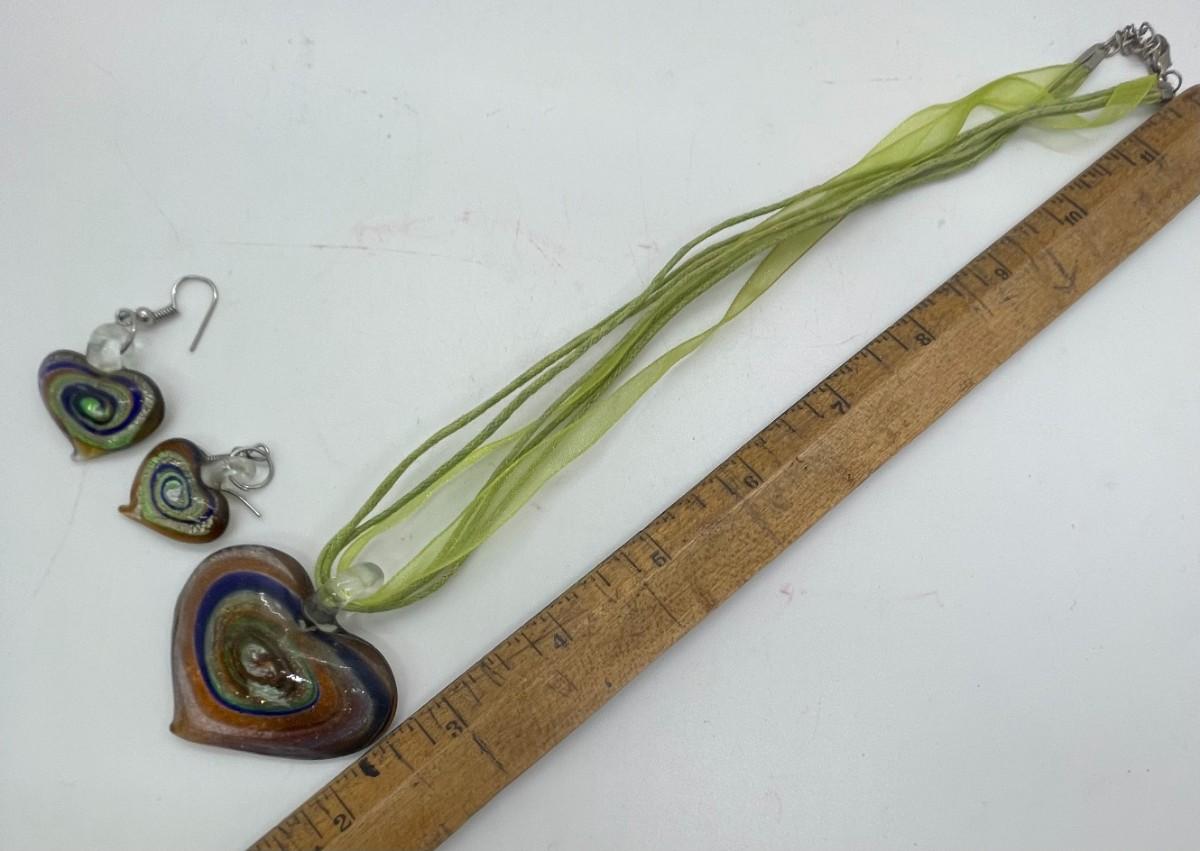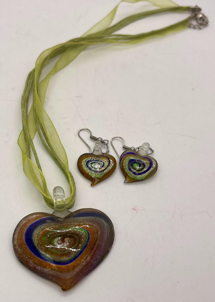 Green Ribbon Necklace with Glass Heart Pendant and pair of matching Earrings