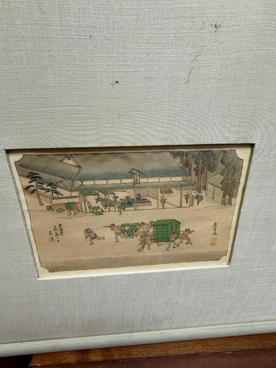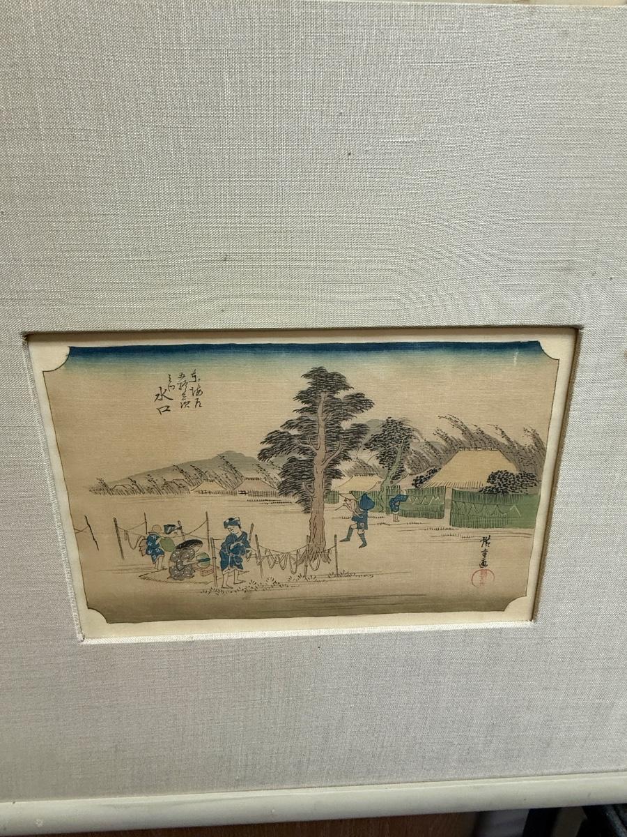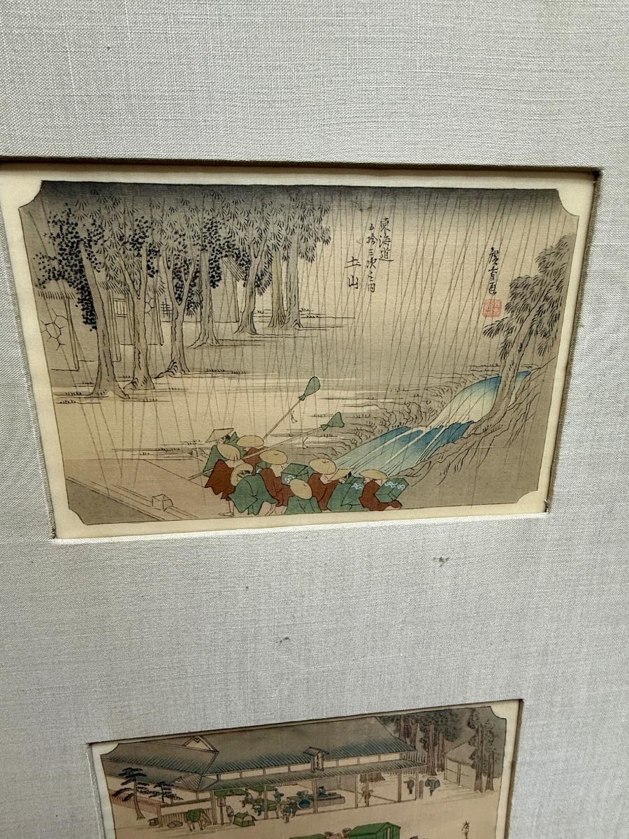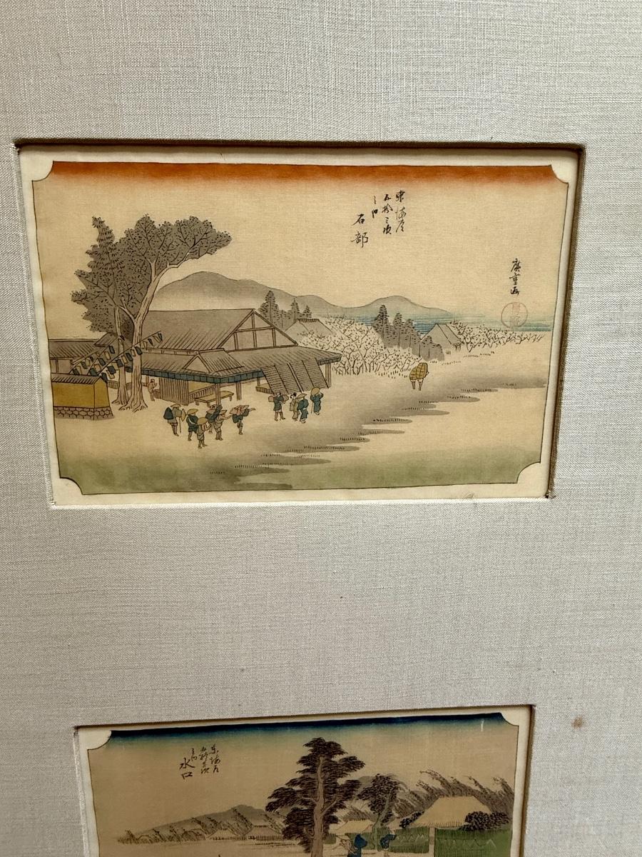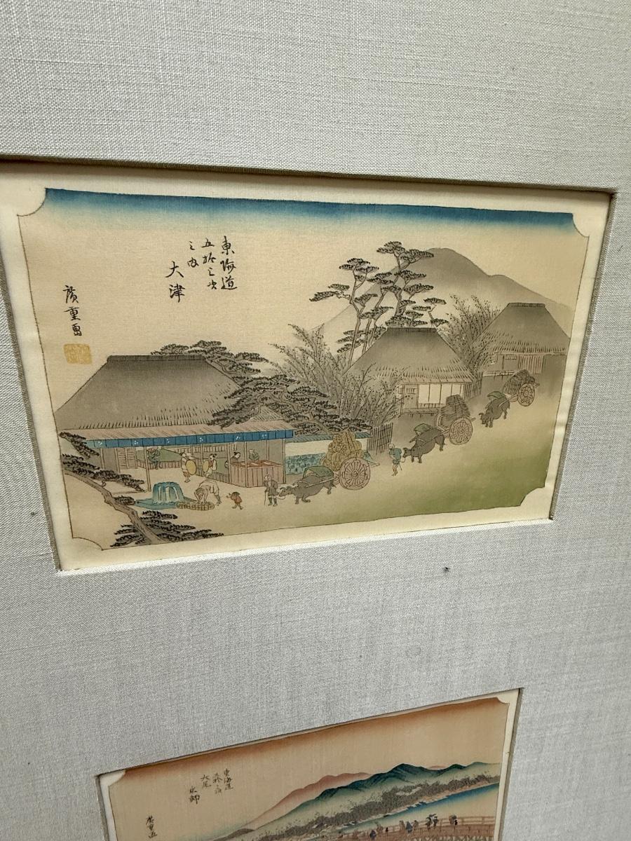 Reproductions of woodblock prints by Utagawa Hiroshige (1797-1858). Each print is approx. 10” x 7”. Overall framed size is approx. 54” x 29”.