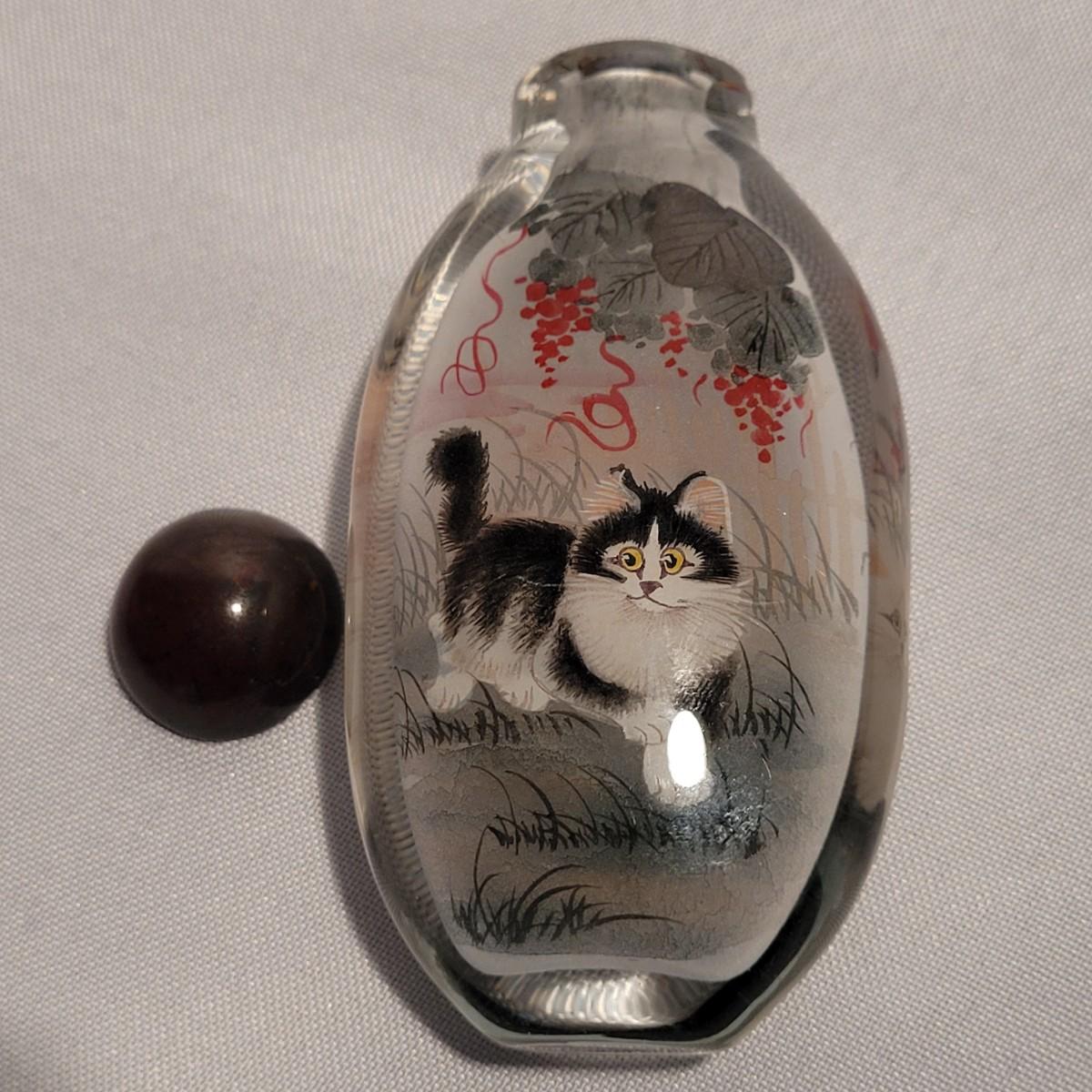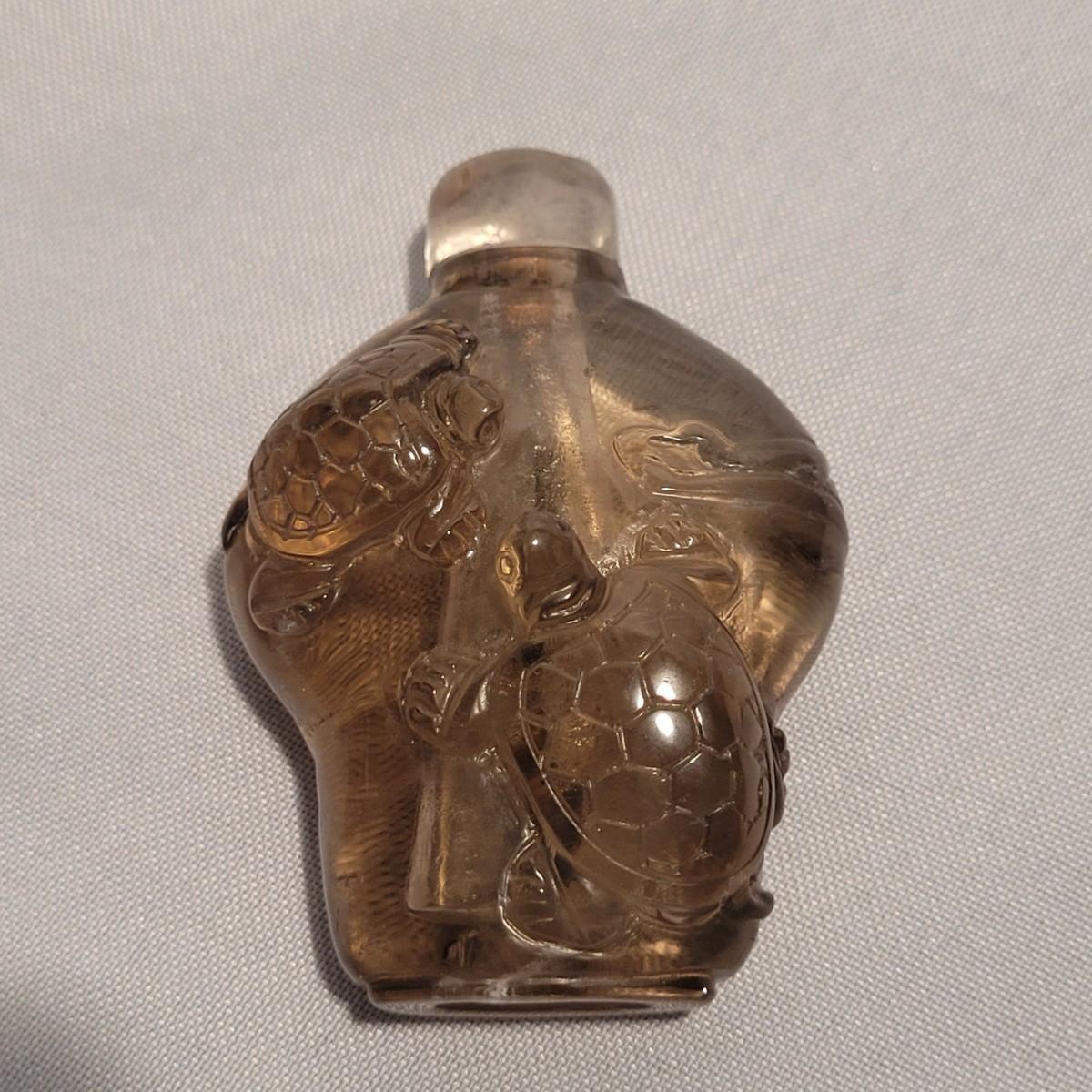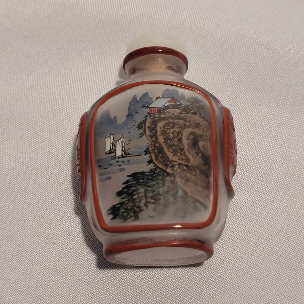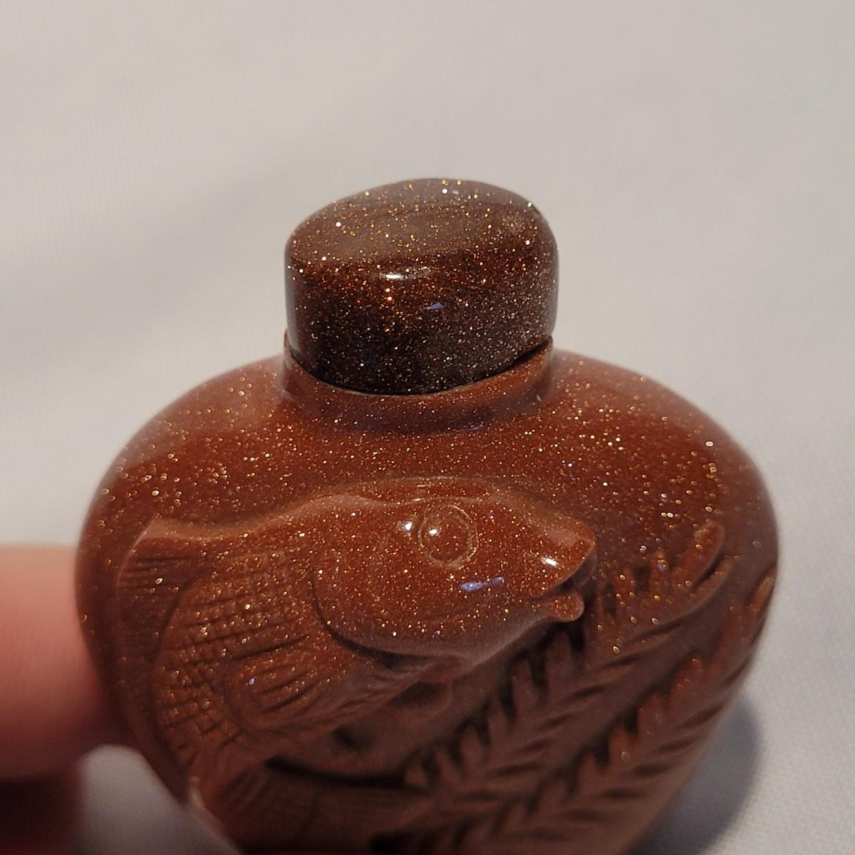 This lot includes six unique snuff bottles made from various materials. The most notable of the lot is the iridescent bottle that appears to be made of opal. It is slender and depicts a fish and lily pad. Its cap and scoop are intact and it is resting on a wooden platform. The rest of the bottles appear to be made from glass or resin and depict different animals and scenery. See photos for more detail on individual items. All bottles measure under 2" x 2" x 3.5"H.