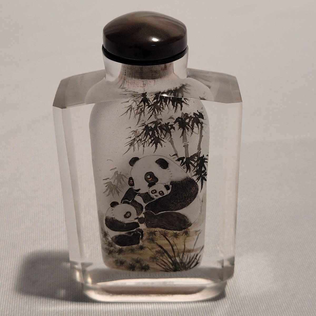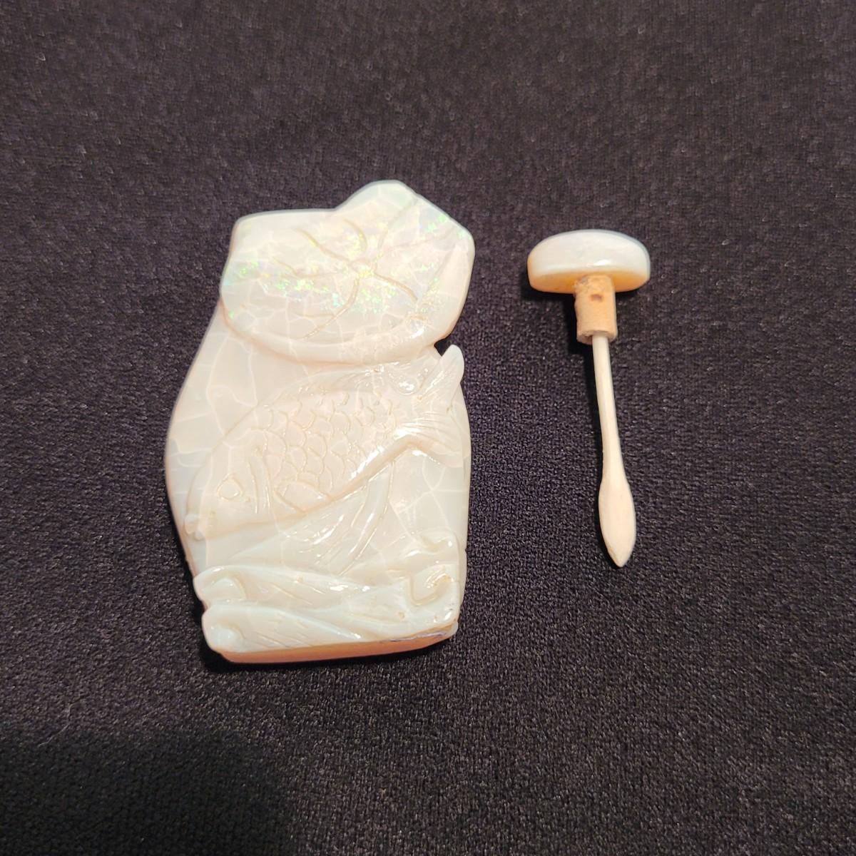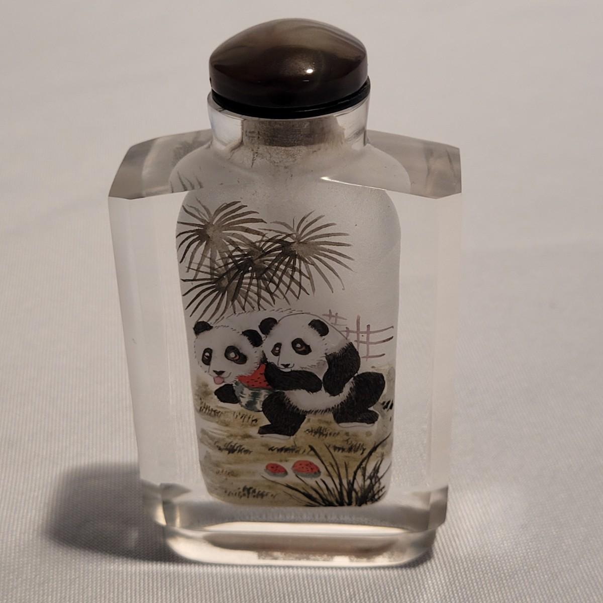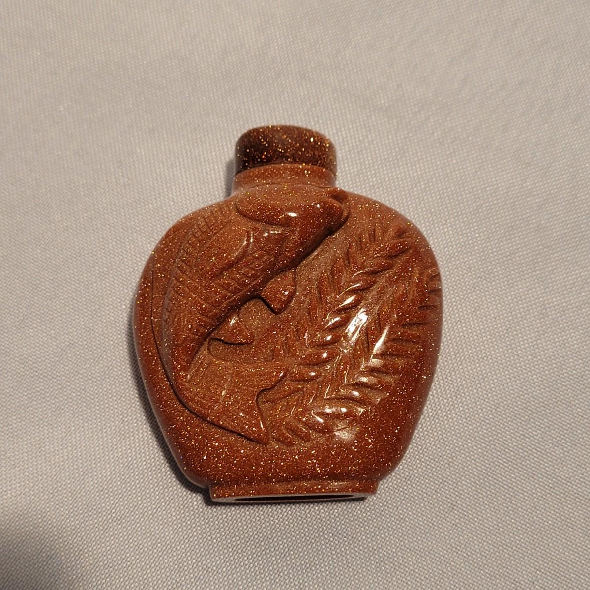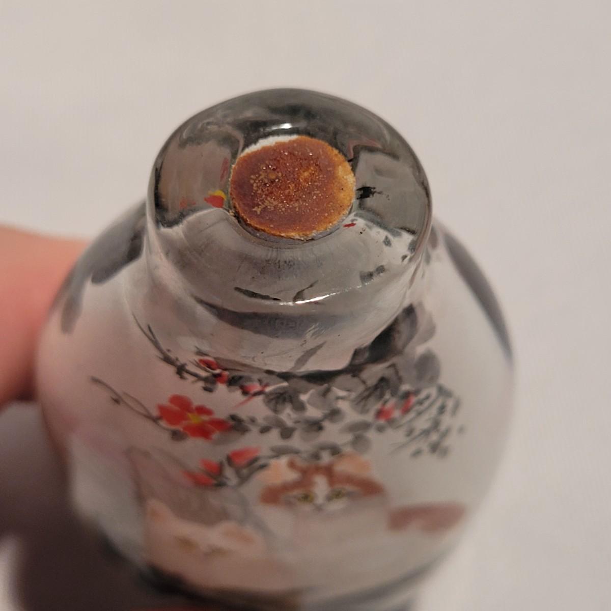 This lot includes six unique snuff bottles made from various materials. The most notable of the lot is the iridescent bottle that appears to be made of opal. It is slender and depicts a fish and lily pad. Its cap and scoop are intact and it is resting on a wooden platform. The rest of the bottles appear to be made from glass or resin and depict different animals and scenery. See photos for more detail on individual items. All bottles measure under 2" x 2" x 3.5"H.