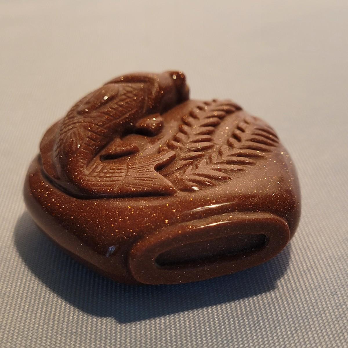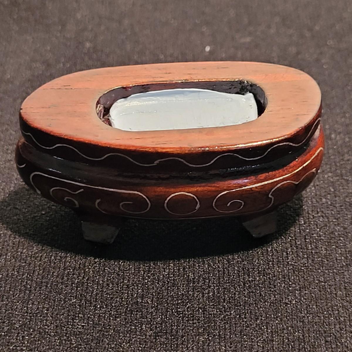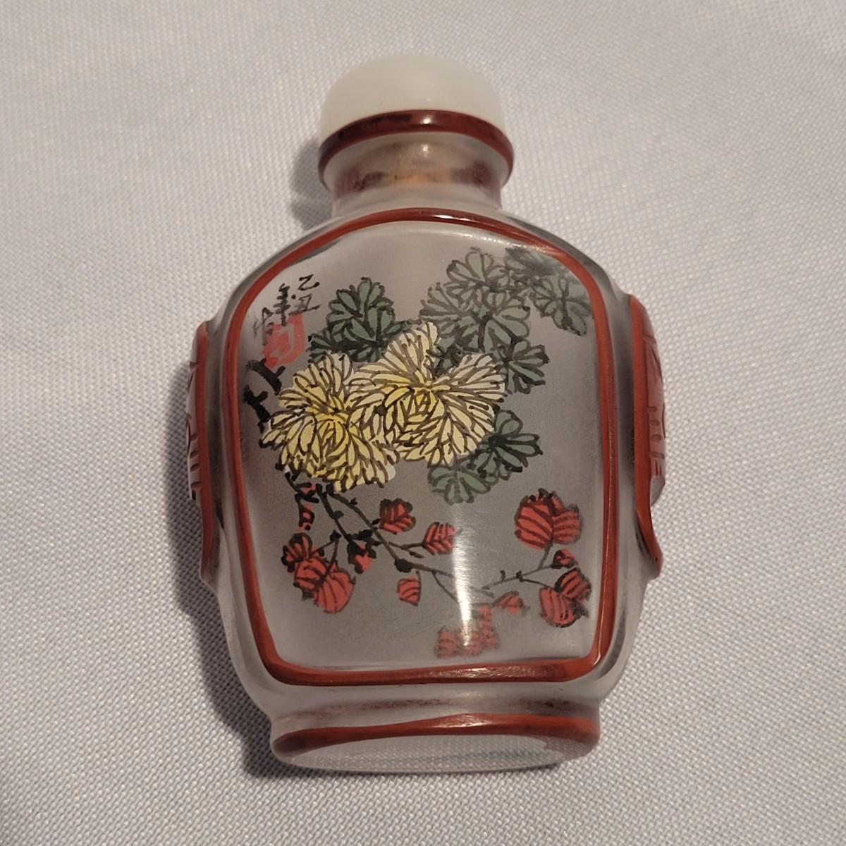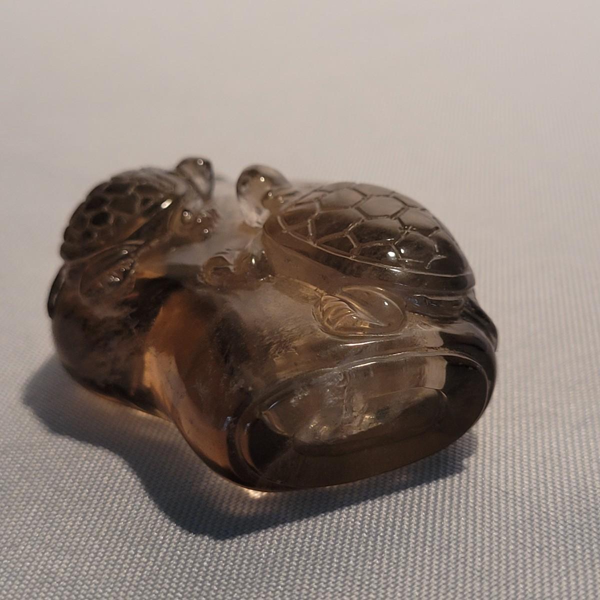 This lot includes six unique snuff bottles made from various materials. The most notable of the lot is the iridescent bottle that appears to be made of opal. It is slender and depicts a fish and lily pad. Its cap and scoop are intact and it is resting on a wooden platform. The rest of the bottles appear to be made from glass or resin and depict different animals and scenery. See photos for more detail on individual items. All bottles measure under 2" x 2" x 3.5"H.