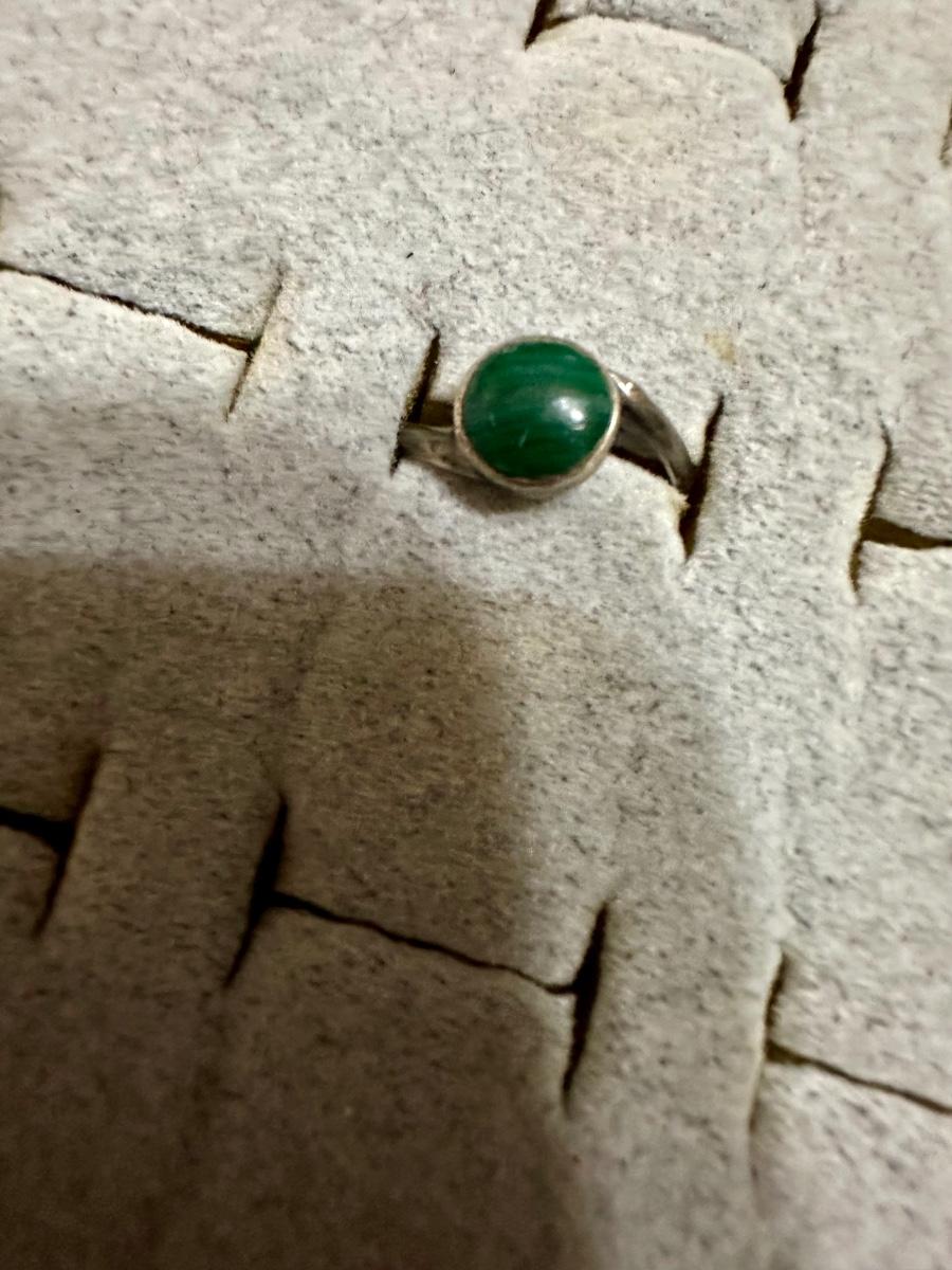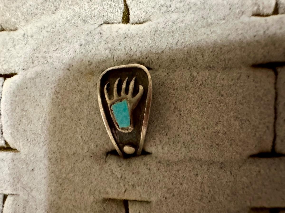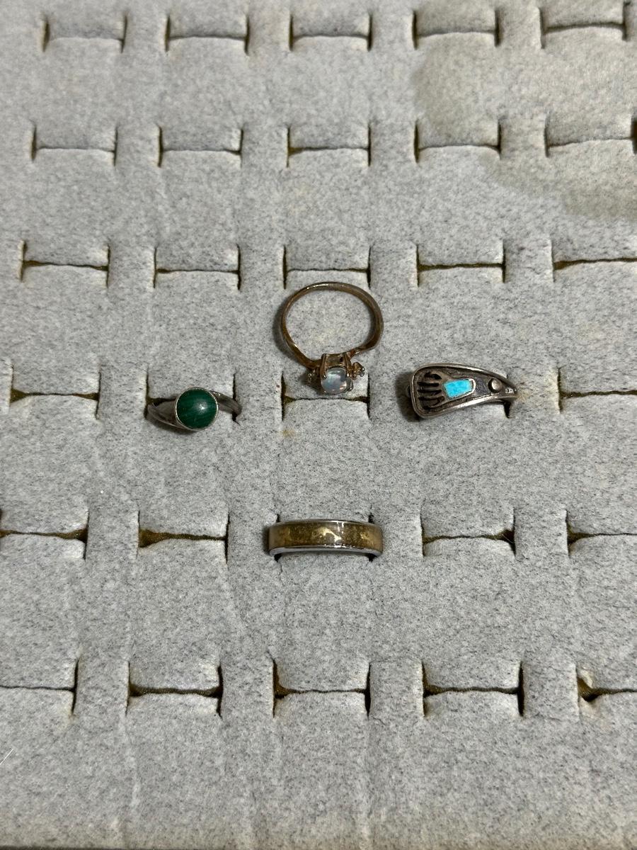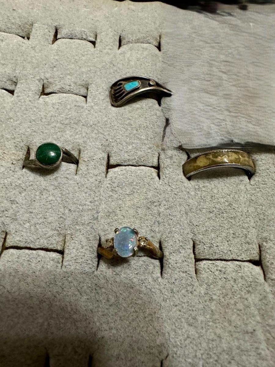OPAL COLORED STONE RING IS 18K HGE, BEAR CLAW RING, RING WITH DOLPHINS AROUND BAND, AND A RING WITH GREEN STONE