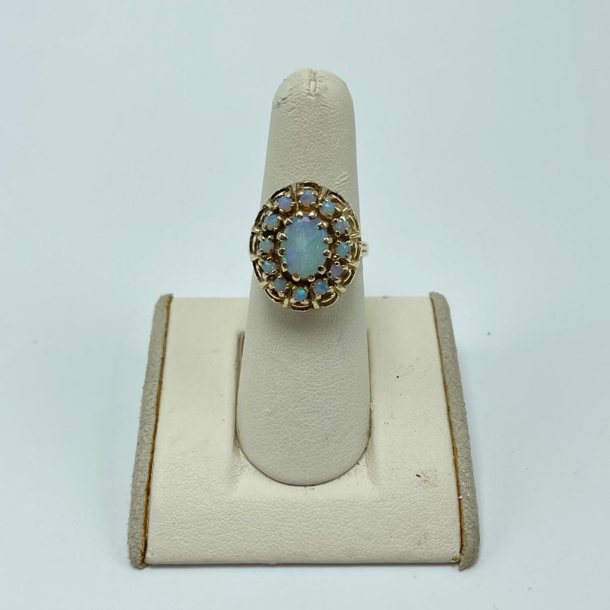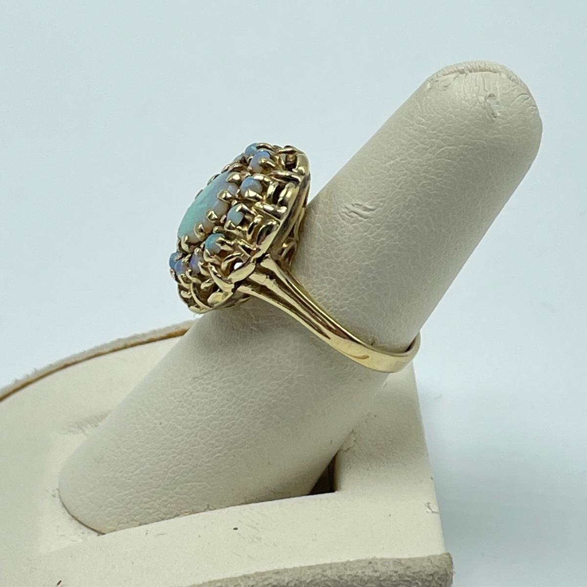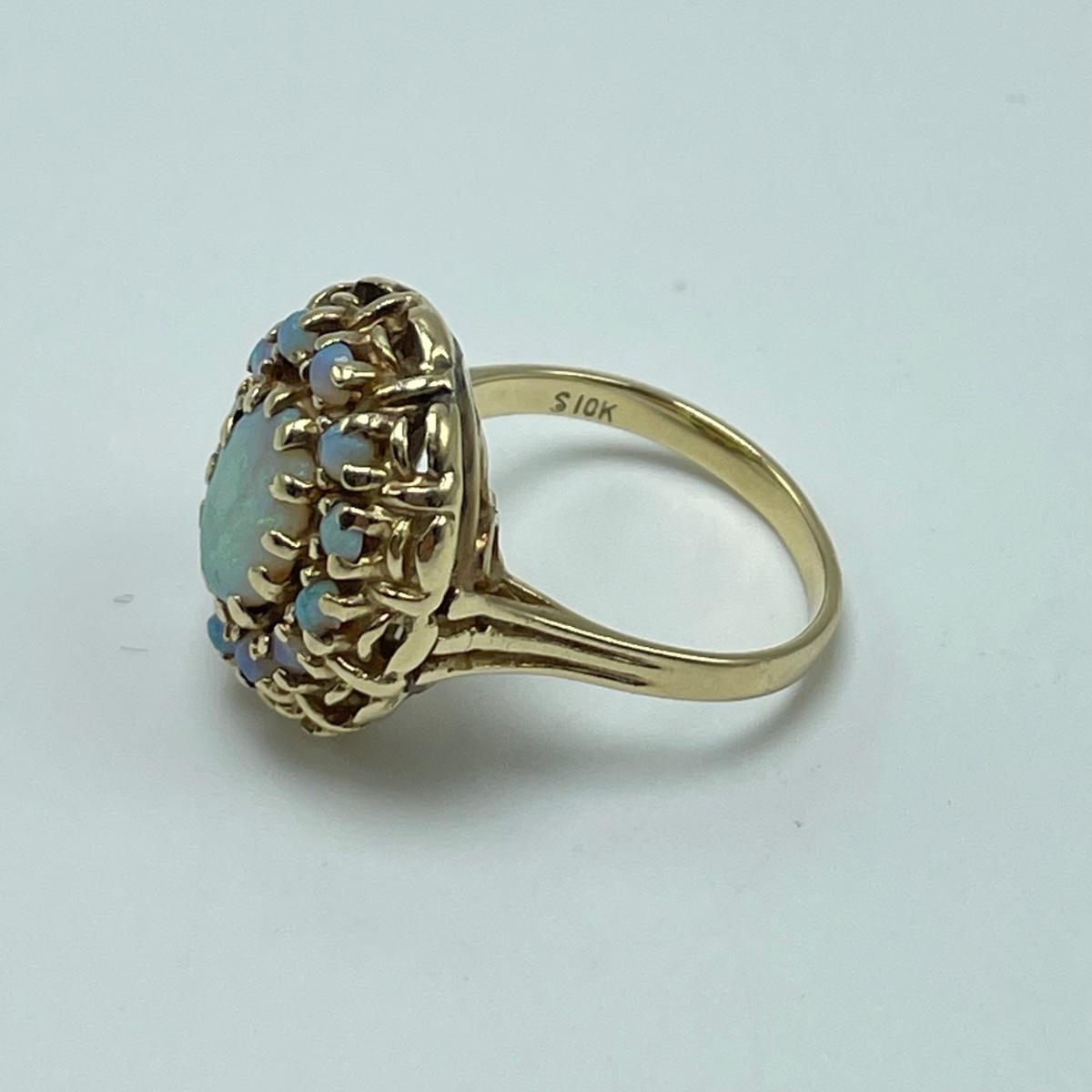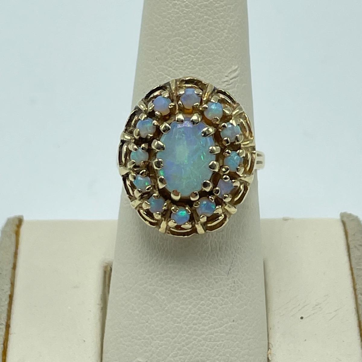 Iridescent opals on a 10K marked ring. Ring has a large center stone with 12 smaller matching stones surrounding on a sizable setting. Ring is approximately size 8. We have not verified the validity of the stones or metal. All sales are final. No returns or refunds. Please bid accordingly. See images. Shipping available.