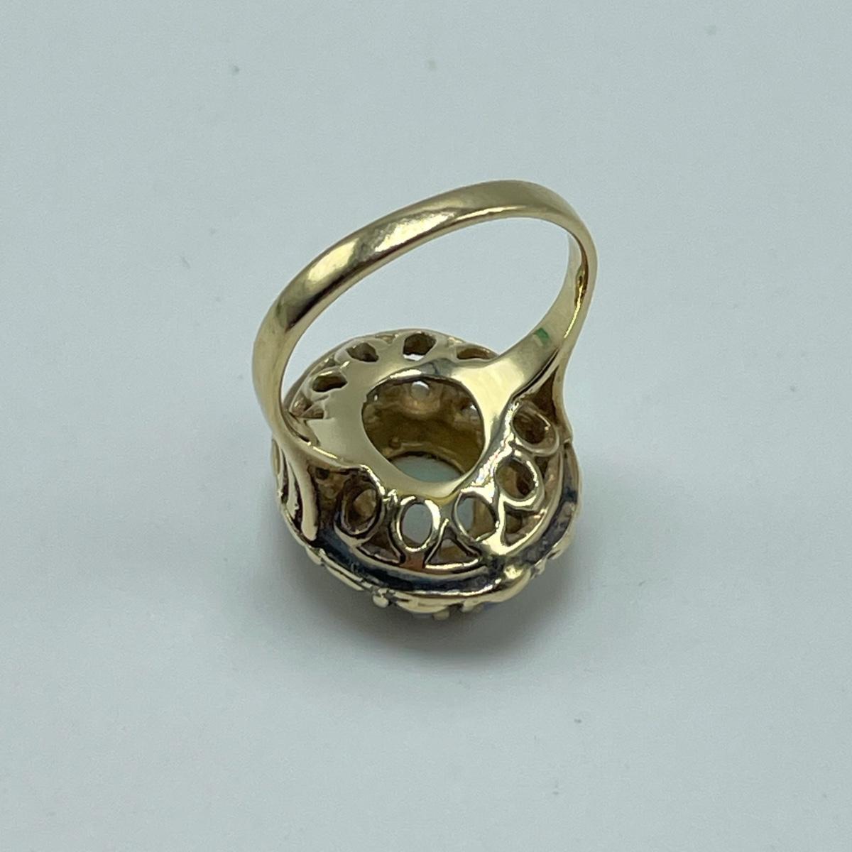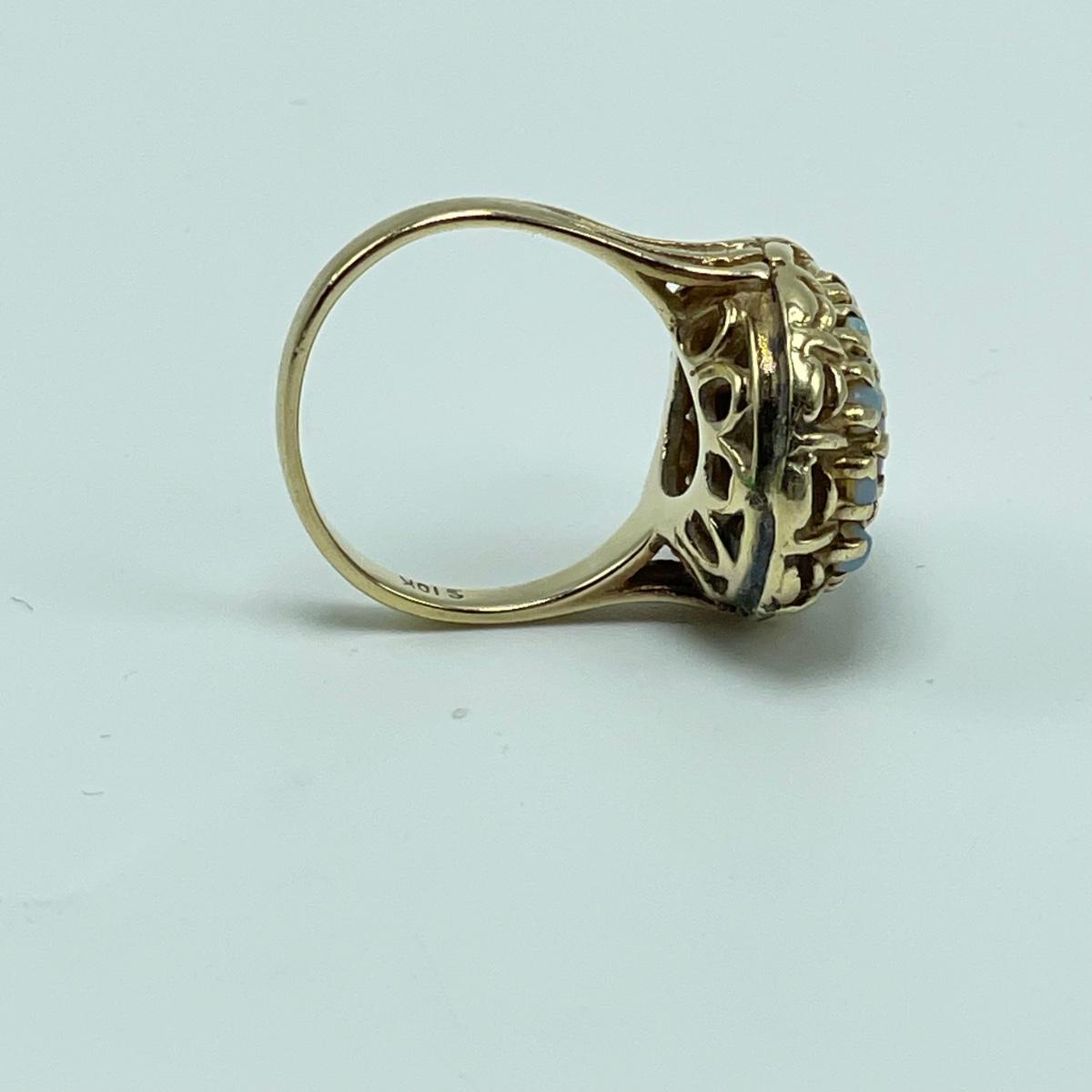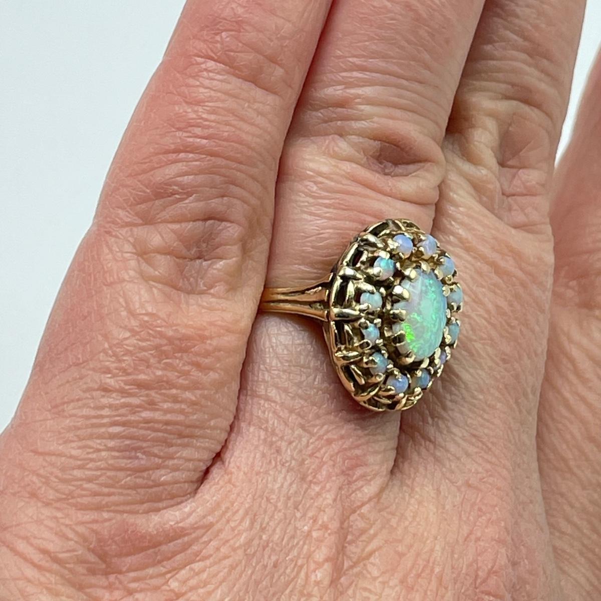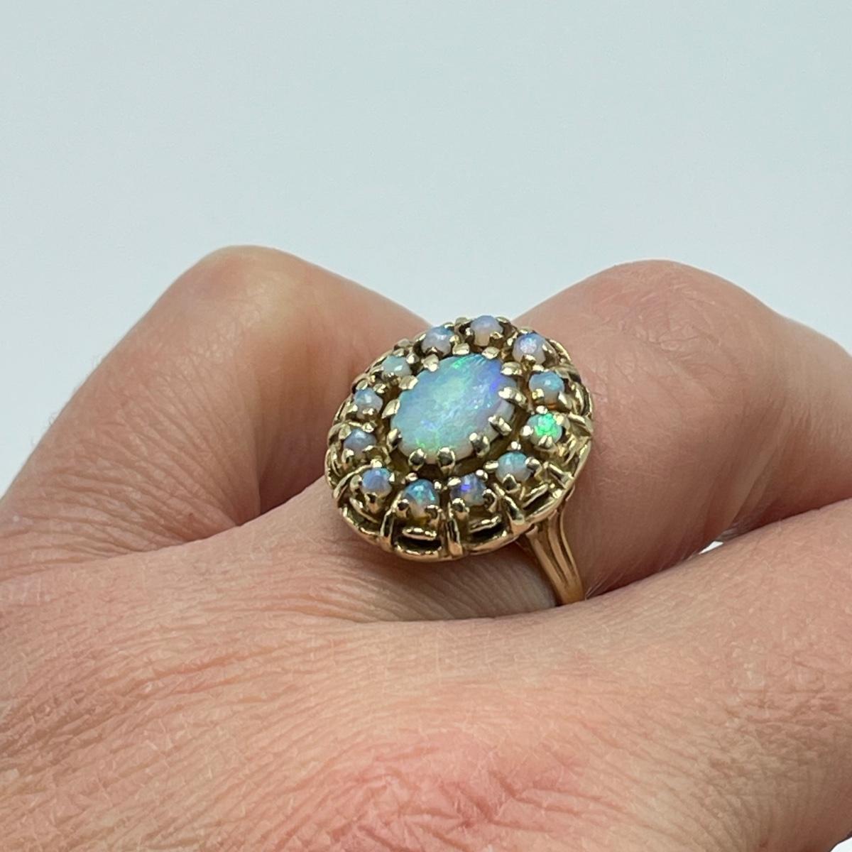 Iridescent opals on a 10K marked ring. Ring has a large center stone with 12 smaller matching stones surrounding on a sizable setting. Ring is approximately size 8. We have not verified the validity of the stones or metal. All sales are final. No returns or refunds. Please bid accordingly. See images. Shipping available.