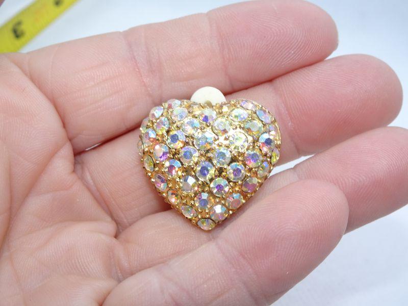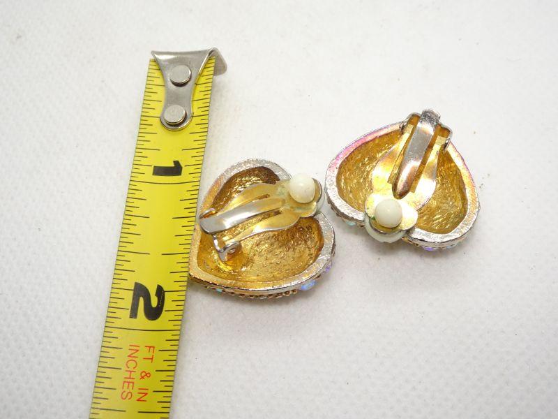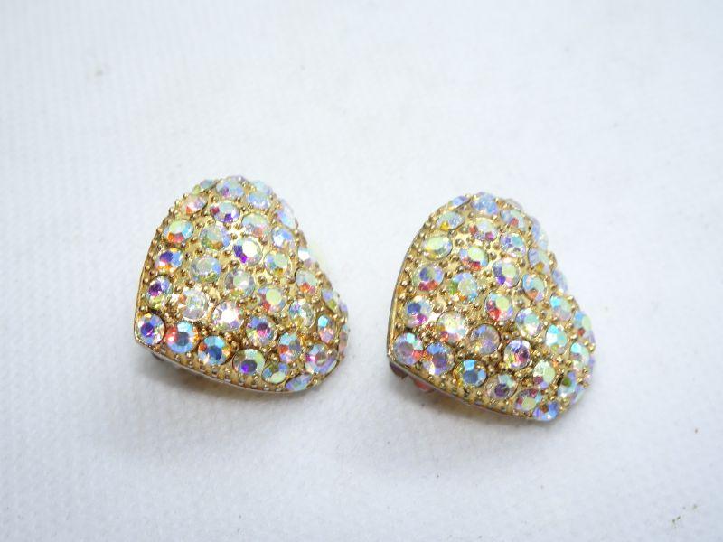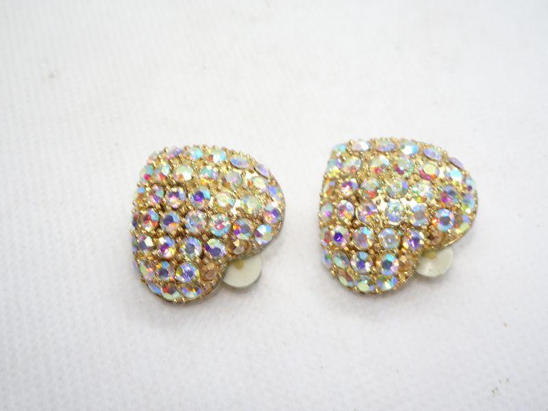 Opalescent Heart Rhinestone Gold Tone Clip Earrings
