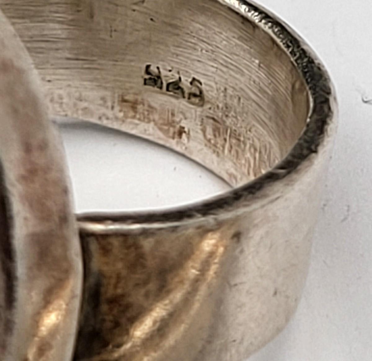 Hand crafted wide band oval ring and pendant. Ring size 9. Stone is .75" x 1" and band is 5mm wide. Pendant is 1" x 1.5". Good size bale for any type of chain. Nice patina on both pieces. Weighs total of 28.9 grams.