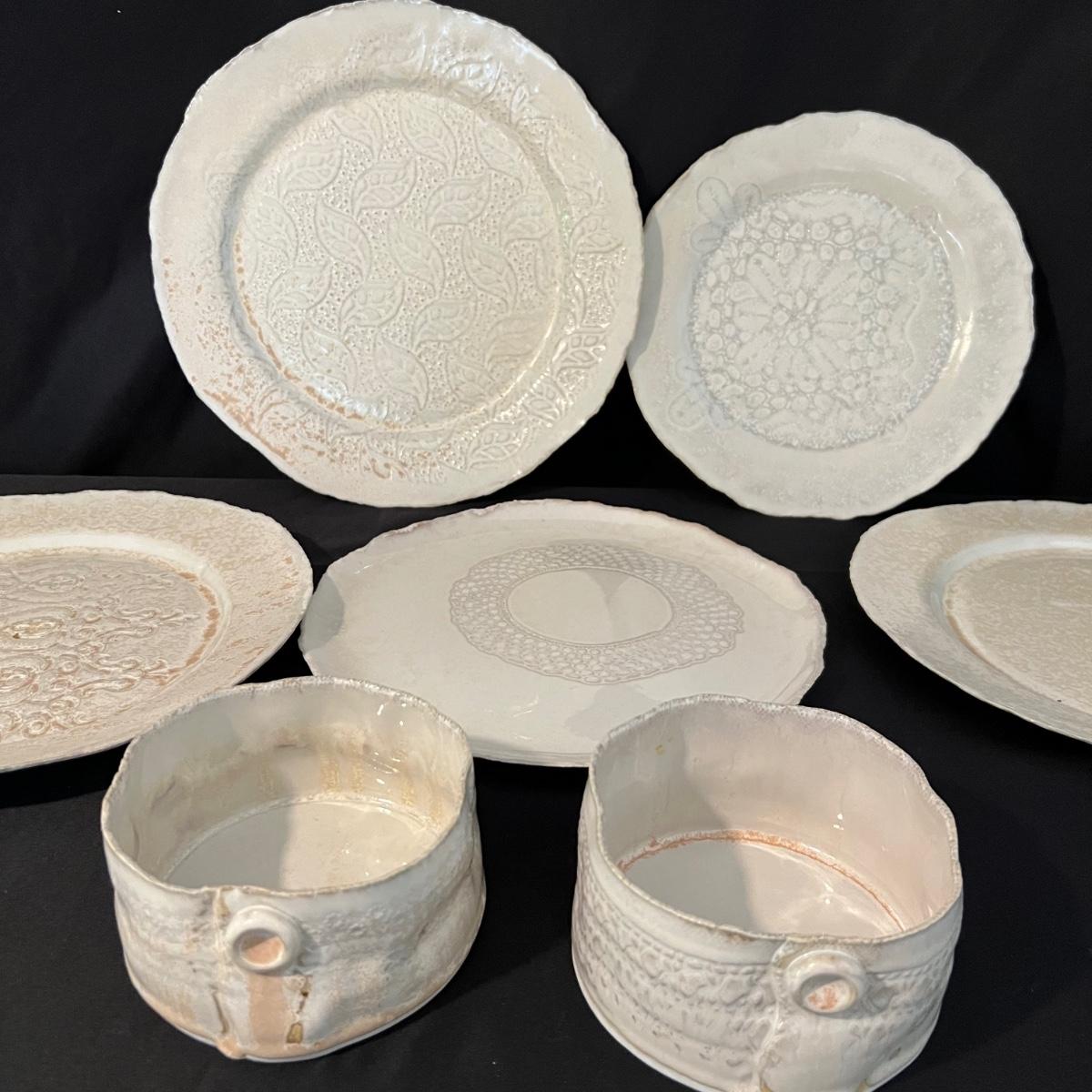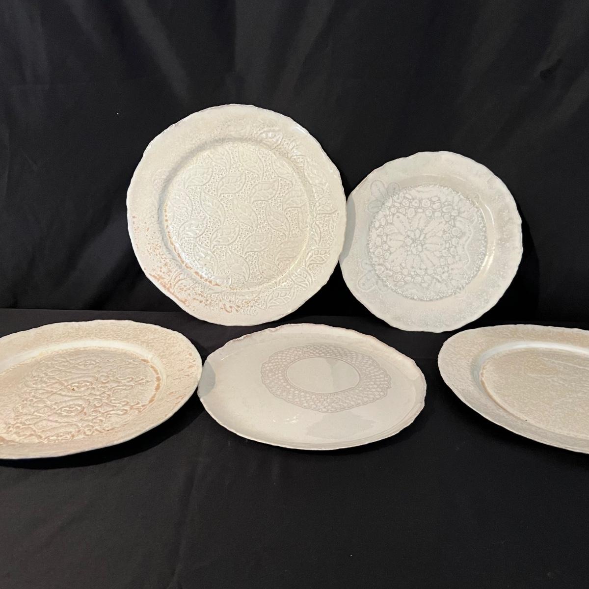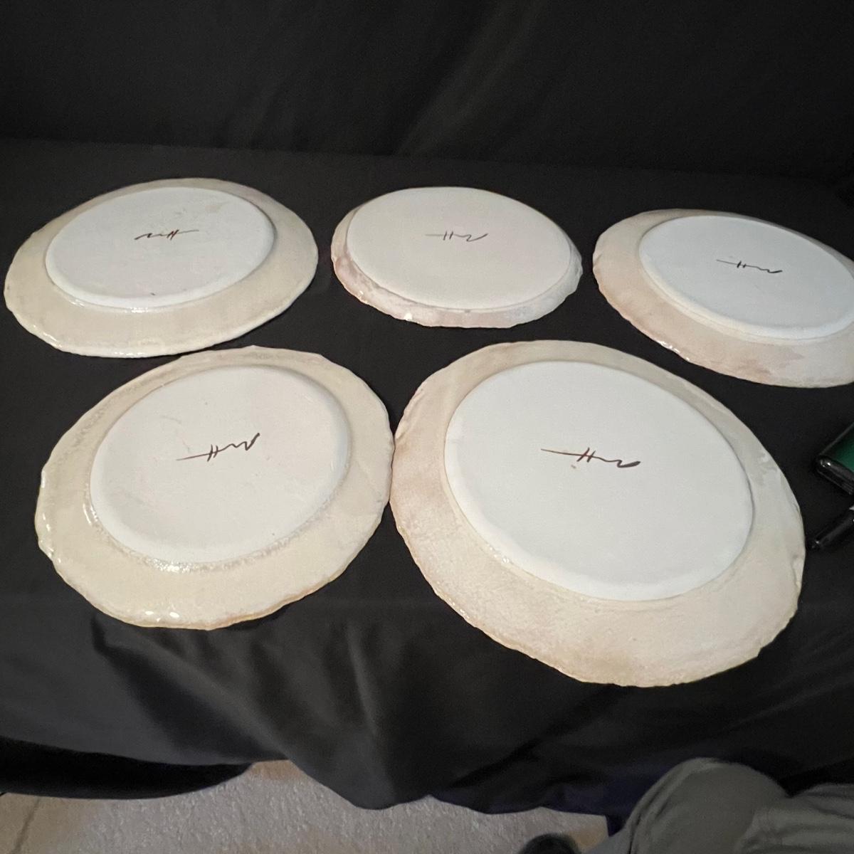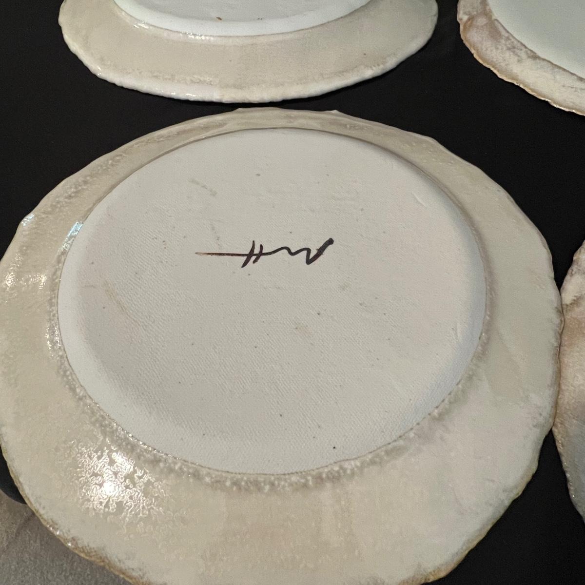 Five plates and two bowls make up this collection of delicate porcelain hand built pottery. All by the same potter with initials on each piece, see images. Each piece has unique texturing and all are very fine and delicate. Three of the five plates are dinner size at 11” D.
