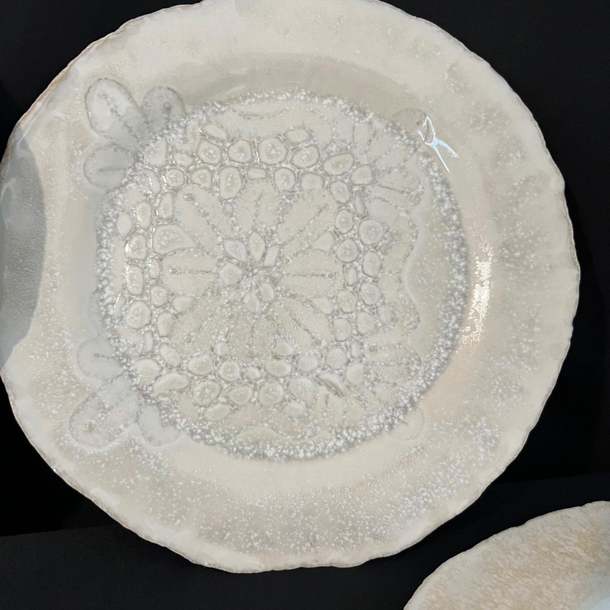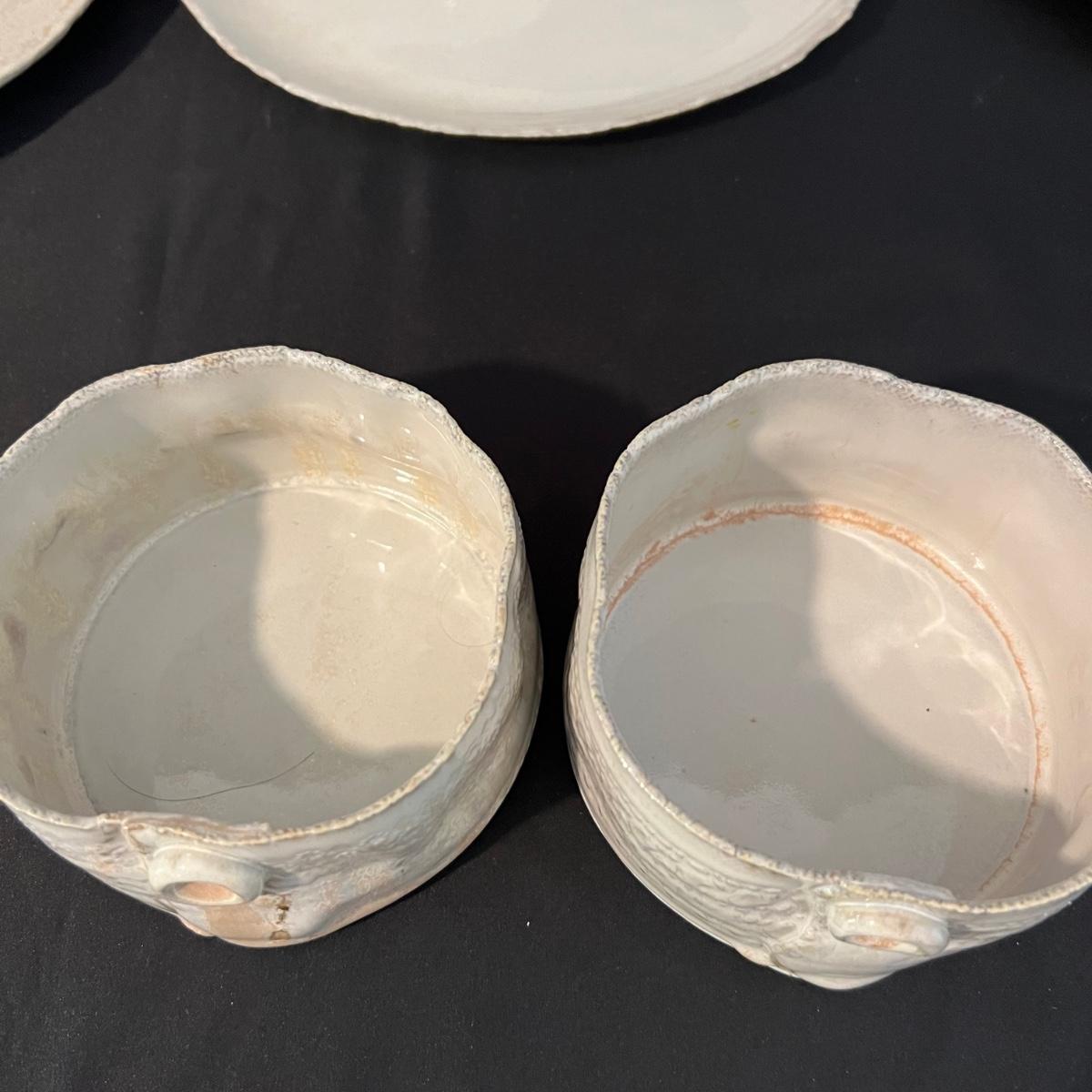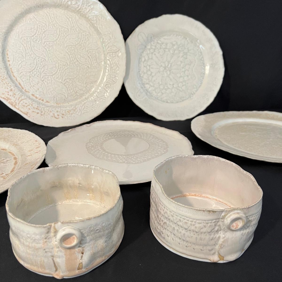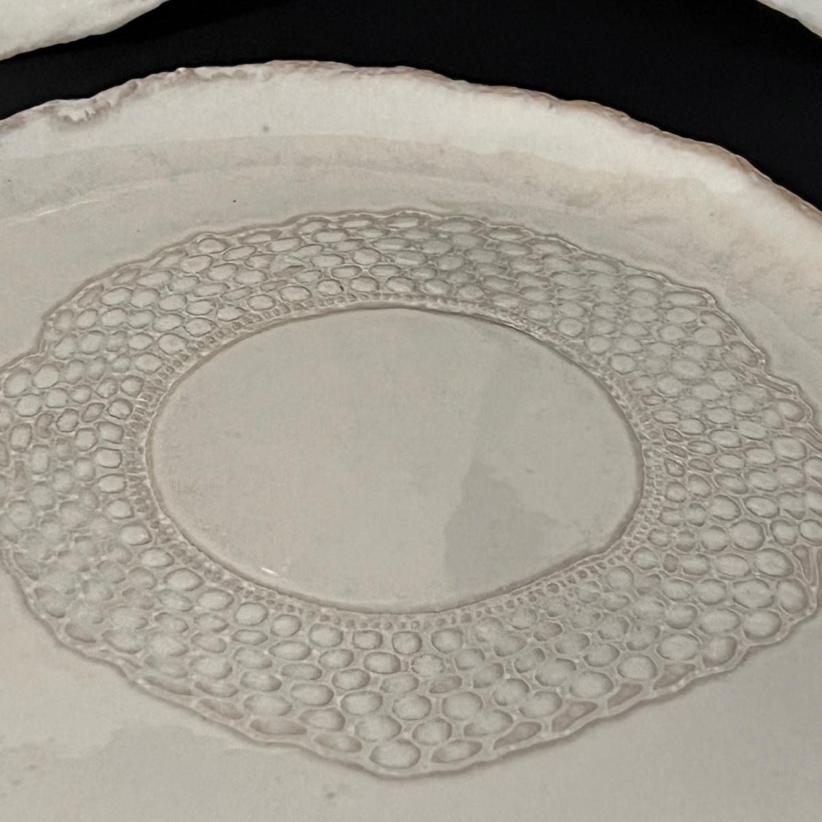 Five plates and two bowls make up this collection of delicate porcelain hand built pottery. All by the same potter with initials on each piece, see images. Each piece has unique texturing and all are very fine and delicate. Three of the five plates are dinner size at 11” D.