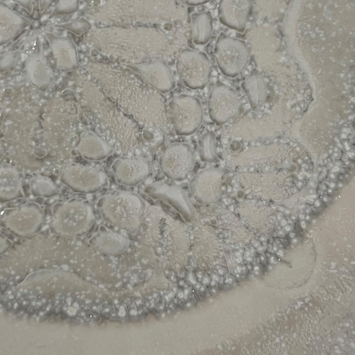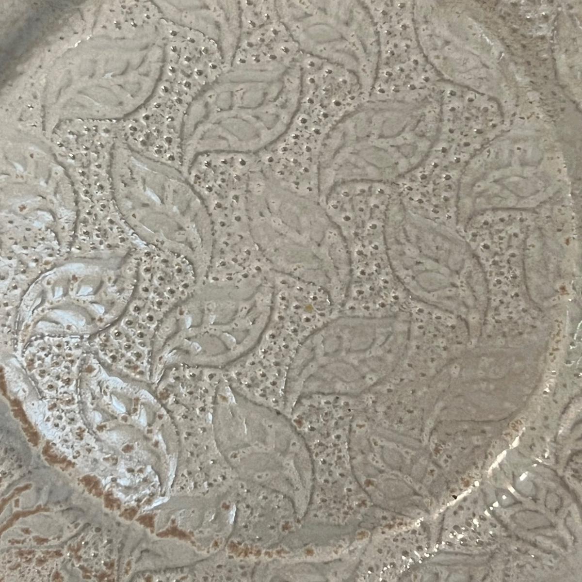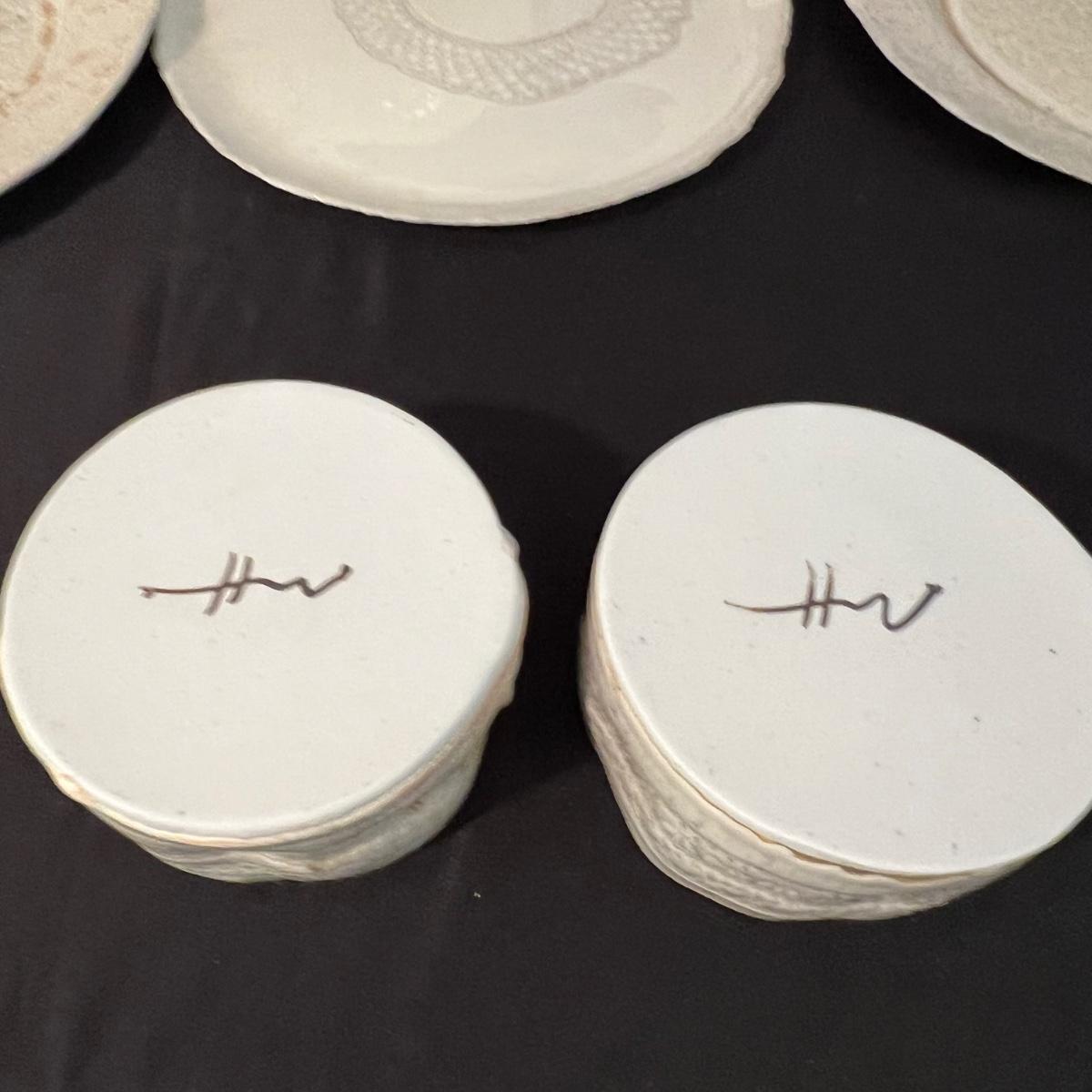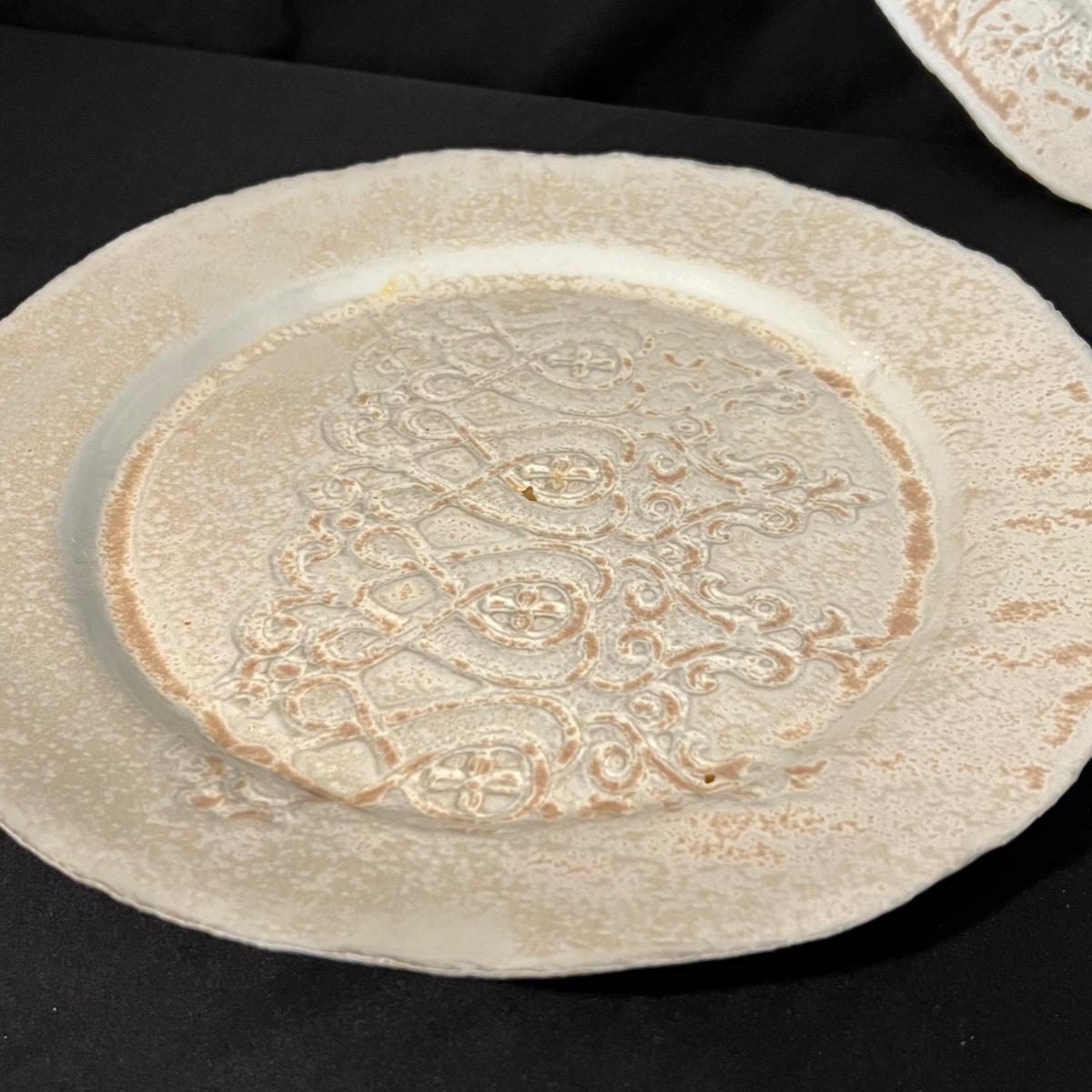 Five plates and two bowls make up this collection of delicate porcelain hand built pottery. All by the same potter with initials on each piece, see images. Each piece has unique texturing and all are very fine and delicate. Three of the five plates are dinner size at 11” D.