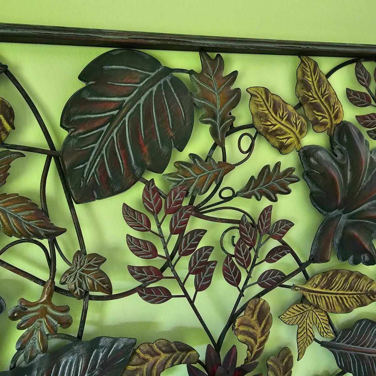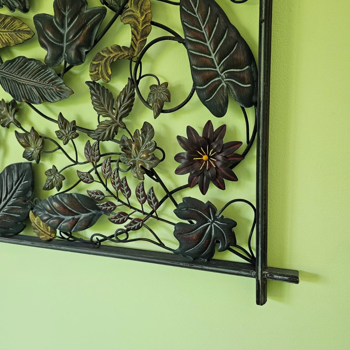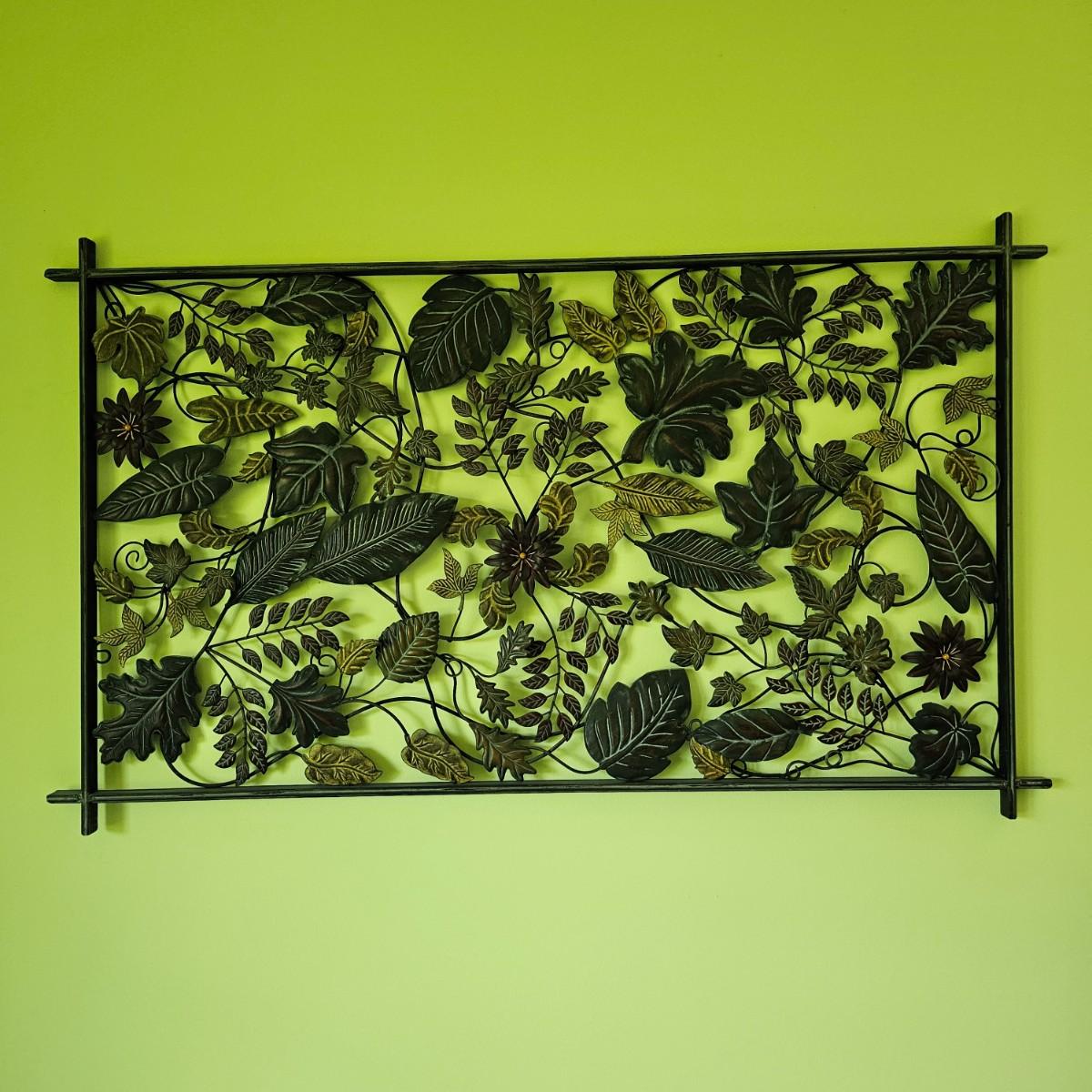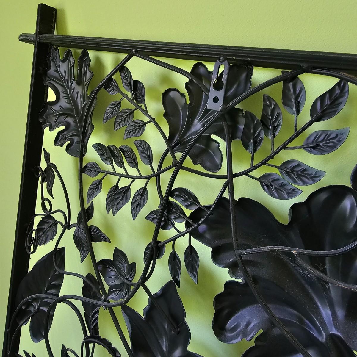 Decorative leaves and vines make up this 3D open artwork. Steel construction, piece measures 51" x 1.5" x 31"H, but can be hung vertical or horizontal with attached hooks. See photos for details. Local pickup only.
