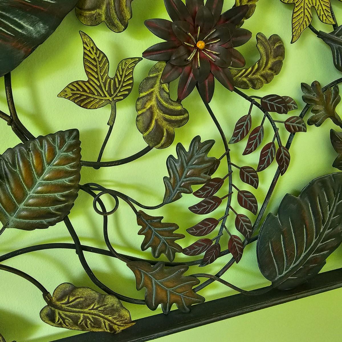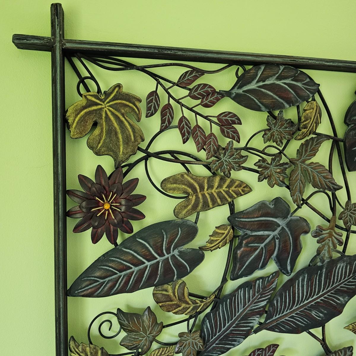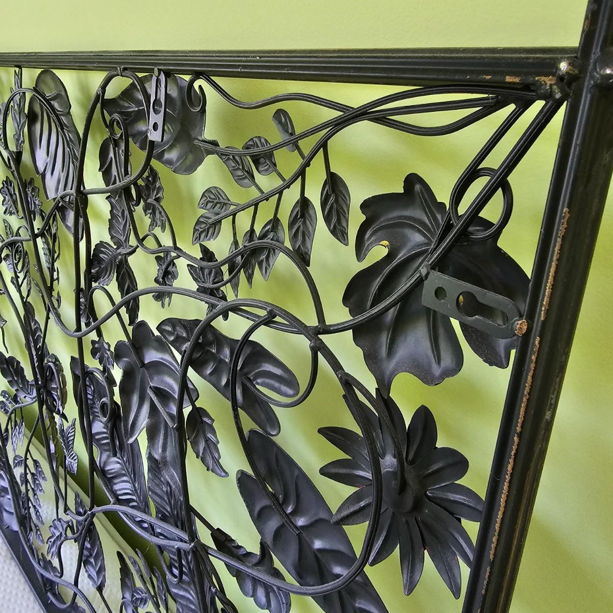 Decorative leaves and vines make up this 3D open artwork. Steel construction, piece measures 51" x 1.5" x 31"H, but can be hung vertical or horizontal with attached hooks. See photos for details. Local pickup only.