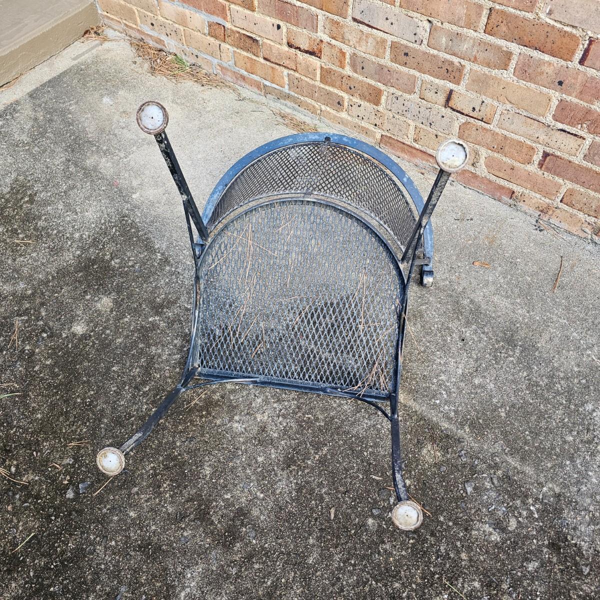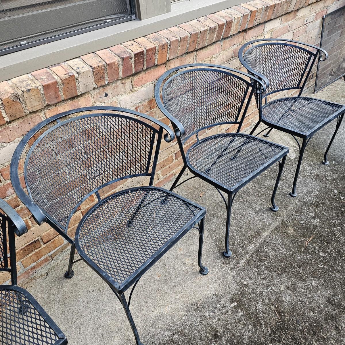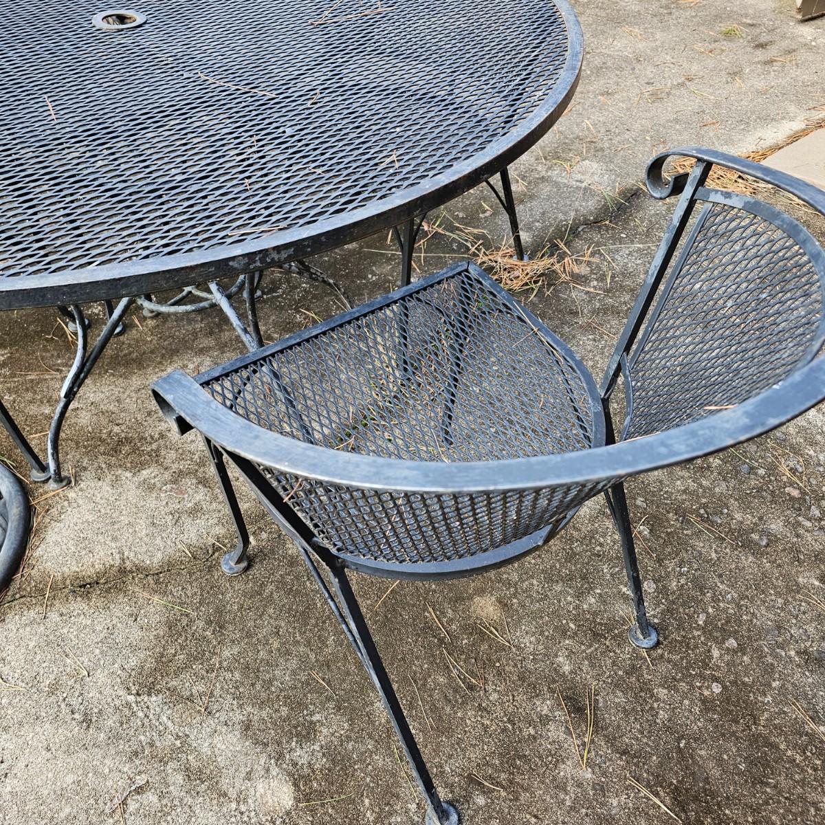 Criss cross open mesh top and chairs with this patio set. Table has open center for umbrella (not included) and measures 48"D x 28"H. Four chairs have curved backs that form arms and are 24.5" x 24" x 29"H, have 16" seat height. Umbrella stand has open weave pattern, measures 19"D x 7"H, has set screw to hold umbrella base. Some rust and wear on all pieces. See photos for details. Local pickup only.